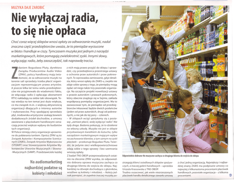 MUZYKA DAJE ZAROBIC Nie wylaczaj radia, to sie nie oplaca Choc coraz wiecej sklepów wnosi oplaty za odtwarzanie muzyki, nadal znaczna czesc przedsiebiorców uwaza, ze to pieniqdze wyrzucone w bloto i handluje w ciszy. Tymczasem muzyka jest jednym z narzedzi marketingowych, które pomagajq zwielokrotnic zyski. Innymi slowy, wylqczajqc radio, zeby zaoszczedzic, tak naprawde tracisz. Zwiazku Producentów Audio Video (ZPAV), polscy handlowcy maja swiadaniem Pluty, dyrektora domosc, Boguslawa ze za odtwarzanie muzyki na terenie sali sprzedazy trzeba placic organizacjom reprezentujacym prawa artystów. A jeszcze kilka lat temu wielu przedsiebiorców nie przyjmowalo do wiadomosci faktu, ze wlaczajac radio (i oplacajac abonament RTV) nakladaja na siebie taki obowiazek. Teraz wiedza na ten temat jest duzo wieksza, co ma zwiazek m.in. z wieksza aktywnoscia organizacji dbajacych o interesy autorów i wykonawców. Przy spadajacej sprzedazy plyt, srodowiska artystyczne szukaja bowiem dodatkowych zródel dochodów, a umowy zawierane z placówkami handlowymi oznaczaja przeciez wieksze wplywy do budzetów tych organizacji. W Polsce istnieja cztery organizacje uprawnione do pobierania tantiem. Oprócz ZPAVsa to: Zwiazek Autorów i Kompozytorów Scenicznych (ZAiKS),Zwiazek Artystów Wykonawców (STOART)oraz Stowarzyszenie Artystów Wykonawców Utworów Muzycznych i Slowno-Muzycznych (SAWP).Przedstawiciele kazdej Z Na audiomarketing najbardziej podatne sa kobiety i mlodziez z nich maja prawo przyjsc do sklepu i sprawdzic, czy przedsiebiorca przestrzega ustawy o ochronie praw autorskich i praw pokrewnych. To wprowadza zamieszanie, gdyz detalista, który wnosi oplaty do ZAIKS-u,zwykle nie zdaje sobie sprawy z tego, ze pieniedzy moga zadac od niego takze trzy pozostale organizacje. Na szczescie projekt nowelizacji ustawy o prawie autorskim i prawach pokrewnych, który obecnie znajduje sie w Sejmie, zaklada wspólprace pomiedzy organizacjami. Ma to zaowocowac tym, ze pieniadze od przedsiebiorców inkasowac bedzie dwóch poslanców (jeden od praw autorskich, drugi od pokrewnych), a nie jak do tej pory - czterech. - W sklepach wciqz spotykamy sie z postawq: "zamiast placic, wole wylqczyc radio': Nie tedy droga. Badania pokazujq, ze to dzialanie na wlasnq szkode. Muzyka nie jest w sklepie przyslowiowym kwiatkiem do kozucha, tylko narzedziem marketingowym majqcym wplyw na zachowanie klientów, a tym samym na zyski placówki - przekonuje Boguslaw Pluta. Twierdzi, ze jedynie sieci wielkopowierzchniowe zdaja sobie z tego sprawe i bez szemrania wnosza oplaty. Z badan TNS OBOP przeprowadzonych ostatnio na zlecenie ZPAV wynika, ze odpowiednio dobrana oprawa muzyczna zacheca co drugiego klienta do wejscia do sklepu. Najbardziej na dzwieki dochodzace z glosników, wrazliwe sa kobiety i mlodziez. - Nalezy jednak pamietac, ze zupelnie inaczej muzyke po- Odpowiednio dobrane tlo muzyczne zacheca co drugiego klienta do wejscia do sklepu strzegajq klienci osiedlowych sklepów spozywczych, a inaczej galerii handlowych - uprzedza Urszula Krassowska z TNS OBOP. Trudno oszacowac, jak wiele niezrzeszonych placówek handlu detalicznego zawarlo umowe z choc jedna organizacja. Najwiekszy i najbardziej znany ZAiKS ma podpisane umowy co najwyzej z kilkunastoma procentami placówek handlowych, pozostale organizacje - z kilkoma procentami. ~ :> Wiadomo za to, ze liczba podmiotów wnoszacych takie oplaty z roku na rok rosnie. Z raportu ZPAVwynika, ze w ciagu ostatnich pieciu lat blisko osmiokrotnie zwiekszyla sie liczba podmiotów (nie tylko sklepów, ale takze pubów, salonów urody itp.), które zawarly umowe z tym zwiazkiem. W minionym roku placilo 8500 firm dzialajacych w blisko 15000 lokali, a wysokosc wplywów wyniosla 12 mln zl. Wedlug prognoz, w tym roku do ZPAV wplynie z tego tytulu 16 mln zl (przy 13 500 umów i objetych nimi 20000 lokali). Tymczasem w liczacej 5,5 mln mieszkanców Danii, az 66 500 firm uiszcza odpowiednie oplaty. Trzeba tez pamietac o sankcjach: gdy ktos nie placi za odtwarzanie muzyki, grozi mu mandat, a nawet kara pozbawienia wolnosci do dwóch lat. Anna Krezlewicz