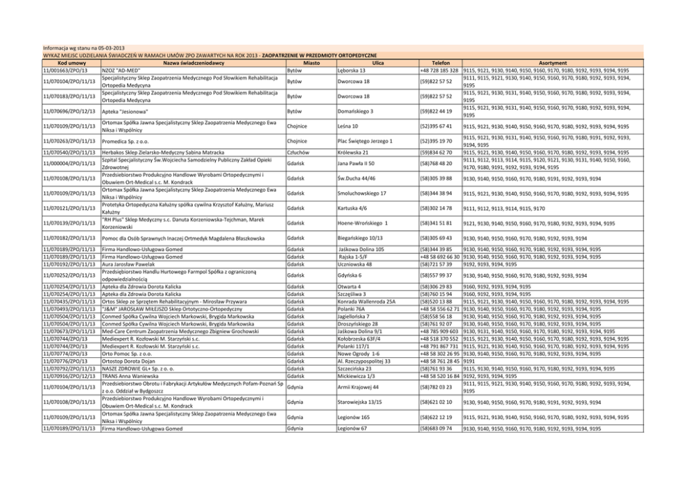 Informacja wg stanu na 05-03-2013 WYKAZ MIEJSC UDZIELANIA ŚWIADCZEŃ W RAMACH UMÓW ZPO ZAWARTYCH NA ROK 2013 - ZAOPATRZENIE W PRZEDMIOTY ORTOPEDYCZNE Kod umowy Nazwa świadczeniodawcy Miasto Ulica 11/001663/ZPO/13 Bytów Lęborska 13 NZOZ "AD-MED" Specjalistyczny Sklep Zaopatrzenia Medycznego Pod Słowikiem Rehabilitacja 11/070104/ZPO/11/13 Bytów Dworcowa 18 Ortopedia Medycyna Specjalistyczny Sklep Zaopatrzenia Medycznego Pod Słowikiem Rehabilitacja 11/070183/ZPO/11/13 Bytów Dworcowa 18 Ortopedia Medycyna Telefon Asortyment +48 728 185 328 9115, 9121, 9130, 9140, 9150, 9160, 9170, 9180, 9192, 9193, 9194, 9195 9111, 9115, 9121, 9130, 9140, 9150, 9160, 9170, 9180, 9192, 9193, 9194, (59)822 57 52 9195 9115, 9121, 9130, 9131, 9140, 9150, 9160, 9170, 9180, 9192, 9193, 9194, (59)822 57 52 9195 9115, 9121, 9130, 9131, 9140, 9150, 9160, 9170, 9180, 9192, 9193, 9194, (59)822 44 19 9195 11/070696/ZPO/12/13 Apteka "Jesionowa" Bytów Domańskiego 3 11/070109/ZPO/11/13 Ortomax Spółka Jawna Specjalistyczny Sklep Zaopatrzenia Medycznego Ewa Niksa i Wspólnicy Chojnice Leśna 10 (52)395 67 41 11/070263/ZPO/11/13 Promedica Sp. z o.o. Chojnice Plac Świętego Jerzego 1 (52)395 19 70 11/070540/ZPO/11/13 Herbakos Sklep Zielarsko-Medyczny Sabina Matracka Szpital Specjalistyczny Św.Wojciecha Samodzielny Publiczny Zakład Opieki Zdrowotnej Przedsiebiorstwo Produkcyjno Handlowe Wyrobami Ortopedycznymi i Obuwiem Ort-Medical s.c. M. Kondrack Ortomax Spółka Jawna Specjalistyczny Sklep Zaopatrzenia Medycznego Ewa Niksa i Wspólnicy Protetyka Ortopedyczna Kałużny spółka cywilna Krzysztof Kałużny, Mariusz Kałużny "RH Plus" Sklep Medyczny s.c. Danuta Korzeniowska-Tejchman, Marek Korzeniowski Człuchów Królewska 21 (59)834 62 70 Gdańsk Jana Pawła II 50 (58)768 48 20 Gdańsk Św.Ducha 44/46 (58)305 39 88 9130, 9140, 9150, 9160, 9170, 9180, 9191, 9192, 9193, 9194 Gdańsk Smoluchowskiego 17 (58)344 38 94 9115, 9121, 9130, 9140, 9150, 9160, 9170, 9180, 9192, 9193, 9194, 9195 Gdańsk Kartuska 4/6 (58)302 14 78 9111, 9112, 9113, 9114, 9115, 9170 Gdańsk Hoene-Wrońskiego 1 (58)341 51 81 9121, 9130, 9140, 9150, 9160, 9170, 9180, 9192, 9193, 9194, 9195 11/070182/ZPO/11/13 Pomoc dla Osób Sprawnych Inaczej Ortmedyk Magdalena Błaszkowska Gdańsk Biegańskiego 10/13 (58)305 69 43 9130, 9140, 9150, 9160, 9170, 9180, 9192, 9193, 9194 11/070189/ZPO/11/13 11/070189/ZPO/11/13 11/070192/ZPO/11/13 Firma Handlowo-Usługowa Gomed Firma Handlowo-Usługowa Gomed Aura Jarosław Pawelak Przedsiębiorstwo Handlu Hurtowego Farmpol Spółka z ograniczoną odpowiedzialnością Apteka dla Zdrowia Dorota Kalicka Apteka dla Zdrowia Dorota Kalicka Ortos Sklep ze Sprzętem Rehabilitacyjnym - Mirosław Przywara "J&M" JAROSŁAW MIŁEJSZO Sklep Ortotyczno-Ortopedyczny Conmed Spółka Cywilna Wojciech Markowski, Brygida Markowska Conmed Spółka Cywilna Wojciech Markowski, Brygida Markowska Med-Care Centrum Zaopatrzenia Medycznego Zbigniew Grochowski Mediexpert R. Kozłowski M. Starzyński s.c. Mediexpert R. Kozłowski M. Starzyński s.c. Orto Pomoc Sp. z o.o. Ortostop Dorota Dojan NASZE ZDROWIE GL+ Sp. z o. o. TRANS Anna Waniewska Przedsiebiorstwo Obrotu i Fabrykacji Artykułów Medycznych Pofam-Poznań Sp z o.o. Oddział w Bydgoszcz Przedsiebiorstwo Produkcyjno Handlowe Wyrobami Ortopedycznymi i Obuwiem Ort-Medical s.c. M. Kondrack Ortomax Spółka Jawna Specjalistyczny Sklep Zaopatrzenia Medycznego Ewa Niksa i Wspólnicy Firma Handlowo-Usługowa Gomed Gdańsk Gdańsk Gdańsk Jaśkowa Dolina 105 Rajska 1-5/F Uczniowska 48 (58)344 39 85 9130, 9140, 9150, 9160, 9170, 9180, 9192, 9193, 9194, 9195 +48 58 692 66 30 9130, 9140, 9150, 9160, 9170, 9180, 9192, 9193, 9194, 9195 (58)721 57 39 9192, 9193, 9194, 9195 Gdańsk Gdyńska 6 (58)557 99 37 9130, 9140, 9150, 9160, 9170, 9180, 9192, 9193, 9194 Gdańsk Gdańsk Gdańsk Gdańsk Gdańsk Gdańsk Gdańsk Gdańsk Gdańsk Gdańsk Gdańsk Gdańsk Gdańsk Otwarta 4 Szczęśliwa 3 Konrada Wallenroda 25A Polanki 76A Jagiellońska 7 Droszyńskiego 28 Jaśkowa Dolina 9/1 Kołobrzeska 63F/4 Polanki 117/1 Nowe Ogrody 1-6 Al. Rzeczypospolitej 33 Szczecińska 23 Mickiewicza 1/3 (58)306 29 83 (58)760 15 94 (58)520 13 88 +48 58 556 62 71 (58)558 56 18 (58)761 92 07 +48 785 909 603 +48 518 370 552 +48 791 867 731 +48 58 302 26 95 +48 58 761 28 45 (58)761 93 36 +48 58 520 16 84 Gdynia Armii Krajowej 44 (58)782 03 23 9160, 9192, 9193, 9194, 9195 9160, 9192, 9193, 9194, 9195 9115, 9121, 9130, 9140, 9150, 9160, 9170, 9180, 9192, 9193, 9194, 9195 9130, 9140, 9150, 9160, 9170, 9180, 9192, 9193, 9194, 9195 9130, 9140, 9150, 9160, 9170, 9180, 9192, 9193, 9194, 9195 9130, 9140, 9150, 9160, 9170, 9180, 9192, 9193, 9194, 9195 9130, 9131, 9140, 9150, 9160, 9170, 9180, 9192, 9193, 9194, 9195 9115, 9121, 9130, 9140, 9150, 9160, 9170, 9180, 9192, 9193, 9194, 9195 9115, 9121, 9130, 9140, 9150, 9160, 9170, 9180, 9192, 9193, 9194, 9195 9130, 9140, 9150, 9160, 9170, 9180, 9192, 9193, 9194, 9195 9191 9115, 9130, 9140, 9150, 9160, 9170, 9180, 9192, 9193, 9194, 9195 9192, 9193, 9194, 9195 9111, 9115, 9121, 9130, 9140, 9150, 9160, 9170, 9180, 9192, 9193, 9194, 9195 Gdynia Starowiejska 13/15 (58)621 02 10 9130, 9140, 9150, 9160, 9170, 9180, 9191, 9192, 9193, 9194 Gdynia Legionów 165 (58)622 12 19 9115, 9121, 9130, 9140, 9150, 9160, 9170, 9180, 9192, 9193, 9194, 9195 Gdynia Legionów 67 (58)683 09 74 9130, 9140, 9150, 9160, 9170, 9180, 9192, 9193, 9194, 9195 11/000004/ZPO/11/13 11/070108/ZPO/11/13 11/070109/ZPO/11/13 11/070121/ZPO/11/13 11/070139/ZPO/11/13 11/070252/ZPO/11/13 11/070254/ZPO/11/13 11/070254/ZPO/11/13 11/070435/ZPO/11/13 11/070493/ZPO/11/13 11/070504/ZPO/11/13 11/070504/ZPO/11/13 11/070673/ZPO/11/13 11/070744/ZPO/13 11/070744/ZPO/13 11/070774/ZPO/13 11/070776/ZPO/13 11/070792/ZPO/11/13 11/070916/ZPO/12/13 11/070104/ZPO/11/13 11/070108/ZPO/11/13 11/070109/ZPO/11/13 11/070189/ZPO/11/13 9115, 9121, 9130, 9140, 9150, 9160, 9170, 9180, 9192, 9193, 9194, 9195 9115, 9121, 9130, 9131, 9140, 9150, 9160, 9170, 9180, 9191, 919