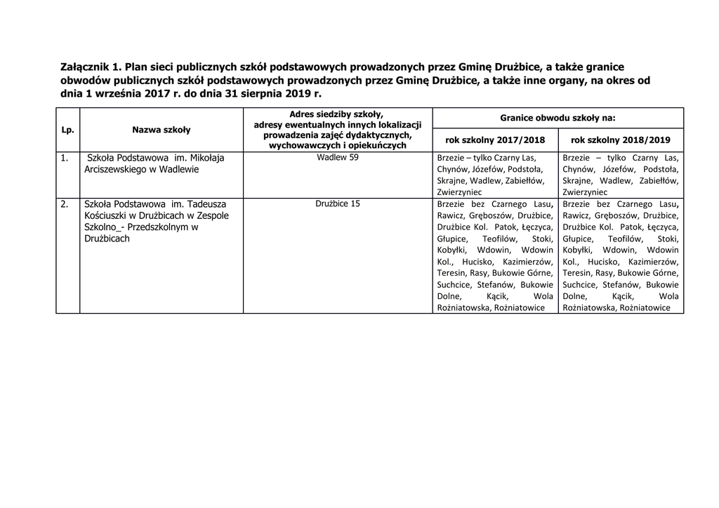 Załącznik 1. Plan sieci publicznych szkół podstawowych prowadzonych przez Gminę Drużbice, a także granice obwodów publicznych szkół podstawowych prowadzonych przez Gminę Drużbice, a także inne organy, na okres od dnia 1 września 2017 r. do dnia 31 sierpnia 2019 r. Lp. Nazwa szkoły 1. Szkoła Podstawowa im. Mikołaja Arciszewskiego w Wadlewie 2. Szkoła Podstawowa im. Tadeusza Kościuszki w Drużbicach w Zespole Szkolno_- Przedszkolnym w Drużbicach Adres siedziby szkoły, adresy ewentualnych innych lokalizacji prowadzenia zajęć dydaktycznych, wychowawczych i opiekuńczych Wadlew 59 Drużbice 15 Granice obwodu szkoły na: rok szkolny 2017/2018 rok szkolny 2018/2019 Brzezie – tylko Czarny Las, Chynów, Józefów, Podstoła, Skrajne, Wadlew, Zabiełłów, Zwierzyniec Brzezie bez Czarnego Lasu, Rawicz, Gręboszów, Drużbice, Drużbice Kol. Patok, Łęczyca, Głupice, Teofilów, Stoki, Kobyłki, Wdowin, Wdowin Kol., Hucisko, Kazimierzów, Teresin, Rasy, Bukowie Górne, Suchcice, Stefanów, Bukowie Dolne, Kącik, Wola Rożniatowska, Rożniatowice Brzezie – tylko Czarny Las, Chynów, Józefów, Podstoła, Skrajne, Wadlew, Zabiełłów, Zwierzyniec Brzezie bez Czarnego Lasu, Rawicz, Gręboszów, Drużbice, Drużbice Kol. Patok, Łęczyca, Głupice, Teofilów, Stoki, Kobyłki, Wdowin, Wdowin Kol., Hucisko, Kazimierzów, Teresin, Rasy, Bukowie Górne, Suchcice, Stefanów, Bukowie Dolne, Kącik, Wola Rożniatowska, Rożniatowice Załącznik 2. Plan sieci prowadzonych przez Gminę Drużbice klas dotychczasowego publicznego gimnazjum prowadzonego w szkole Podstawowej w Rasach oraz granice obwodów dotychczasowych publicznych gimnazjów i klas dotychczasowych gimnazjów od dnia 1 września 2017 r. do dnia 31 sierpnia 2019 r. Lp. 1. Nazwa szkoły Publiczne Gimnazjum im. Henryka Sienkiewicza w Drużbicach z siedzibą w Rasach Adres siedziby szkoły, adresy ewentualnych innych lokalizacji prowadzenia zajęć dydaktycznych, wychowawczych i opiekuńczych Rasy 27 Granice obwodu szkoły na rok szkolny 2017/2018 Brzezie, Chynów, Józefów, Podstoła, Skrajne, Wadlew, Zabiełłów, Zwierzyniec, Teresin, Rasy, Bukowie Górne, Suchcice, Hucisko, Stefanów, Bukowie Dolne, Kącik, Wola Rożniatowska, Rożniatowice, Rawicz, Gręboszów, Drużbice, Drużbice kol., Patok, Łęczyca, Głupice, Teofilów, Stoki, Kobyłki, Wdowin, Wdowin Kol., Kazimierzów, rok szkolny 2018/2019 Brzezie, Chynów, Józefów, Podstoła, Skrajne, Wadlew, Zabiełłów, Zwierzyniec, Teresin, Rasy, Bukowie Górne, Suchcice, Hucisko, Stefanów, Bukowie Dolne, Kącik, Wola Rożniatowska, Rożniatowice, Rawicz, Gręboszów, Drużbice, Drużbice kol., Patok, Łęczyca, Głupice, Teofilów, Stoki, Kobyłki, Wdowin, Wdowin Kol., Kazimierzów, Załącznik 3. Projekt planu sieci publicznych ośmioletnich szkół podstawowych prowadzonych przez Gminę Drużbice, a także granice obwodów publicznych ośmioletnich szkół podstawowych prowadzonych przez Gminę Drużbice, a także inne organy, od dnia 1 września 2019 r. Lp. 1. Nazwa szkoły Szkoła Podstawowa w Drużbicach 2. Szkoła Podstawowa w Wadlewie 3. Szkoła Podstawowa w Rasach Adres siedziby szkoły, adresy ewentualnych innych lokalizacji prowadzenia zajęć dydaktycznych, wychowawczych i opiekuńczych Drużbice 15 Wadlew 59 Rasy 27 Projekt granic obwodu szkoły od dnia 1 września 2019 r. Brzezie bez Czarnego Lasu, Rawicz, Gręboszów, Drużbice, Drużbice Kol. Patok, Łęczyca, Głupice, Teofilów, Stoki, Kobyłki, Wdowin, Wdowin Kol., Hucisko, Kazimierzów Brzezie – tylko Czarny Las, Chynów, Józefów, Podstoła, Skrajne, Wadlew, Zabiełłów, Zwierzyniec Teresin, Rasy, Bukowie Górne, Suchcice, Stefanów, Bukowie Dolne, Kącik, Wola Rożniatowska, Rożniatowice,
