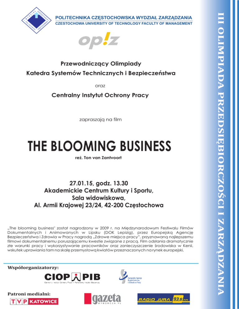 CZESTOCHOWA UNIVERSITY OF TECHNOLOGY FACULTY OF MANAGEMENT Przewodnicz¹cy Olimpiady Katedra Systemów Technicznych i Bezpieczeñstwa oraz Centralny Instytut Ochrony Pracy zapraszaj¹ na film THE BLOOMING BUSINESS re¿. Ton van Zantvoort 27.01.15, godz. 13.30 Akademickie Centrum Kultury i Sportu, Sala widowiskowa, Al. Armii Krajowej 23/24, 42-200 Czêstochowa „The blooming business" zosta³ nagrodzony w 2009 r. na Miêdzynarodowym Festiwalu Filmów Dokumentalnych i Animowanych w Lipsku (DOK Lepizig), przez Europejsk¹ Agencjê Bezpieczeñstwa i Zdrowia w Pracy nagrod¹ „Zdrowe miejsca pracy”, przyznawan¹ najlepszemu filmowi dokumentalnemu poruszaj¹cemu kwestie zwi¹zane z prac¹. Film ods³ania dramatycznie z³e warunki pracy i wykorzystywanie pracowników oraz zanieczyszczenie œrodowiska w Kenii, wskutek uprawiania tam na skalê przemys³ow¹ kwiatów przeznaczonych na rynek europejski. Wspó³organizatorzy: Patroni medialni: III OLIMPIADA PRZEDSIÊBIORCZOŒCI I ZARZ¥DZANIA POLITECHNIKA CZÊSTOCHOWSKA WYDZIA£ ZARZ¥DZANIA