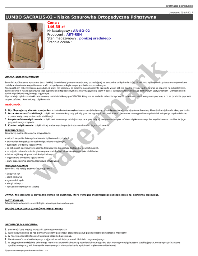 Informacje o produkcie Utworzono 03-03-2017 LUMBO SACRALIS-02 - Niska Sznurówka Ortopedyczna Półsztywna Cena : 146,35 zł CHARAKTERYSTYKA WYROBU er m ar k Nr katalogowy : AR-SO-02 Producent : ART-REH Stan magazynowy : poniżej średniego Średnia ocena : Sznurówka półsztywna wykonana jest z lekkiej, bawełnianej gumy ortopedycznej pozwalającej na swobodne oddychanie skóry. W odcinku lędźwiowo-krzyżowym umiejscowione zostały anatomicznie wyprofilowane stalki ortopedyczne pokryte na gorąco lakierem proszkowym. Ten sposób ich zabezpieczenia powoduje, iż stalki nie korodują, są odporne na pot pacjenta i zawartą w nim sól, nie brudzą wyrobu i odzieży oraz są odporne na odkształcenia. Zastosowanie w naszej sznurówce tego typu stalek ortopedycznych oraz krzyżujących się taśm w części tylnej sznurówki skutkuje doskonałym usztywnieniem i wzmocnieniem odcinka lędźwiowo-krzyżowego kręgosłupa. W przedniej części sznurówki zamocowany został dodatkowy pas VELCRO, który ma za zadanie zabezpieczyć wyrób przed niekontrolowanym rozpięciem, a co za tym idzie poprawić bezpieczeństwo i komfort jego użytkowania. WŁAŚCIWOŚCI 1. Wyrób przyjazny dla skóry pacjenta - sznurówka została wykonana ze specjalnej gumy ortopedycznej zawierającej głównie bawełnę, która jest obojętna dla skóry pacjenta. 2. Duża skuteczność stabilizacji - dzięki zastosowaniu krzyżujących się gum dociągowych oraz unikatowych anatomicznie wyprofilowanych stalek ortopedycznych udało się uzyskać wyjątkową skuteczność stabilizacji. 3. Bezpieczeństwo użytkowania - dzięki zastosowaniu przedniej taśmy zabezpieczającej, zwiększono bezpieczeństwo użytkowania wyrobu, wyeliminowano możliwość jego przypadkowego rozpięcia. 4. Komfort użytkowania - dzięki niskiej wadze wyrobu pacjent odczuwa komfort jego użytkowania. PRZEZNACZENIE: Sznurówkę można stosować w przypadkach: ostrych zespołów bólowych obszarów lędźwiowo-krzyżowych, ● zwyrodnień kręgosłupa w odcinku lędźwiowo-krzyżowym, ● dyskopatii w odcinku lędźwiowym, ● po zabiegach operacyjnych odcinka lędźwiowego kręgosłupa (ortopedia, neurochirurgia), ● po zdjęciu unieruchomienia gipsowego w odcinku lędźwiowo-krzyżowym jako stabilizator, ● deformacji kręgosłupa w odcinku lędźwiowym. ● kręgozmyku w odcinku lędźwiowym ● stany przeciążenia odcinka lędźwiowo-krzyzowego at ● w PRZECIWSKAZANIA: Sznurówki nie należy stosować w przypadku:: ● świeżych ran ● otarć naskórka ● egzem skórnych ● alergii skórnych ● nadciśnienie tętnicze III stopnia UWAGA: Nie stosować w przypadku złamań lub zwichnięć, które wymagają stabilniejszego zabezpieczenia np. opatrunku gipsowego. ZASTOSOWANIE: Rehabilitacja, ortopedia, reumatologia, neurologia i neurochirurgia. SPOSÓB ZAKŁADANIA SZNURÓWKI PÓŁSZTYWNEJ: INFORMACJE DLA PACJENTA: 1. 2. 3. 4. 5. Stosować ściśle według wskazań i pod nadzorem lekarza. Wyrób powinien być po raz pierwszy założony pacjentowi przez lekarza lub przez przeszkolony personel medyczny. W miarę możliwości stosować wyrób na koszulkę bawełnianą. Nie stosować sznurówki ortopedycznej jeżeli wcześniej użyto maści lub żelu rozgrzewającego. W przypadku niewłaściwie dobranego rozmiaru sznurówki (zbyt mały rozmiar) lub w przypadku zbyt mocnego napięcia pasów stabilizujących, może wystąpić czasowe upośledzenie pracy jelit i narządów wewnętrznych lub upośledzenie wydolności krążeniowo-oddechowej. Wygenerowano w programie www.oscGold.com 6. Brak codziennej higieny osobistej lub niewłaściwa konserwacja i pranie wyrobu mogą spowodować otarcia naskórka, albo powstanie odczynów alergicznych związanych ze wzmożoną potliwością i rozwojem flory bakteryjnej. GRAFICZNY SCHEMAT ZAKŁADANIA SZNURÓWKI PÓŁSZTYWNEJ: KONSERWACJA: 1. 2. 3. 4. Prać ręcznie w letniej wodzie z dodatkiem mydła w temperaturze do 30 stopni. Nie prasować. Nie chlorować. Suszyć z daleka od źródeł ciepła. SKŁAD SUROWCOWY: Guma ortopedyczna, pas VELCRO, klamerka poliamidowa, stalki ortopedyczne. KODY REFUNDACYJNE NFZ Przeznaczenie Odpłatność 9180.08 Sznurówka lędźwiowo krzy żowa dolegliwości bólowe z powodu utrwalonych zmian zniekształcających kręgosłupa, wypadnięcia tarcz międzykręgowych 30% 9170.13 Sznurówka lędźwiowo krzy żowa dolegliwości bólowe z powodu utrwalonych zmian zniekształcających kręgosłupa, wypadnięcia tarcz międzykręgowych bezpłatnie do wysokości limitu w Lekarze Upoważnieni Limit NFZ raz w trakcie leczenia danego schorzenia ortopeda, chirurg,neurolog, lekarz rehabilitacji medycznej, 90 zł reumatolog dysfunkcja czasowa at Sposób pomiaru obwód w pasie: Dostepne rozmiary: S - 62-74 cm M - 72-86 cm L - 82-96 cm XL - 92-106 cm XXL - 96-116 cm Okres uzywalności er m ar k Kod środka raz na trzy lata dysfunkcja stała ortopeda, chirurg,neurolog, lekarz rehabilitacji medycznej, 90 zł reumatolog
