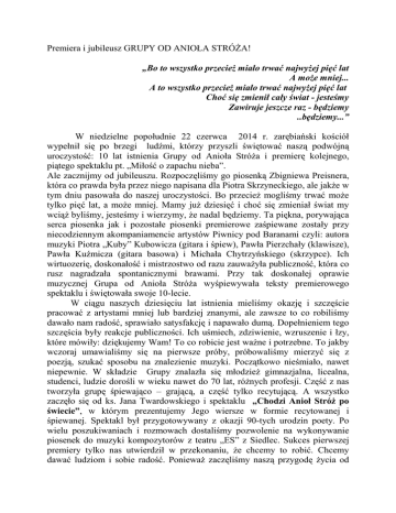 Premiera i jubileusz GRUPY OD ANIOŁA STRÓŻA! „Bo to wszystko przecież miało trwać najwyżej pięć lat A może mniej... A to wszystko przecież miało trwać najwyżej pięć lat Choć się zmienił cały świat - jesteśmy Zawiruje jeszcze raz - będziemy ..będziemy...” W niedzielne popołudnie 22 czerwca 2014 r. zarębiański kościół wypełnił się po brzegi ludźmi, którzy przyszli świętować naszą podwójną uroczystość: 10 lat istnienia Grupy od Anioła Stróża i premierę kolejnego, piątego spektaklu pt. „Miłość o zapachu nieba”. Ale zacznijmy od jubileuszu. Rozpoczęliśmy go piosenką Zbigniewa Preisnera, która co prawda była przez niego napisana dla Piotra Skrzyneckiego, ale jakże w tym dniu pasowała do naszej uroczystości. Bo przecież mogliśmy trwać może tylko pięć lat, a może mniej. Mamy już dziesięć i choć się zmieniał świat my wciąż byliśmy, jesteśmy i wierzymy, że nadal będziemy. Ta piękna, porywająca serca piosenka jak i pozostałe piosenki premierowe zaśpiewane zostały przy niecodziennym akompaniamencie artystów Piwnicy pod Baranami czyli: autora muzyki Piotra „Kuby” Kubowicza (gitara i śpiew), Pawła Pierzchały (klawisze), Pawła Kuźmicza (gitara basowa) i Michała Chytrzyńskiego (skrzypce). Ich wirtuozerię, doskonałość i mistrzostwo od razu zauważyła publiczność, która co rusz nagradzała spontanicznymi brawami. Przy tak doskonałej oprawie muzycznej Grupa od Anioła Stróża wyśpiewywała teksty premierowego spektaklu i świętowała swoje 10-lecie. W ciągu naszych dziesięciu lat istnienia mieliśmy okazję i szczęście pracować z artystami mniej lub bardziej znanymi, ale zawsze to co robiliśmy dawało nam radość, sprawiało satysfakcję i napawało dumą. Dopełnieniem tego szczęścia były reakcje publiczności. Ich uśmiech, zdziwienie, wzruszenie i łzy, które mówiły: dziękujemy Wam! To co robicie jest ważne i potrzebne. To jakby wczoraj umawialiśmy się na pierwsze próby, próbowaliśmy mierzyć się z poezją, szukać sposobu na znalezienie muzyki. Początkowo nieśmiało, nawet niepewnie. W składzie Grupy znalazła się młodzież gimnazjalna, licealna, studenci, ludzie dorośli w wieku nawet do 70 lat, różnych profesji. Część z nas tworzyła grupę śpiewająco – grającą, a część tylko recytującą. A wszystko zaczęło się od ks. Jana Twardowskiego i spektaklu „Chodzi Anioł Stróż po świecie”, w którym prezentujemy Jego wiersze w formie recytowanej i śpiewanej. Spektakl był przygotowywany z okazji 90-tych urodzin poety. Po wielu poszukiwaniach i rozmowach dostaliśmy pozwolenie na wykonywanie piosenek do muzyki kompozytorów z teatru „ES” z Siedlec. Sukces pierwszej premiery tylko nas utwierdził w przekonaniu, że chcemy to robić. Chcemy dawać ludziom i sobie radość. Ponieważ zaczęliśmy naszą przygodę życia od przedstawienia zatytułowanego „Chodzi Anioł Stróż po świecie było dla nas jasne, że jesteśmy od Anioła, taką przyjęliśmy więc nazwę: Grupa od Anioła Stróża. Kolejnym przedsięwzięciem był „Tryptyk rzymski” Jana Pawła II – spektakl, który przygotowaliśmy dla uczczenia pierwszej rocznicy śmierci Papieża Polaka. Specjalnie dla nas, osobiście dostosował i nagrał swoją muzykę, Stanisław Soyka. Sam do nas przyjechał, przeprowadził próbę i zadziwiał się umiejętnościami wokalnymi członków Grupy, zapałem i pomysłem. Mieliśmy szczęście i zaszczyt wspólnego wykonania „Tryptyku rzymskiego” ze Stanisławem Soyką w październiku 2011 r. w Świeradowie Zdroju, a w 2012 r w Bogatyni. Sukces jakim okazało się to przedsięwzięcie znów stał się silną motywacją do dalszej pracy. Przyszedł więc czas na „Pamiątkę z tej ziemi” - spektakl osnuty na siedmiu dniach stworzenia świata. Wykorzystaliśmy tu głównie poezję i prozę ks. Wacława Buryły. Opowiedzieliśmy o tym, co powinno pozostać po nas na ziemi, a co niestety często pozostaje. Wykorzystaliśmy piosenki z repertuaru Starego Dobrego Małżeństwa, Stanisława Soyki, Edyty Gepert i grupy Czerwony Tulipan. Nasza grupa śpiewająca stała się tu również grupą grajacą. Wszystkie piosenki wykonane były przy własnym akompaniamencie. Zapytacie jak wyszło? Odpowiem: niesamowicie i pięknie. „Przyjaciel Anioł” to kolejny spektakl, w którym próbujemy odpowiedzieć na pytanie „kim są Ci Niebiescy Posłańcy”, i który pokazuje jak ważny w życiu jest „przyjaciel”, ten który pomoże stanąć we właściwym miejscu, i ten który wytłumaczy, gdy po ludzku „nie wiemy”. W spektaklu wykorzystaliśmy poezję wrocławskiego poety Lecha Tkaczyka, która jest śpiewana do muzyki Jacka Wanszewicza. Było anielsko. Taką jesteśmy Grupą. Przez te 10 lat przez szeregi Grupy od Anioła Stróża przewinęło się 50 osób. Do dziś są wśród nas Ci, którzy w 2004 r. zaczynali tę przygodę. Razem ze sobą spędziliśmy prawie 600 godzin i przejechaliśmy około 3000 km. Oglądali nas mieszkańcy naszego powiatu i powiatów sąsiednich, kobiety i dzieci z Domu Samotnej Matki z Dziećmi z Pobiednej, podopieczni lubańskiego hospicjum i Domu Opieki Społecznej „Pogodna Jesień” w Jeleniej Górze, skazani z Zakładu Karnego w Zarębie, młodzież licealna i gimnazjalna, dla których występujemy z okazji Dni Papieskich. Nasze świadectwo zawoziliśmy do Franciszkanów do Nysy, do Klaretynów z Krzydliny Małej, do parafii w Słupie, do Wrocławia – Pawłowic, Bolesławca, Kamiennej Góry, Chojnowa, Zgorzelca, Sulikowa. Grupę od Anioła Stróża znają już mieszkańcy Kopanicy, Borui, Tuchorzy i Krotoszyna w woj. Wielkopolskim. 19 września 2009 r. uświetnialiśmy naszym spektaklem „Pamiątka z tej ziemi” Finał XII Ogólnopolskiego Konkursu Poetyckiego „O ludzką twarz człowieka” organizowanego co roku w Krośnicach przez ks. Wacława Buryłę. W 2009 roku zostaliśmy również docenieni