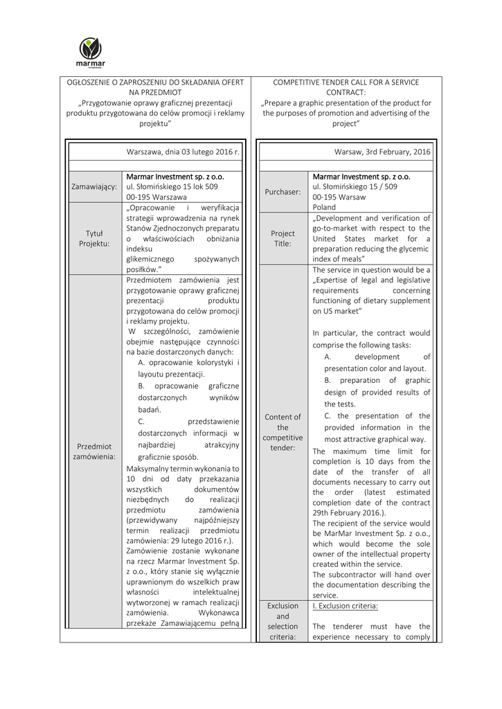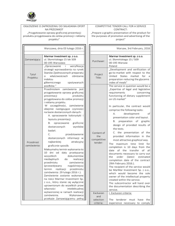 OGŁOSZENIE O ZAPROSZENIU DO SKŁADANIA OFERT NA PRZEDMIOT „Przygotowanie oprawy graficznej prezentacji produktu przygotowana do celów promocji i reklamy projektu” Zamawiający: Tytuł Projektu: Przedmiot zamówienia: COMPETITIVE TENDER CALL FOR A SERVICE CONTRACT: „Prepare a graphic presentation of the product for the purposes of promotion and advertising of the project” Warszawa, dnia 03 lutego 2016 r. Warsaw, 3rd February, 2016 Marmar Investment sp. z o.o. ul. Słomińskiego 15 lok 509 00-195 Warszawa „Opracowanie i weryfikacja strategii wprowadzenia na rynek Stanów Zjednoczonych preparatu o właściwościach obniżania indeksu glikemicznego spożywanych posiłków.” Przedmiotem zamówienia jest przygotowanie oprawy graficznej prezentacji produktu przygotowana do celów promocji i reklamy projektu. W szczególności, zamówienie obejmie następujące czynności na bazie dostarczonych danych: A. opracowanie kolorystyki i layoutu prezentacji. B. opracowanie graficzne dostarczonych wyników badań. C. przedstawienie dostarczonych informacji w najbardziej atrakcyjny graficznie sposób. Maksymalny termin wykonania to 10 dni od daty przekazania wszystkich dokumentów niezbędnych do realizacji przedmiotu zamówienia (przewidywany najpóźniejszy termin realizacji przedmiotu zamówienia: 29 lutego 2016 r.). Zamówienie zostanie wykonane na rzecz Marmar Investment Sp. z o.o., który stanie się wyłącznie uprawnionym do wszelkich praw własności intelektualnej wytworzonej w ramach realizacji zamówienia. Wykonawca przekaże Zamawiającemu pełną Marmar Investment sp. z o.o. ul. Słomińskiego 15 / 509 00-195 Warsaw Poland „Development and verification of go-to-market with respect to the United States market for a preparation reducing the glycemic index of meals” The service in question would be a „Expertise of legal and legislative requirements concerning functioning of dietary supplement on US market” Purchaser: Project Title: Content of the competitive tender: Exclusion and selection criteria: In particular, the contract would comprise the following tasks: A. development of presentation color and layout. B. preparation of graphic design of provided results of the tests. C. the presentation of the provided information in the most attractive graphical way. The maximum time limit for completion is 10 days from the date of the transfer of all documents necessary to carry out the order (latest estimated completion date of the contract 29th February 2016.). The recipient of the service would be MarMar Investment Sp. z o.o., which would become the sole owner of the intellectual property created within the service. The subcontractor will hand over the documentation describing the service. I. Exclusion criteria: The tenderer must have the experience necessary to comply dokumentację opisującą realizację wykonanej usługi. I. Warunki formalne: Oferent musi posiadać doświadczenie niezbędne do wykonania przedmiotu zamówienia, przez co rozumie się udokumentowane realizacje co najmniej dwóch usług z zakresu projektu w ostatnich 12 miesiącach. II. Warunki merytoryczne: 1. Za każdy udokumentowany wykonany projekt ponad minimalną liczbę wymienioną w kryterium I, oferent otrzymuje 4 punkty. Kryterium oceny: Maksymalna łączna liczba punktów możliwych do zdobycia w ramach kryterium II.1. - 60 pkt. Zamawiający dopuszcza udokumentowanie spełnienia powyższych kryteriów doświadczenia w formie oświadczeń. III. Warunki finansowe: W ramach niniejszego kryterium można uzyskać od 0 do 40 pkt, gdzie 40 pkt uzyskuje najniższa zgłoszona cena, a pozostałe oferty uzyskują punktację wg wzoru: punkty dla oferty X = najniższa zgłoszona cena/cena oferty X * 40 z uwzględnieniem zaokrągleń matematycznych. ------------------------------------------------------------------------------------------------------------------------- Konkurs wygra oferent, który uzyska najwyższą ocenę punktową wynikającą ze zsumowania wszystkich uzyskanych punktów określonych w części finansowej i with the order, which means proving execution of at least two services related to the project in last 12 months. II. Substantive criteria: 1. For each documented executed project over the minimum number mentioned in in the criterion I. Exclusion criteria, the tenderer receives 4 points. The maximum total number of points to be received within the criterion II.1. is 60 points. Purchaser allows for documentation of compliance with the above substantive criteria in the form of statements. III. Financial criterion: Under this criterion, one can obtain between 0 and 40 points, where 40 points are obtained for lowest offered price and other bids receive scores according to the following formula (taking into account the rounding to the nearest integer): points for tenderer X = lowest offered price / price of tender X * 40 ---------------------------------------------------------------------------------------------------------------------------The service contract would be awarded to the tenderer who obtains the highest scoring resulting from the sum of points calculated according to the substantive and financial evaluation criteria, with any offer in case of which the tenderer does not fulfil the conditions described in point. I. Formal requirements will be rejected and will not be subject to further assessment. merytorycznej, przy czym oferty, wobec których oferent nie spełnił warunków opisanych w pkt. I. Warunki formalne zostaną odrzucone i nie będą podlegać dalszej ocenie. Zamawiający zastrzega sobie prawo do unieważnienia konkursu bez podania przyczyny. The Purchaser reserves the right to cancel the competitive tender without giving a reason at any point. Oferent zobowiązany jest złożyć ogólne oświadczenie dotyczące wszystkich przekazanych Zamawiającemu danych o treści następującej: “I declare that all statements contained in this offer are correct reality” The tender