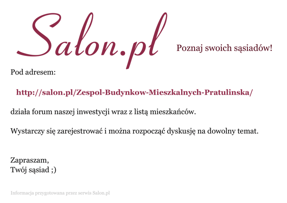 Salon.pl Poznaj swoich sąsiadów! Pod adresem: http://salon.pl/Zespol-Budynkow-Mieszkalnych-Pratulinska/ działa forum naszej inwestycji wraz z listą mieszkańców. Wystarczy się zarejestrować i można rozpocząć dyskusję na dowolny temat. Zapraszam, Twój sąsiad ;) Informacja przygotowana przez serwis Salon.pl