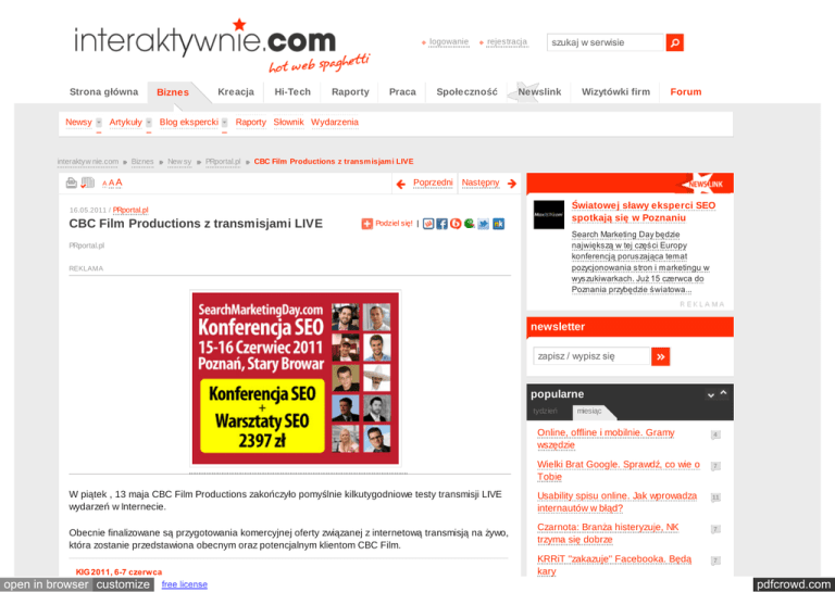 logowanie Strona główna Newsy Artykuły interaktyw nie.com Kreacja Biznes Blog ekspercki Biznes New sy Hi-Tech Raporty Praca rejestracja Społeczność szukaj w serwisie Newslink Wizytówki firm Forum Raporty Słownik Wydarzenia PRportal.pl CBC Film Productions z transm isjam i LIVE A A A Poprzedni Następny Światowej sławy eksperci SEO spotkają się w Poznaniu 16.05.2011 / PRportal.pl CBC Film Productions z transmisjami LIVE Podziel się! | Search Marketing Day będzie największą w tej części Europy konferencją poruszająca temat pozycjonowania stron i marketingu w wyszukiwarkach. Już 15 czerwca do Poznania przybędzie światowa... PRportal.pl REKLAMA newsletter zapisz / wypisz się popularne tydzień miesiąc Online, offline i mobilnie. Gramy wszędzie Wielki Brat Google. Sprawdź, co wie o Tobie W piątek , 13 maja CBC Film Productions zakończyło pomyślnie kilkutygodniowe testy transmisji LIVE wydarzeń w Internecie. Obecnie finalizowane są przygotowania komercyjnej oferty związanej z internetową transmisją na żywo, która zostanie przedstawiona obecnym oraz potencjalnym klientom CBC Film. KIG 2011, 6-7 czerwca open in browser customize free license Usability spisu online. Jak wprowadza internautów w błąd? Czarnota: Branża histeryzuje, NK trzyma się dobrze KRRiT "zakazuje" Facebooka. Będą kary 4 7 11 7 7 pdfcrowd.com KIG 2011, 6-7 czerwca Zdobądź w iedzę od najlepszych Dow iedz się w ięcej! w w w .kongresig.pl Case study: Serce i Rozum wirusowo zarażają sieć Bank BPH-Kapitalne Konto 5 Nie korzystamy z bankowości mobilnej, nie mamy o niej pojęcia Konto osobiste w Banku BPH brak ukrytych opłat! w w w .bph.pl 4 Portfolio na Interaktywnie.com? Teraz to możliw e! interaktyw nie.com blog ekspercki Reklamy BusinessClick Agnieszka Mozol Czynnikiem wpływającym na konkurencyjność oferty CBC Film Productions, jest fakt, że 96,5% testów transmisji obrazu i dźwięku, opierających się na modemach 3G (w sieciach telefonii komórkowej) zakończyło się powodzeniem. Eye tracking - prawdziwa twarz 0 Miłosz Woźniak - Posiadanie w swojej ofercie możliwości przeprowadzenia transmisji live z konferencji prasowych, briefingów oraz innych ważnych wydarzeń, daje nam jeszcze większą przewagę konkurencyjną niż do tej pory. Szczególnie cieszę, się, gdy myślę o jesiennej kampanii wyborczej do Sejmu i Senatu. Niektórzy kandydaci na posłów już teraz zwracają się do nas z zapytaniami o ciekawe formy promocji w Internecie. Teraz, obok wirtualnego studia, możemy też realizować transmisje na żywo ze spotkań kandydatów z wyborcami wprost na Facebook oraz dowolne strony www – mówi Wiktor W. Kammer, szef CBC Film Productions Analiza szybkości wczytywania się podstron w Google Analytics 1 więcej wizytówki firm szukasz klientów dla firmy? Usługa transmisji LIVE w Internecie będzie dostępna w CBC Film Productions od 1 czerwca 2011. źródło/autor: CBC Film Productions więcej ostatnie komentarze Lucjan Kisiel Przegląd: która poczta e-mail jest najlepsza? Jest alternatyw a dla Gmaila :) http://KEMI.PL , jest to serw is płatny gdyż... TAGI CBC Film Productions , Internet, Wiktor Kammer Klimt Agora, O2 i Onet wchodzą w zakupy grupowe Są też strony z recenzjami kuponów , takie jak np.:... Klimt wizytówki firm szukasz klientów dla firmy? Zakupy grupowe: Citeam.pl z 200 tysiącami real users Ja jako klient jestem zadow olony z w iększości open in browser customize free license pdfcrowd.com Ja jako klient jestem zadow olony z w iększości zakupionych kuponów , a było... więcej Emarketing Experts Chariot® Agencja Interaktywna Tradoro Pielęgnujemy marki. Potrafimy i lubimy to robić. Zajmujemy się tym od lat, w spierając klientów w budow aniu... Dobra strona to dopiero połow a sukcesu, potrzebujesz kilku kluczow ych rad specjalistów aby w reszcie zacząć na... System tw orzenia sklepów internetow ych Tradoro pow stał po w ielomiesięcznych pracach najlepszych specjalistów –... Zobacz profil w katalogu firm Zobacz profil w katalogu firm Zobacz profil w katalogu firm dodaj ofertę Programista PHP / PHP Developer Tradoro , Kraków Programista PHP Weekendowe Dni Otwarte Chilireality , Warszaw a Wystartuj po mistrzowsku Zapraszamy 2122 Maja. Now e Rabaty na Apartamenty do 20% Pomnażaj sw oje pieniądze w krótkim okresie i ciesz się zyskami. Spraw dź! Wejdź: ScandinavianHouse.pl w w w .polbank.pl Reklamy BusinessClic k Grafik / Web designer K2 Internet S.A. , Warszaw a lub Łódź Account Manager OS3 multimedia , Warszaw a więcej Dodaj komentarz Nie bądź anonimowy. Zarejestruj się! Otrzymasz profil dzięki, któremu Twoje komentarze będą bardziej wiarygodne. Będziesz miał również dostęp do newslettera, ofert pracy, forum dyskusyjnego oraz kontaktu do innych zarejestrowanych osób. Zakupy grupow e: Citeam.pl po starcie w czołów ce serw isów http://rdir.pl/1f9w s8 #e-commerce #allegro #groupon www: e-mail: wymagane,niepublikowane kod z obrazka obrazek nieczytelny komentarz: POGRUBIENIE CYTAT #Sony w raca do gry po w ycieku danych http://rdir.pl/1f9w ts 1 dzień temu wymagane autor: 1 dzień temu 5 dni temu Dominik Czarnota: Branża histeryzuje, #NK trzyma się dobrze http://rdir.pl/1exe0r LINK Po dodaniu komentarza, Twój adres IP będzie widoczny obok nicka. Informuj e-mailem o now ych komentarzach w tym w ątku open in browser customize free license wyślij pdfcrowd.com Podobne tematy Sklep spożywczy stworzony z myślą o kobietach 0 Certyfikat Użyteczna Strona dla Liberty Direct 0 Boisz się zlecić pracę freelancerowi? Niepotrzebnie 0 Zamieszkaj z morizon.pl i odbierz 4000 zł na wyposażenie nowego mieszkania 1 Dołącz do społeczności interaktywnie.com Anna Pietrasik Krzysztof Pieniążek Bartosz Kordecki WSZYSTKO apple, producenci, google, Design, internet, Hardware, BIZNES smartphone, KREACJA ekologia, android, Dotykowe, Dziwactwa, HITECH OFERTY PRACY KOMENTARZE IT, Sprzęt przenośny, iPhone, 
