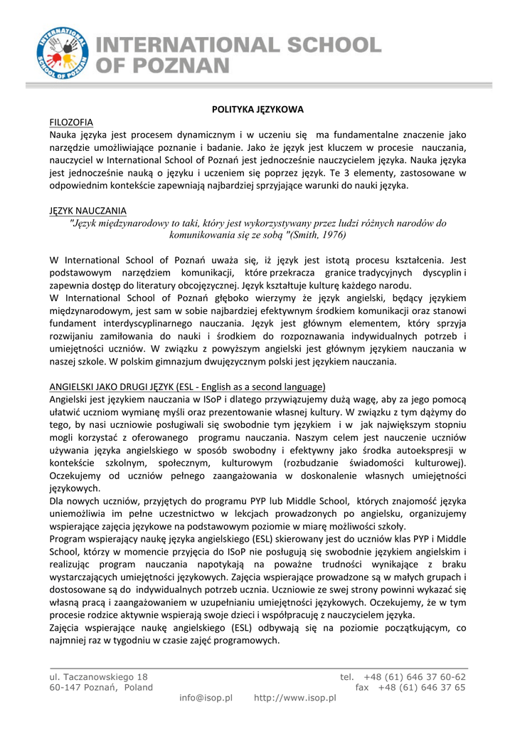 POLITYKA JĘZYKOWA FILOZOFIA Nauka języka jest procesem dynamicznym i w uczeniu się ma fundamentalne znaczenie jako narzędzie umożliwiające poznanie i badanie. Jako że język jest kluczem w procesie nauczania, nauczyciel w International School of Poznań jest jednocześnie nauczycielem języka. Nauka języka jest jednocześnie nauką o języku i uczeniem się poprzez język. Te 3 elementy, zastosowane w odpowiednim kontekście zapewniają najbardziej sprzyjające warunki do nauki języka. JĘZYK NAUCZANIA "Język międzynarodowy to taki, który jest wykorzystywany przez ludzi różnych narodów do komunikowania się ze sobą "(Smith, 1976) W International School of Poznań uważa się, iż język jest istotą procesu kształcenia. Jest podstawowym narzędziem komunikacji, które przekracza granice tradycyjnych dyscyplin i zapewnia dostęp do literatury obcojęzycznej. Język kształtuje kulturę każdego narodu. W International School of Poznań głęboko wierzymy że język angielski, będący językiem międzynarodowym, jest sam w sobie najbardziej efektywnym środkiem komunikacji oraz stanowi fundament interdyscyplinarnego nauczania. Język jest głównym elementem, który sprzyja rozwijaniu zamiłowania do nauki i środkiem do rozpoznawania indywidualnych potrzeb i umiejętności uczniów. W związku z powyższym angielski jest głównym językiem nauczania w naszej szkole. W polskim gimnazjum dwujęzycznym polski jest językiem nauczania. ANGIELSKI JAKO DRUGI JĘZYK (ESL -‐ English as a second language) Angielski jest językiem nauczania w ISoP i dlatego przywiązujemy dużą wagę, aby za jego pomocą ułatwić uczniom wymianę myśli oraz prezentowanie własnej kultury. W związku z tym dążymy do tego, by nasi uczniowie posługiwali się swobodnie tym językiem i w jak największym stopniu mogli korzystać z oferowanego programu nauczania. Naszym celem jest nauczenie uczniów używania języka angielskiego w sposób swobodny i efektywny jako środka autoekspresji w kontekście szkolnym, społecznym, kulturowym (rozbudzanie świadomości kulturowej). Oczekujemy od uczniów pełnego zaangażowania w doskonalenie własnych umiejętności językowych. Dla nowych uczniów, przyjętych do programu PYP lub Middle School, których znajomość języka uniemożliwia im pełne uczestnictwo w lekcjach prowadzonych po angielsku, organizujemy wspierające zajęcia językowe na podstawowym poziomie w miarę możliwości szkoły. Program wspierający naukę języka angielskiego (ESL) skierowany jest do uczniów klas PYP i Middle School, którzy w momencie przyjęcia do ISoP nie posługują się swobodnie językiem angielskim i realizując program nauczania napotykają na poważne trudności wynikające z braku wystarczających umiejętności językowych. Zajęcia wspierające prowadzone są w małych grupach i dostosowane są do indywidualnych potrzeb ucznia. Uczniowie ze swej strony powinni wykazać się własną pracą i zaangażowaniem w uzupełnianiu umiejętności językowych. Oczekujemy, że w tym procesie rodzice aktywnie wspierają swoje dzieci i współpracuję z nauczycielem języka. Zajęcia wspierające naukę angielskiego (ESL) odbywają się na poziomie początkującym, co najmniej raz w tygodniu w czasie zajęć programowych. ul. Taczanowskiego 18 60-147 Poznań, Poland tel. [email protected] http://www.isop.pl +48 (61) 646 37 60-62 fax +48 (61) 646 37 65 Zachęcamy uczniów do używania języka nauczania (angielskiego) w każdej sytuacji. W przypadku kiedy trudno jest im wyrazić się w jęz. angielskim, uczniowie mogą użyć innego języka pod warunkiem, że inni uczniowie i nauczyciel rozumieją ten język. Nauczyciele zobowiązani są do używania języka angielskiego w czasie lekcji i powinni zwrócić uwagę na problemy językowe, na jakie mogą napotkać ich uczniowie posługujący się angielskim jako językiem obcym i podjąć starania umożliwiające uczniom przezwyciężenie tych problemów. JĘZYK OJCZYSTY Rozwój języka ojczystego jest istotną częścią naszej polityki językowej. Gorąco zachęcamy rodziców, aby motywowali swoje dzieci do doskonalenia języka ojczystego, który jest niezbędny do zachowania tożsamości kulturowej i zachowania stabilności emocjonalnej. Aby zrealizować to założenie, zapewniamy zajęcia prowadzone przez wykwalifikowanych nauczycieli języka polskiego, niemieckiego, hiszpańskiego. Ponadto stwarzamy warunki rodzicom do prowadzenia zajęć z ich języków ojczystych. Rozwija to w uczniach szacunek dla własnego języka, literatury i kultury, zapewnia właściwy rozwój w procesie poznawczym, rozwija i kształtuje świadomość międzykulturową. Lekcje te powinny odbywać się po zajęciach programowych tak, aby uczniowie nie opuszczali zajęć przewidzianych w danym programie. UŻYCIE JĘZYKA OJCZYSTEGO Mimo że język angielski jest językiem wykładowym w ISoP, uczniowie mogą w sytuacjach pozalekcyjnych porozumiewać się w językach ojczystych lub innych (przerwy międzylekcyjne, stołówka, plac zabaw, itp.), ale pod warunkiem, że nie wykluczają innych uczniów z komunikacji. W ISoP gorąco zachęcamy wszystkich uczniów do używania języka angielskiego w każdej sytuacji: zarówno w klasie jak i poza nią, w czasie lekcji i podczas zabawy. Ani język ojczysty ani żaden inny język nie może być używany do wyrażenia braku szacunku do drugiej osoby w szkole. DODATKOWE JĘZYKI Uważamy, że znajomość języków obcych jest niezbędnym elementem dobrego wykształcenia ucznia, dlatego też umożliwiamy uczniom naukę dodatkowego języka obcego (niemieckiego lub hiszpańskiego) już od pierwszej klasy (G2). Celem nauki dodatkowego języka obcego jest umożliwienie uczniom skutecznej komunikacji w tym języku, zrozumienie kultury danego języka, zachęcanie do pozytywnego nastawienia wobec osób posługujących się innymi językami, kształtowania pozytywnego stosunku do innych kultur, rozwijanie ciekawości i 