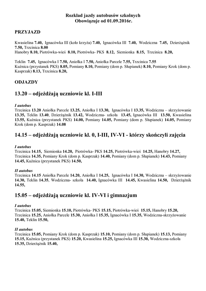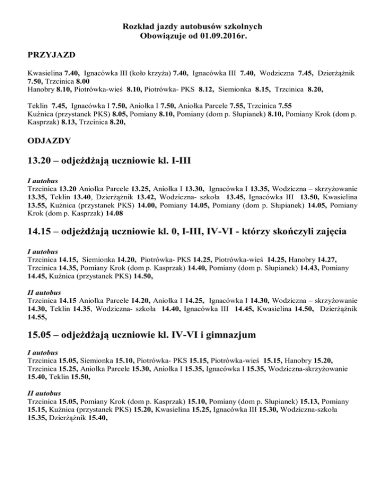 Rozkład jazdy autobusów szkolnych Obowiązuje od 01.09.2016r. PRZYJAZD Kwasielina 7.40, Ignacówka III (koło krzyża) 7.40, Ignacówka III 7.40, Wodziczna 7.45, Dzierżążnik 7.50, Trzcinica 8.00 Hanobry 8.10, Piotrówka-wieś 8.10, Piotrówka- PKS 8.12, Siemionka 8.15, Trzcinica 8.20, Teklin 7.45, Ignacówka I 7.50, Aniołka I 7.50, Aniołka Parcele 7.55, Trzcinica 7.55 Kuźnica (przystanek PKS) 8.05, Pomiany 8.10, Pomiany (dom p. Słupianek) 8.10, Pomiany Krok (dom p. Kasprzak) 8.13, Trzcinica 8.20, ODJAZDY 13.20 – odjeżdżają uczniowie kl. I-III I autobus Trzcinica 13.20 Aniołka Parcele 13.25, Aniołka I 13.30, Ignacówka I 13.35, Wodziczna – skrzyżowanie 13.35, Teklin 13.40, Dzierżążnik 13.42, Wodziczna- szkoła 13.45, Ignacówka III 13.50, Kwasielina 13.55, Kuźnica (przystanek PKS) 14.00, Pomiany 14.05, Pomiany (dom p. Słupianek) 14.05, Pomiany Krok (dom p. Kasprzak) 14.08 14.15 – odjeżdżają uczniowie kl. 0, I-III, IV-VI - którzy skończyli zajęcia I autobus Trzcinica 14.15, Siemionka 14.20, Piotrówka- PKS 14.25, Piotrówka-wieś 14.25, Hanobry 14.27, Trzcinica 14.35, Pomiany Krok (dom p. Kasprzak) 14.40, Pomiany (dom p. Słupianek) 14.43, Pomiany 14.45, Kuźnica (przystanek PKS) 14.50, II autobus Trzcinica 14.15 Aniołka Parcele 14.20, Aniołka I 14.25, Ignacówka I 14.30, Wodziczna – skrzyżowanie 14.30, Teklin 14.35, Wodziczna- szkoła 14.40, Ignacówka III 14.45, Kwasielina 14.50, Dzierżążnik 14.55, 15.05 – odjeżdżają uczniowie kl. IV-VI i gimnazjum I autobus Trzcinica 15.05, Siemionka 15.10, Piotrówka- PKS 15.15, Piotrówka-wieś 15.15, Hanobry 15.20, Trzcinica 15.25, Aniołka Parcele 15.30, Aniołka I 15.35, Ignacówka I 15.35, Wodziczna-skrzyżowanie 15.40, Teklin 15.50, II autobus Trzcinica 15.05, Pomiany Krok (dom p. Kasprzak) 15.10, Pomiany (dom p. Słupianek) 15.13, Pomiany 15.15, Kuźnica (przystanek PKS) 15.20, Kwasielina 15.25, Ignacówka III 15.30, Wodziczna-szkoła 15.35, Dzierżążnik 15.40,