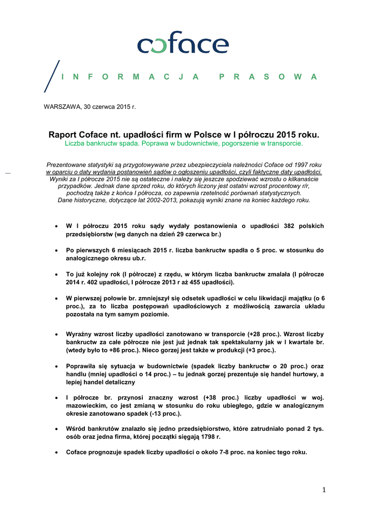 Raport Coface nt. upadłości firm w Polsce w I półroczu 2015 roku
