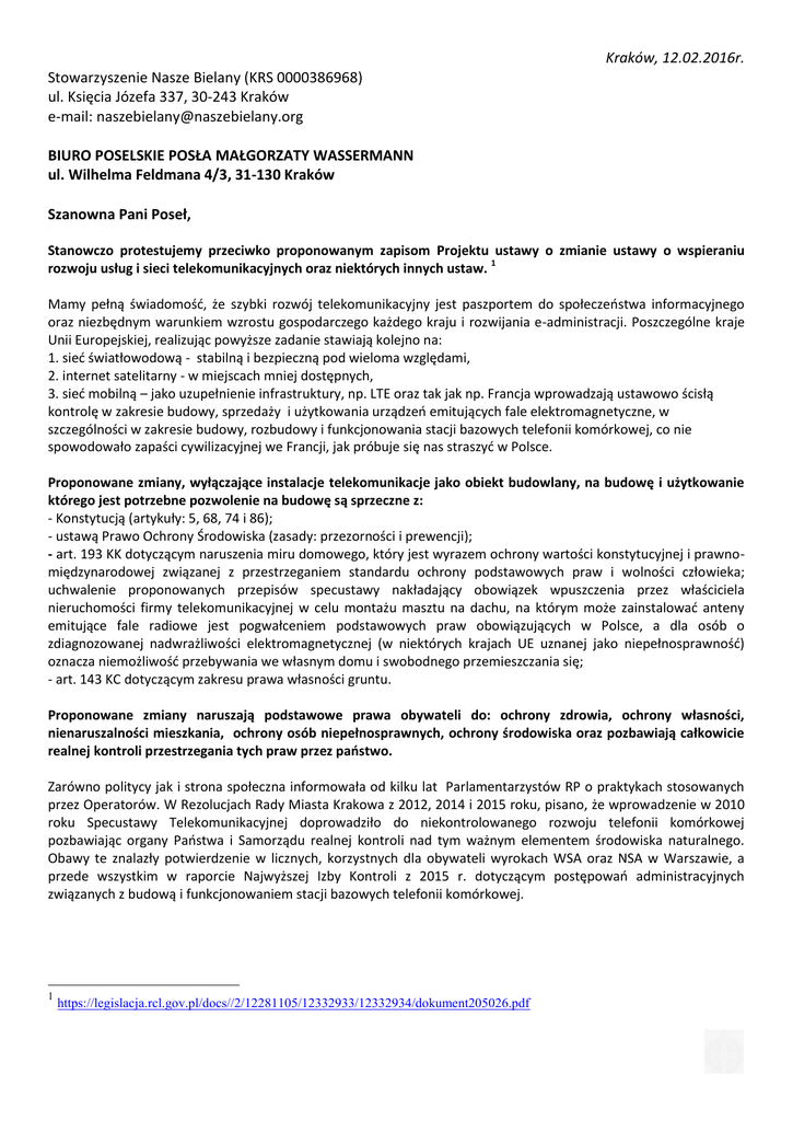 Kraków, 12.02.2016r. Stowarzyszenie Nasze Bielany (KRS 0000386968) ul. Księcia Józefa 337, 30-243 Kraków e-mail: [email protected] BIURO POSELSKIE POSŁA MAŁGORZATY WASSERMANN ul. Wilhelma Feldmana 4/3, 31-130 Kraków Szanowna Pani Poseł, Stanowczo protestujemy przeciwko proponowanym zapisom Projektu ustawy o zmianie ustawy o wspieraniu rozwoju usług i sieci telekomunikacyjnych oraz niektórych innych ustaw. 1 Mamy pełną świadomość, że szybki rozwój telekomunikacyjny jest paszportem do społeczeństwa informacyjnego oraz niezbędnym warunkiem wzrostu gospodarczego każdego kraju i rozwijania e-administracji. Poszczególne kraje Unii Europejskiej, realizując powyższe zadanie stawiają kolejno na: 1. sieć światłowodową - stabilną i bezpieczną pod wieloma względami, 2. internet satelitarny - w miejscach mniej dostępnych, 3. sieć mobilną – jako uzupełnienie infrastruktury, np. LTE oraz tak jak np. Francja wprowadzają ustawowo ścisłą kontrolę w zakresie budowy, sprzedaży i użytkowania urządzeń emitujących fale elektromagnetyczne, w szczególności w zakresie budowy, rozbudowy i funkcjonowania stacji bazowych telefonii komórkowej, co nie spowodowało zapaści cywilizacyjnej we Francji, jak próbuje się nas straszyć w Polsce. Proponowane zmiany, wyłączające instalacje telekomunikacje jako obiekt budowlany, na budowę i użytkowanie którego jest potrzebne pozwolenie na budowę są sprzeczne z: - Konstytucją (artykuły: 5, 68, 74 i 86); - ustawą Prawo Ochrony Środowiska (zasady: przezorności i prewencji); - art. 193 KK dotyczącym naruszenia miru domowego, który jest wyrazem ochrony wartości konstytucyjnej i prawnomiędzynarodowej związanej z przestrzeganiem standardu ochrony podstawowych praw i wolności człowieka; uchwalenie proponowanych przepisów specustawy nakładający obowiązek wpuszczenia przez właściciela nieruchomości firmy telekomunikacyjnej w celu montażu masztu na dachu, na którym może zainstalować anteny emitujące fale radiowe jest pogwałceniem podstawowych praw obowiązujących w Polsce, a dla osób o zdiagnozowanej nadwrażliwości elektromagnetycznej (w niektórych krajach UE uznanej jako niepełnosprawność) oznacza niemożliwość przebywania we własnym domu i swobodnego przemieszczania się; - art. 143 KC dotyczącym zakresu prawa własności gruntu. Proponowane zmiany naruszają podstawowe prawa obywateli do: ochrony zdrowia, ochrony własności, nienaruszalności mieszkania, ochrony osób niepełnosprawnych, ochrony środowiska oraz pozbawiają całkowicie realnej kontroli przestrzegania tych praw przez państwo. Zarówno politycy jak i strona społeczna informowała od kilku lat Parlamentarzystów RP o praktykach stosowanych przez Operatorów. W Rezolucjach Rady Miasta Krakowa z 2012, 2014 i 2015 roku, pisano, że wprowadzenie w 2010 roku Specustawy Telekomunikacyjnej doprowadziło do niekontrolowanego rozwoju telefonii komórkowej pozbawiając organy Państwa i Samorządu realnej kontroli nad tym ważnym elementem środowiska naturalnego. Obawy te znalazły potwierdzenie w licznych, korzystnych dla obywateli wyrokach WSA oraz NSA w Warszawie, a przede wszystkim w raporcie Najwyższej Izby Kontroli z 2015 r. dotyczącym postępowań administracyjnych związanych z budową i funkcjonowaniem stacji bazowych telefonii komórkowej. 1 https://legislacja.rcl.gov.pl/docs//2/12281105/12332933/12332934/dokument205026.pdf Raport NIK 2 wskazuje, że obecne przepisy nie gwarantują należytego badania oddziaływania stacji telefonii komórkowej na zdrowie i warunki życia mieszkańców. Prawo w tym zakresie sprzyja korupcji i dokonywaniu nierzetelnych pomiarów pola elektromagnetycznego wokół takich stacji. W tej sytuacji, NIK pilnie wnioskuje o podjęcie inicjatywy legislacyjnej, aby jednoznacznie i kategorycznie doprecyzować proces budowy stacji telefonii komórkowych i określić warunki ich powstawania zwłaszcza pod kątem szeroko rozumianego bezpieczeństwa ludzi i środowiska. Ciągle brak jest reakcji polskich władz na znane i zatrważające niebezpieczeństwa zagrożenia zdrowia, oraz, że wciąż zwleka się z podjęciem i wdrożeniem koniecznych systemowych działań, mających na celu ochronę zdrowia. Wstrzymywanie się z podjęciem działań ochronnych do czasu uzyskania niezbitych naukowych i klinicznych dowodów, może prowadzić do bardzo wysokich kosztów zdrowotnych i ekonomicznych, jak to miało miejsce w przypadku azbestu, benzyny z ołowiem lub tytoniu. W grudniu 2015r. zostały opublikowane Wytyczne 2015 w zakresie profilaktyki, diagnozowania i leczenia problemów zdrowotnych i chorób związanych z polami elektromagnetycznymi (EUROPAEM EMF Guideline 2015 for the prevention, diagnosis and treatment of EMF-related health problems and illnesses)3, gdzie na podstawie podsumowania wyników badań naukowych z całego świata zaproponowano bezpieczne normy PEM: Dla zdrowej osoby: w ciągu dnia do 0,6V/m, w ciągu nocy 0,2V/m, natomiast dla osób nadwrażliwych: do 0,06V/m. Wartości te są zbieżne z dwiema poprzednimi rezolucjami Rady Miasta Krakowa. Obecna norma prawna obowiązująca w Polsce to 7V/m, a Ministerstwo Cyfryzacji planuje jej liberalizację aż do 60V/m. Organy Unii Europejskiej trzykrotnie (w 2009r., 2011r. i 2012r.) zwracały uwagę na zagrożenia ze strony pól elektromagnetycznych oraz wzywały państwa członkowskie do uznania nadwrażliwości elektromagnetycznej za niepełnosprawność, rekomendowały wprowadzenie norm na poziomie do 0,6V/m wewnątrz budynków i zaplanowanie w przyszłości redukcji do 0,2V/m (norma w Polsce to 7V/m), udostępniania szczegółowych informacji o źródłach i poziomach emisji pól elektromagnetycznego i ich ciągłego jawnego monitoringu. W 2007r. lobbyści uczynili martwym Prawo ochrony środowiska w zakresie ochrony przede promieniowaniem elektromagnetycznym (poprzez zmianę jednego z rozporządzeń). Pozostawała jednak możliwość ochrony pr
