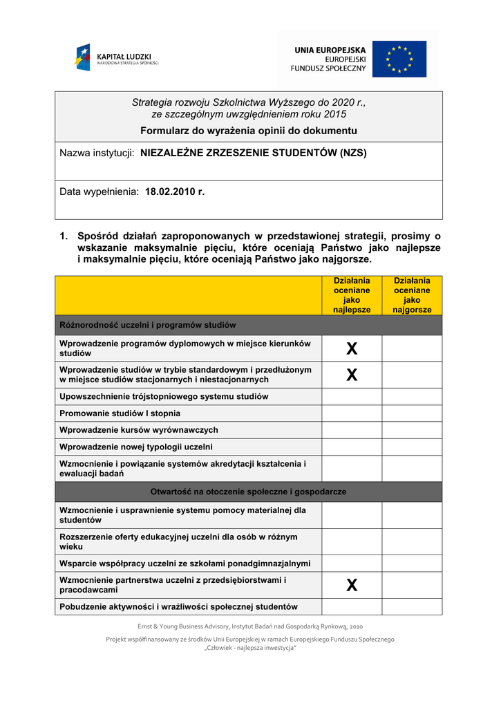 Strategia rozwoju Szkolnictwa Wyższego do 2020 r., ze szczególnym uwzględnieniem roku 2015 Formularz do wyrażenia opinii do dokumentu Nazwa instytucji: NIEZALEŻNE ZRZESZENIE STUDENTÓW (NZS) Data wypełnienia: 18.02.2010 r. 1. Spośród działań zaproponowanych w przedstawionej strategii, prosimy o wskazanie maksymalnie pięciu, które oceniają Państwo jako najlepsze i maksymalnie pięciu, które oceniają Państwo jako najgorsze. Działania oceniane jako najlepsze Działania oceniane jako najgorsze Różnorodność uczelni i programów studiów Wprowadzenie programów dyplomowych w miejsce kierunków studiów X Wprowadzenie studiów w trybie standardowym i przedłużonym w miejsce studiów stacjonarnych i niestacjonarnych X Upowszechnienie trójstopniowego systemu studiów Promowanie studiów I stopnia Wprowadzenie kursów wyrównawczych Wprowadzenie nowej typologii uczelni Wzmocnienie i powiązanie systemów akredytacji kształcenia i ewaluacji badań Otwartość na otoczenie społeczne i gospodarcze Wzmocnienie i usprawnienie systemu pomocy materialnej dla studentów Rozszerzenie oferty edukacyjnej uczelni dla osób w różnym wieku Wsparcie współpracy uczelni ze szkołami ponadgimnazjalnymi Wzmocnienie partnerstwa uczelni z przedsiębiorstwami i pracodawcami X Pobudzenie aktywności i wrażliwości społecznej studentów Ernst & Young Business Advisory, Instytut Badań nad Gospodarką Rynkową, 2010 Projekt współfinansowany ze środków Unii Europejskiej w ramach Europejskiego Funduszu Społecznego „Człowiek - najlepsza inwestycja” Działania oceniane jako najlepsze Działania oceniane jako najgorsze Mobilność kadry akademickiej i studentów Wprowadzenie obowiązku mobilności do polityki zatrudniania X Upowszechnienie badawczych stanowisk podoktorskich Pobudzanie mobilności międzysektorowej kadry akademickiej Uwzględnienie mobilności w organizacji studiów X Utworzenie Krajowej Agencji Wymiany Akademickiej Konkurencja jako instrument poprawy jakości Wprowadzenie kontraktów na zadania dydaktyczne uczelni Rozszerzenie konkursowego finansowania badań Wzmocnienie niecenowych mechanizmów konkurowania o studentów Efektywność wykorzystania zasobów Usprawnienie zarządzania strategicznego szkolnictwem wyższym przez państwo X Racjonalizacja systemu publicznego szkolnictwa wyższego Zwiększenie elastyczności systemu wynagrodzeń nauczycieli akademickich Usprawnienie systemów zarządzania uczelniami publicznymi X Wprowadzenie semestru wakacyjnego Przejrzystość działania Wprowadzenie przejrzystego ustroju uczelni opartego na czytelnej odpowiedzialności jej organów Poszerzenie obowiązków informacyjnych Wprowadzenie ogólnopolskiego rejestru studentów i systemu rejestracji kandydatów na studia Wprowadzenie przejrzystych zasad polityki kadrowej Ernst & Young Business Advisory, Instytut Badań nad Gospodarką Rynkową, 2010 Projekt współfinansowany ze środków Unii Europejskiej w ramach Europejskiego Funduszu Społecznego „Człowiek - najlepsza inwestycja” 2. Prosimy o uzasadnienie powyższych ocen Przedstawiona strategia w większości jest zgodna z postulatami Niezależnego Zrzeszenia Studentów. Niezmiernie trudno pośród tak wielu dobrych pomysłów dobrać te, które są najistotniejsze. Dlatego też w powyższym zestawieniu zaznaczyliśmy pomysły, które naszym zdaniem są priorytetowe dla rozwoju Szkolnictwa Wyższego: Wprowadzenie programów dyplomowych w miejsce kierunków studiów Wprowadzenie studiów w trybie standardowym i przedłużonym w miejsce studiów stacjonarnych i niestacjonarnych Wzmocnienie partnerstwa uczelni z przedsiębiorstwami i pracodawcami Wprowadzenie obowiązku mobilności do polityki zatrudniania Usprawnienie systemów zarządzania uczelniami publicznymi Niestety większą trudność sprawia wyłonienie działań naszym zdaniem najgorszych. Wynika to z faktu, iż założenia ogólne są jak najbardziej słuszne, gdy jednak zagłębi się w szczegóły to wiele propozycji zawiera niedobre naszym zdaniem rozwiązania, które mogą źle wpłynąć na kondycję Szkolnictwa Wyższego. Utworzenie Krajowej Agencji Wymiany Akademickiej Zakładamy, że powstanie tego typu biura, będzie nieść ze sobą zby duży rozrost administracji i wydatków publicznych, nieproporcjonalnych do uzykanych efektów. Ponadto zakładamy, że uczelnie funkcjonując na tak konkurencyjnym rynku same lepiej dopasują promocję swojej jednostki do oferty i możliwiści. Usprawnienie zarządzania strategicznego szkolnictwem wyższym przez państwo W naszym przekonaniu rozwiązania takie nie przyniosą zakładanych w strategii pozytywnych skutków. Prowadzić mogą natomiast do centralizacji oraz usztywnienia Ernst & Young Business Advisory, Instytut Badań nad Gospodarką Rynkową, 2010 Projekt współfinansowany ze środków Unii Europejskiej w ramach Europejskiego Funduszu Społecznego „Człowiek - najlepsza inwestycja” systemu szkolnictwa wyższego oraz zahamowania zakładanej w strategii konkurencyjności. 3. Jakie istotne działania nie zostały Państwa zdaniem uwzględnione w Strategii? Cieszymy się, iż większość postulatów zgłaszanych podczas poprzednich konsultacji, które odbywały się ze zleceniodawcą „Strategii rozwoju Szkolnictwa Wyższego do 2020 r.,” – MNiSW, zostały uwzględnione w sporządzonym dokumencie. Działania, które należy wziąć ponadto pod uwagę: Stworzenie specjalnych możliwości dla wybitnych studentów poprzez wprowadzenie tutoringu – bliskiej współpracy pomiędzy wykładowcą i studentem na zasadzie mistrz-uczeń Podwyższenie wymagań w zakresie zakładania nowych uczelni wyższych Utworzenie indywidualnego toku studiów dla wybitnie uzdolnionych doktorantów Wprowadzenie obowiązku ewaluacji pracowników naukowych połączonego z publikacją informacji o wykładowcy w Internecie. Brak strategii rozwiązywania problemów uczelni niepublicznych, które będą się borykać z niżem dem