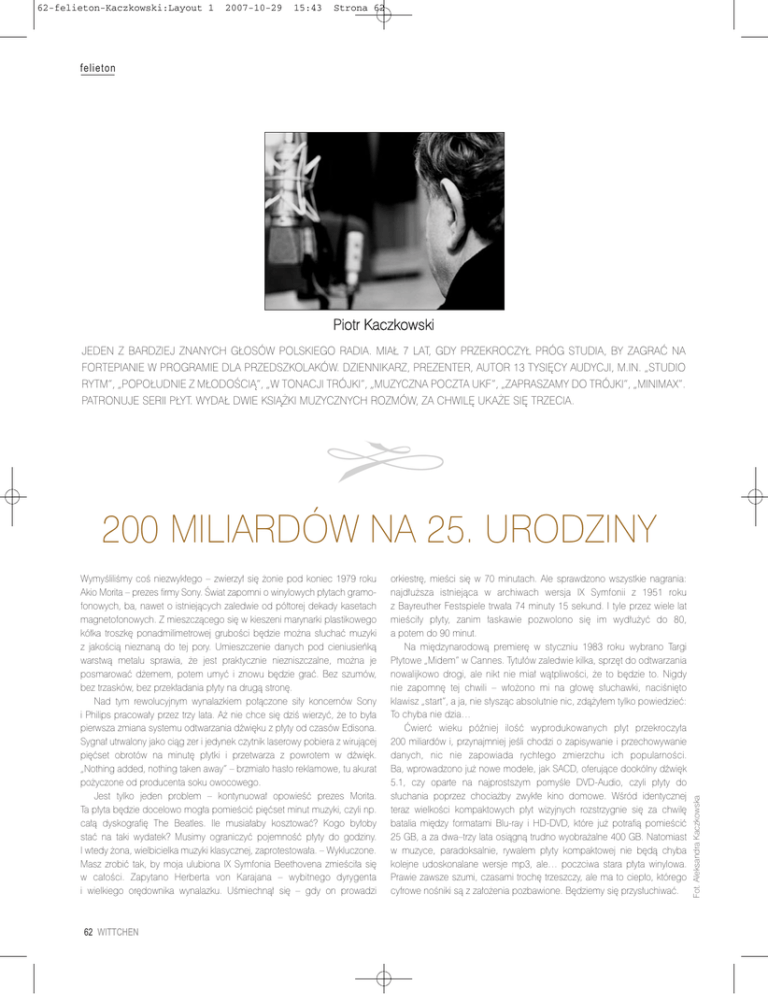 62-felieton-Kaczkowski:Layout 1 2007-10-29 15:43 Strona 62 felieton Piotr Kaczkowski JEDEN Z BARDZIEJ ZNANYCH GŁOSÓW POLSKIEGO RADIA. MIAŁ 7 LAT, GDY PRZEKROCZYŁ PRÓG STUDIA, BY ZAGRAĆ NA FORTEPIANIE W PROGRAMIE DLA PRZEDSZKOLAKÓW. DZIENNIKARZ, PREZENTER, AUTOR 13 TYSIĘCY AUDYCJI, M.IN. „STUDIO RYTM”, „POPOŁUDNIE Z MŁODOŚCIĄ”, „W TONACJI TRÓJKI”, „MUZYCZNA POCZTA UKF”, „ZAPRASZAMY DO TRÓJKI”, „MINIMAX”. PATRONUJE SERII PŁYT. WYDAŁ DWIE KSIĄŻKI MUZYCZNYCH ROZMÓW, ZA CHWILĘ UKAŻE SIĘ TRZECIA. Wymyśliliśmy coś niezwykłego – zwierzył się żonie pod koniec 1979 roku Akio Morita – prezes firmy Sony. Świat zapomni o winylowych płytach gramofonowych, ba, nawet o istniejących zaledwie od półtorej dekady kasetach magnetofonowych. Z mieszczącego się w kieszeni marynarki plastikowego kółka troszkę ponadmilimetrowej grubości będzie można słuchać muzyki z jakością nieznaną do tej pory. Umieszczenie danych pod cieniusieńką warstwą metalu sprawia, że jest praktycznie niezniszczalne, można je posmarować dżemem, potem umyć i znowu będzie grać. Bez szumów, bez trzasków, bez przekładania płyty na drugą stronę. Nad tym rewolucyjnym wynalazkiem połączone siły koncernów Sony i Philips pracowały przez trzy lata. Aż nie chce się dziś wierzyć, że to była pierwsza zmiana systemu odtwarzania dźwięku z płyty od czasów Edisona. Sygnał utrwalony jako ciąg zer i jedynek czytnik laserowy pobiera z wirującej pięćset obrotów na minutę płytki i przetwarza z powrotem w dźwięk. „Nothing added, nothing taken away” – brzmiało hasło reklamowe, tu akurat pożyczone od producenta soku owocowego. Jest tylko jeden problem – kontynuował opowieść prezes Morita. Ta płyta będzie docelowo mogła pomieścić pięćset minut muzyki, czyli np. całą dyskografię The Beatles. Ile musiałaby kosztować? Kogo byłoby stać na taki wydatek? Musimy ograniczyć pojemność płyty do godziny. I wtedy żona, wielbicielka muzyki klasycznej, zaprotestowała. – Wykluczone. Masz zrobić tak, by moja ulubiona IX Symfonia Beethovena zmieściła się w całości. Zapytano Herberta von Karajana – wybitnego dyrygenta i wielkiego orędownika wynalazku. Uśmiechnął się – gdy on prowadzi 62 WITTCHEN orkiestrę, mieści się w 70 minutach. Ale sprawdzono wszystkie nagrania: najdłuższa istniejąca w archiwach wersja IX Symfonii z 1951 roku z Bayreuther Festspiele trwała 74 minuty 15 sekund. I tyle przez wiele lat mieściły płyty, zanim łaskawie pozwolono się im wydłużyć do 80, a potem do 90 minut. Na międzynarodową premierę w styczniu 1983 roku wybrano Targi Płytowe „Midem” w Cannes. Tytułów zaledwie kilka, sprzęt do odtwarzania nowalijkowo drogi, ale nikt nie miał wątpliwości, że to będzie to. Nigdy nie zapomnę tej chwili – włożono mi na głowę słuchawki, naciśnięto klawisz „start”, a ja, nie słysząc absolutnie nic, zdążyłem tylko powiedzieć: To chyba nie dzia… Ćwierć wieku później ilość wyprodukowanych płyt przekroczyła 200 miliardów i, przynajmniej jeśli chodzi o zapisywanie i przechowywanie danych, nic nie zapowiada rychłego zmierzchu ich popularności. Ba, wprowadzono już nowe modele, jak SACD, oferujące dookólny dźwięk 5.1, czy oparte na najprostszym pomyśle DVD-Audio, czyli płyty do słuchania poprzez chociażby zwykłe kino domowe. Wśród identycznej teraz wielkości kompaktowych płyt wizyjnych rozstrzygnie się za chwilę batalia między formatami Blu-ray i HD-DVD, które już potrafią pomieścić 25 GB, a za dwa–trzy lata osiągną trudno wyobrażalne 400 GB. Natomiast w muzyce, paradoksalnie, rywalem płyty kompaktowej nie będą chyba kolejne udoskonalane wersje mp3, ale… poczciwa stara płyta winylowa. Prawie zawsze szumi, czasami trochę trzeszczy, ale ma to ciepło, którego cyfrowe nośniki są z założenia pozbawione. Będziemy się przysłuchiwać. Fot. Aleksandra Kaczkowska 200 MILIARDÓW NA 25. URODZINY