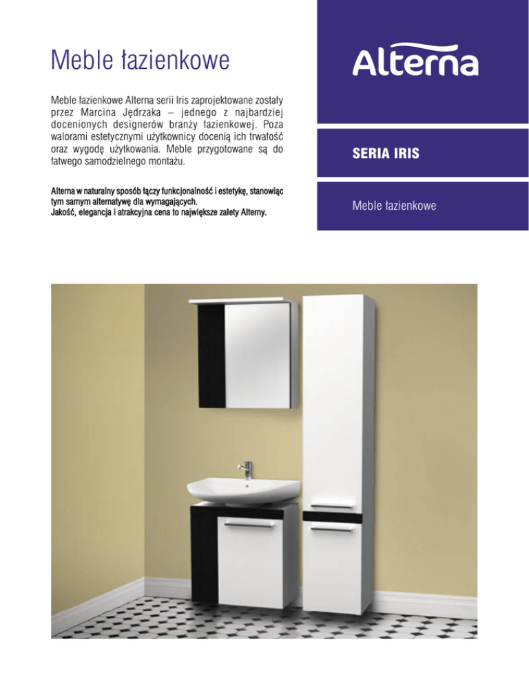 Meble łazienkowe Meble łazienkowe Alterna serii Iris zaprojektowane zostały przez Marcina Jędrzaka – jednego z najbardziej docenionych designerów branży łazienkowej. Poza walorami estetycznymi użytkownicy docenią ich trwałość oraz wygodę użytkowania. Meble przygotowane są do łatwego samodzielnego montażu. Alterna w naturalny sposób łączy funkcjonalność i estetykę, stanowiąc tym samym alternatywę dla wymagających. Jakość, elegancja i atrakcyjna cena to największe zalety Alterny. SERIA IRIS Meble łazienkowe SZAFKA PODUMYWALKOWA UNIWERSALNA Dostępne również w wersji biały / klon szafka podumywalkowa wisząca możliwość łączenia z szerokim zakresem umywalek 500 600 mebel wykonany z płyty wiórowej szafka wyposażona w okucia basic obrzeża wykończone PCV 0,5mm wysoka odporność na zarysowania 280 kolor 150 480 330 TADMAR wysokość szerokość głębokość ALTN-914298 laminat biały / wenge 600 480 280 ALTN-965688 laminat biały / klon 600 480 280 SZAFKA Z LUSTREM WISZĄCA Dostępne również w wersji biały / klon 18 szafka nadumywalkowa wisząca lustro zamontowane w drzwiach 330 260 200 150 582 600 200 mebel wykonany z płyty wiórowej szafka wyposażona w okucia basic obrzeża wykończone PCV 0,5mm wysoka odporność na zarysowania 480 wymiary szafki z panelem świetlnym: 600 x 480 x 260 mm PANEL ŚWIETLNY kolor wysokość szerokość głębokość ALTN-914299 laminat biały / wenge 582 480 150 ALTN-965689 laminat biały / klon 582 480 150 ALTN-914300 panel świetlny 18 480 260 SZAFKA WYSOKA 18 262 280 500 50 1700 1150 Dostępne również w wersji biały / klon 300 szafka dwudrzwiowa wisząca mebel wykonany z płyty wiórowej szafka wyposażona w okucia basic obrzeża wykończone PCV 0,5mm wysoka odporność na zarysowania dostępna tylko w wersji „lewej” (drzwi otwierają się na lewą stronę) kolor wysokość szerokość głębokość ALTN-914301 laminat biały / wenge 1700 300 280 ALTN-965690 laminat biały / klon 1700 300 280 TADMAR www.tadmar.pll