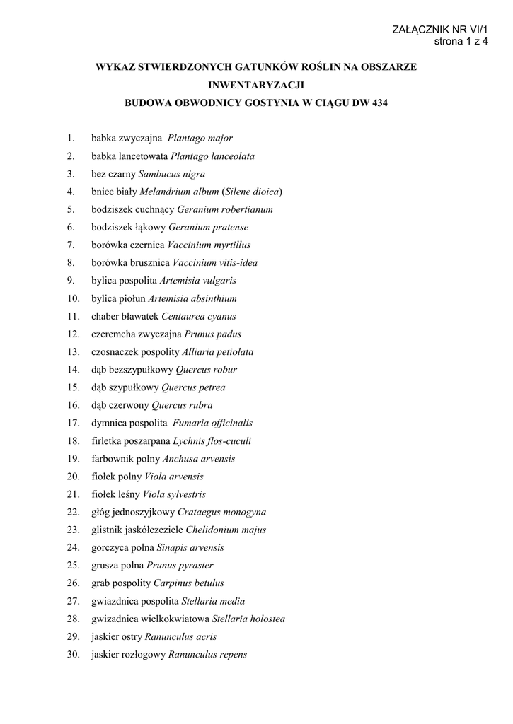 ZAŁĄCZNIK NR VI/1 strona 1 z 4 WYKAZ STWIERDZONYCH GATUNKÓW ROŚLIN NA OBSZARZE INWENTARYZACJI BUDOWA OBWODNICY GOSTYNIA W CIĄGU DW 434 1. babka zwyczajna Plantago major 2. babka lancetowata Plantago lanceolata 3. bez czarny Sambucus nigra 4. bniec biały Melandrium album (Silene dioica) 5. bodziszek cuchnący Geranium robertianum 6. bodziszek łąkowy Geranium pratense 7. borówka czernica Vaccinium myrtillus 8. borówka brusznica Vaccinium vitis-idea 9. bylica pospolita Artemisia vulgaris 10. bylica piołun Artemisia absinthium 11. chaber bławatek Centaurea cyanus 12. czeremcha zwyczajna Prunus padus 13. czosnaczek pospolity Alliaria petiolata 14. dąb bezszypułkowy Quercus robur 15. dąb szypułkowy Quercus petrea 16. dąb czerwony Quercus rubra 17. dymnica pospolita Fumaria officinalis 18. firletka poszarpana Lychnis flos-cuculi 19. farbownik polny Anchusa arvensis 20. fiołek polny Viola arvensis 21. fiołek leśny Viola sylvestris 22. głóg jednoszyjkowy Crataegus monogyna 23. glistnik jaskółczeziele Chelidonium majus 24. gorczyca polna Sinapis arvensis 25. grusza polna Prunus pyraster 26. grab pospolity Carpinus betulus 27. gwiazdnica pospolita Stellaria media 28. gwizadnica wielkokwiatowa Stellaria holostea 29. jaskier ostry Ranunculus acris 30. jaskier rozłogowy Ranunculus repens ZAŁĄCZNIK NR VI/1 strona 2 z 4 31. jabłoń dzika Malus sylvestris 32. jasnota plamista Lamium maculatum 33. jeżyna popielica Rubus caesius 34. kapusta rzepak Brassica napus 35. karbieniec pospolity Lycopus europaeus 36. kielisznik zaroślowy Calystegia sepium 37. klon pospolity Acer platanoides 38. klon jawor Acer pseudoplatanus 39. klon jesionolistny Acer negundo 40. kłosówka wełnista Holcus lanatus 41. kościenica wodna Myosoton aquatica 42. komosa biała Chenopodium album 43. koniczyna biała Trifolium repens 44. koniczyna łąkowa Trifolium pratense 45. koniczyna różnoogonkowa Trifolium campestre 46. konwalijka dwulistna Maianthemum bifolium 47. konwalia majowa Convallaria majalis 48. kosaciec zółty Iris pseudacorus 49. krwawnik pospolity Achillea millefolium 50. kruszyna pospolita Frangula alnus 51. kupkówka pospoltia Dactylis glomerata 52. leszczyna pospolita Corylus avellana 53. łoczyga pospolita Lapsana communis 54. łopian pajęczynowaty Arctium tomentosum 55. mak polny Papaver rhoeas 56. manna mielec Glyceria maxima 57. marek szerokolistny Sium latifolium 58. maruna bezwonna Matricaria perforata 59. mietlica pospolita Agrostis capillaris 60. mlecz polny Sanchus arvensis 61. mniszek lekarski Taraxacum officinale 62. modrzew europejski Larix decidua 63. mozga trzcinowata Phalaris arundinacea 64. niezapominajka polna Myosotis arvensis ZAŁĄCZNIK NR VI/1 strona 3 z 4 65. nawrot polny Lithospermum arvense 66. nerecznica krótkoostna Dryopteris cristata 67. olsza czarna Alnus glutinosa 68. orlica pospolita Pteridium aquilinum 69. ostrożeń polny Cirsium arvense 70. oset kędzierzaw Carduus crispus 71. perz właściwy Agropyron repens 72. pięciornik gęsi Potentilla anserina 73. pokrzywa zwyczajna Urtica dioica 74. poziewnik szorstki Galeopsis tetrahit 75. prosownica rozpierzchła Millium effusum 76. przetacznik trójlistkowy Veronica triphyllos 77. przetacznik bobowniczek Veronica baccabunga 78. przytulia czepna Galium aparine 79. przymiotno kanadyjskie Erigeron canadensis 80. przytulia bagienna Galium uliginosum 81. rajgras wyniosły Arrhenatherum elatius 82. róża dzika Rosa canina 83. róża pomarszczona Rosa rugosa 84. rumianek bezpromieniowy Matricaria matricarioides 85. sałata kompasowa Lactuca serriola 86. skrzyp polny Equisetum arvense 87. skrzyp łąkowy Equisetum pratense 88. sosna zwyczajna Pinus sylvestris 89. stokłosa dachowa Bromus tectorum 90. stokłosa miękka Bromus hordeaceus 91. sit skupiony Juncus conglomeratus 92. świerk pospolity Picea abies 93. śliwa tarnina Prunus spinosa 94. śliwa domowa Prunus domestica ssp. syriaca 95. śmiałek darniowy Deschampsia caespitosa 96. śmiałek pogięty Deschampsia flexuosa 97. świerząbek bulwiasty Chaerophyllum bulbosum 98. szczaw tępolistny Rumex obtusifolius ZAŁĄCZNIK NR VI/1 strona 4 z 4 99. szczaw zwyczajny Rumex acetosa 100. szczaw wodny Rumex hydrolapathus 101. tasznik pospolity Capsella bursa pastoris 102. topola osika Populus tremula 103. trybula leśna Anthriscus sylvestris 104. turzyca zaostrzona Carex gracilis 105. trzmielina pospolita Euonymus europaeus 106. wilczomlecz sosnka Euphorbia cyparissias 107. włośnica zielona Setaria viridis 108. wrotycz pospolity Tanacetum vulgare 109. wyka drobnokwiatowa Vicia hirsuta 110. wyka ptasia Viccia cracca 111. wyczyniec łąkowy Alopecurus pratensis 112. żółtlica drobnokwiatowa Galinsoga parviflora