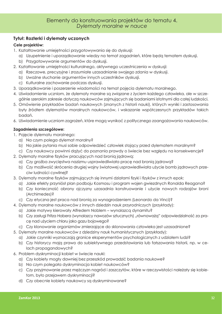 Elementy do konstruowania projektów do tematu 4. Dylematy moralne w nauce Tytuł: Rozterki i dylematy uczonych Cele projektów: 1. Kształtowanie umiejętności przygotowywania się do dyskusji: a) Uzupełnienie i uporządkowanie wiedzy na temat zagadnień, które będą tematem dyskusji. b) Przygotowywanie argumentów do dyskusji. 2. Kształtowanie umiejętności kulturalnego, aktywnego uczestniczenia w dyskusji: a) Rzeczowe, precyzyjne i zrozumiałe uzasadnianie swojego zdania w dyskusji. b) Uważne słuchanie argumentów innych uczestników dyskusji. c) Kulturalne zachowanie podczas dyskusji. 3. Uporządkowanie i poszerzenie wiadomości na temat pojęcia dylematu moralnego. 4. Uświadomienie uczniom, że dylematy moralne są związane z życiem każdego człowieka, ale w szczególnie szerokim zakresie dotyczą naukowców zajmujących się badaniami istotnymi dla całej ludzkości. 5. Omówienie przykładów badań naukowych (znanych z historii nauki), których wyniki i zastosowania były źródłem dylematów moralnych naukowców, i wskazanie współczesnych przykładów takich badań. 6. Uświadomienie uczniom zagrożeń, które mogą wynikać z politycznego zaangażowania naukowców. Zagadnienia szczegółowe: 1. Pojęcie dylematu moralnego: a) Na czym polega dylemat moralny? b) Na jakie pytania musi sobie odpowiedzieć człowiek stojący przed dylematem moralnym? c) Czy naukowcy powinni dążyć do poznania prawdy o świecie bez względu na konsekwencje? 2. Dylematy moralne fizyków pracujących nad bronią jądrową: a) Czy groźba zwycięstwa nazizmu usprawiedliwiała pracę nad bronią jądrową? b) Czy możliwość skrócenia drugiej wojny światowej usprawiedliwiała użycie bomb jądrowych przeciw ludności cywilnej? 3. Dylematy moralne fizyków zajmujących się innymi działami fizyki i fizyków z innych epok: a) Jakie efekty przyniósł plan podboju Kosmosu i program wojen gwiezdnych Ronalda Reagana? b) Czy konieczność obrony ojczyzny uzasadnia konstruowanie i użycie nowych rodzajów broni (Archimedes)? c) Czy etyczna jest praca nad bronią za wynagrodzeniem (Leonardo da Vinci)? 4. Dylematy moralne naukowców z innych dziedzin nauk przyrodniczych (przykłady): a) Jakie motywy kierowały Alfredem Noblem – wynalazcą dynamitu? b) Czy zasługi Fritza Habera (wynalazcy nawozów sztucznych) „równoważą” odpowiedzialność za pracę nad użyciem chloru jako gazu bojowego? c) Czy klonowanie organizmów zmierzające do sklonowania człowieka jest uzasadnione? 5. Dylematy moralne naukowców z dziedziny nauk humanistycznych (przykłady): a) Jakie czynniki wyznaczają granice eksperymentów psychologicznych z udziałem ludzi? b) Czy historycy mają prawo do subiektywnego przedstawiania lub fałszowania historii, np. w celach propagandowych? 6. Problem dyskryminacji kobiet w świecie nauki: a) Czy kobiety mogły dawniej bez przeszkód prowadzić badania naukowe? b) Na czym polegała dyskryminacja kobiet naukowców? c) Czy przyjmowanie przez mężczyzn nagród i zaszczytów, które w rzeczywistości należały się kobietom, było przejawem dyskryminacji? d) Czy obecnie kobiety naukowcy są dyskryminowane? ZamKor 2013 32 7. Problem pierwszeństwa odkryć naukowych i uczciwości w nauce: a) Czy niesłuszne przypisywanie sobie pierwszeństwa w odkryciu zjawisk fizycznych i sformułowaniu teorii naukowej jest zawsze jednakowo naganne? b) Czy jest to równoważne z przypisywaniem sobie cudzych osiągnięć? c) Jakie motywy mogą kierować naukowcami przypisującymi sobie pierwszeństwo odkryć? d) Jakie motywy mogą kierować naukowcami przypisującymi sobie cudze odkrycia? e) Jakimi cechami osobowości powinni się wyróżniać naukowcy? 8. Naukowcy a polityka: a) Czy naukowcy powinni się angażować w politykę? b) Czy jednostronne rozbrojenie państw zachodnich było wskazane? Literatura ogólna: • Fiałkowski Krzysztof, Burda Zdzisław, Świat przyrody. E-podręcznik dla szkół ponadgimnazjalnych, ZamKor, Kraków 2013. • Fiałkowski Andrzej, Fiałkowski Krzysztof, Fizyka w świecie przedstawionym, ZamKor, Kraków 2013. Literatura do poszczególnych elementów projektu: ad 1 • Bryk.pl. Strefa wiedzy (online), www.bryk.pl › Pozostałe › Filozofia. • Paszewski Andrzej, Sukcesy naukowe biologów a problemy etyczne (online), www.pm.microbiology. pl/web/archiwum/etyka.pdf [dostęp: 7.02.2013]. • Rzońca Maciej, Między prawdą a dobrem (wywiad z prof. Zofią Ratajczak) (online), gu.us.edu.pl/ node/204361 [dostęp: 7.02.2013]. ad 2 • Dürrenmatt Friedrich, Fizycy (razem z Wizytą starszej pani), PIW, Warszawa 1995. • Feynman Richard P., Pan raczy żartować, panie Feynman!, Znak, Kraków 2007. • Frayn Michael, Kopenhaga – tekst sztuki drukowany w „Dialogu” 6/2000 w tłumaczeniu Małgorzaty Semil (dostępne nagranie: Teatr TV w cyklu Scena Świata, spektakl BBC pt. Kopenhaga Michaela Frayna w reżyserii Howarda Daviesa, z Danielem Craigiem w roli niemieckiego fizyka Wernera Heisenberga. Premiera emitowana 28 kwietnia 2008 roku w TVP1). • Jungk Robert, Jaśniej niż tysiąc słońc: losy badaczy atomu, PIW, Warszawa 1967. • Lem Stanisław, Głos Pana, Czytelnik, Warszawa 1970. • Pratchett Terry, Piąty elefant, Prószyński i S-ka, Warszawa 2006. • Sciascia Leonardo, Zniknięcie Majorany, PAX, Warszawa 1985. • Ulam Stanisław, Przygody matematyka, Prószyński i S-ka, Warszawa 1996. • Walker Mark, Bomba atomowa Hitlera. Mit i prawda o nazistowskiej fizyce jądrowej, Amber, Warszawa 1999. ad 3 • Puzo Mario, Rodzina Borgiów, Albatros, Warszawa 2011. • Wielkie postacie historii, [w:] Historia – portal (online), www.historia.info.pl/postacie/archimedes.html [dostęp: 7.02.2013]. ad 4 • Alfred Nobel, [w:] Nobliści.pl. Laureaci Nagrody Nobla (online), www.noblisci.pl/alfred-nobel [dostęp: 7.02.2013]. • Fritz Haber, [w:] Wikipedia (online), pl.wikipedia.org/wiki/Fritz_Haber [dostęp: 7.02.2013]. • Klonowanie – stanowiska za i przeciw