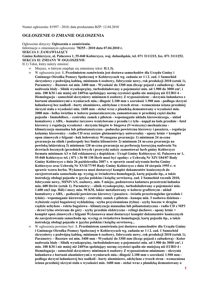 Numer ogłoszenia: 81997 - 2010; data przekazania BZP: 12.04.2010 OGŁOSZENIE O ZMIANIE OGŁOSZENIA Ogłoszenie dotyczy: Ogłoszenia o zamówieniu. Informacje o zmienianym ogłoszeniu: 78255 - 2010 data 07.04.2010 r. SEKCJA I: ZAMAWIAJĄCY Gmina Kobierzyce, al. Pałacowa 1, 55-040 Kobierzyce, woj. dolnośląskie, tel. 071 3111215, fax. 071 3111252. SEKCJA II: ZMIANY W OGŁOSZENIU II.1) Tekst, który naleŜy zmienić: • Miejsce, w którym znajduje się zmieniany tekst: II.1.3). • W ogłoszeniu jest: 1. Przedmiotem zamówienia jest dostawa samochodów dla Urzędu Gminy i Gminnego Ośrodka Pomocy Społecznej w Kobierzycach wg. zadania nr 1 i 2. zad. 1 Samochód skrzyniowy z podwójną kabiną, minimum 6 osobowy, fabrycznie nowy, rok produkcji 2010 (sztuk 1). Parametry: - Rozstaw osi min. 3400 mm - Wysokość do 3300 mm (licząc pojazd z zabudową) - Kolor nadwozia biały - Silnik wysokopręŜny, turbodoładowany o pojemności min. od 1.900 do 3000 cm³, i min. 100 KM i nie mniej niŜ 240Nm spełniający normę czystości spalin nie mniejszą niŜ EURO 4 Homologacja - samochód skrzyniowy minimum 6 osobowy Z wyposaŜeniem: - skrzynia ładunkowa z burtami aluminiowymi o wymiarach min.: długość 2.100 mm x szerokość 1.900 mm - podłoga skrzyni ładunkowej bez nadkoli - burty aluminiowe, odchylane z trzech stron - wzmocniona ściana przedniej skrzyni stała o wysokości min. 1600 mm - stelaŜ wraz z plandeką demontowany o wysokości min. 2000 mm - belka świetlna w kolorze pomarańczowym, zamontowana w przedniej części dachu pojazdu - Immobiliser, - centralny zamek z pilotem - wspomaganie układu kierowniczego, - układ hamulcowy z ABS, - hamulce tarczowe wentylowane z przodu i z tyłu - napęd na koła przednie - fotel kierowcy z regulacją wysokości - skrzynia biegów 6- biegowa (5+wsteczny) mechaniczna klimatyzacja manualna lub półautomatyczna - poduszka powietrzna kierowcy i pasaŜera, - regulacja kolumny kierownicy - radio CD oraz zestaw głośnomówiący uniwersalny - opony letnie + komplet opon zimowych z felgami - hak holowniczy Wymagana gwarancja: 1) minimum 24 m-czna gwarancja na silnik i podzespoły bez limitu kilometrów 2) minimum 24 m-czna gwarancja na powłoką lakierniczą 3) minimum 120 m-czna gwarancja na perforację korozyjną nadwozia Na drzwiach bocznych (przednich lewych i prawych) naleŜy zamontować herb gminy Kobierzyce formatu minimum A3 w foli reklamowej z dopiskiem : Urząd Gminy Kobierzyce Al. Pałacowa nr 1, 55-040 Kobierzyce tel. ( 071 ) 36 98 130 Herb musi być zgodny: z Uchwałą Nr XIV/184/07 Rady Gminy Kobierzyce z dnia 26 października 2007 r. w sprawie zasad uŜywania herbu Gminy Kobierzyce oraz Uchwałą Nr XVII/77/95 Rady Gminy Kobierzyce z dnia 10 sierpnia 1995 r. w sprawie wzoru herbu. Wykonawca musi dostarczyć komplet dokumentów koniecznych do zarejestrowania samochodu np. wyciąg ze świadectwa homologacji, kartę pojazdu itp., a takŜe instrukcję obsługi pojazdu w języku polskim i ksiąŜkę serwisową. zad. 2 Samochód rocznik 2010, fabrycznie nowy, MINIVAN, osobowy, min. 5 miejsc, podstawowa kubatura przestrzeni ładunku min. 600 litrów (sztuk 1). Parametry: - silnik wysokopręŜny, turbodoładowany o pojemności min. 1.600 cm3 (np. Hdi) i mocy min. 90 KM, lakier metalizowany w kolorze grafitowym - układ hamulcowy z ABS, - poduszki powietrzne kierowcy i pasaŜera - światła przeciwmgielne (przednie i tylnie) - wspomaganie kierownicy - centralny zamek z pilotem - kanapa min. 3 osobowa dzielona wyłoŜenie części bagaŜowej wykładziną - szyba przyciemniona (tylna) - szyby boczne w drugim rzędzie uchylone - roleta bagaŜowa - klimatyzacja manualna lub półautomatyczna - radio CD z MP3 - drzwi tylne otwierane do góry - szyby przednie elektryczne - relingi dachowe - opony letnie + komplet opon zimowych z felgami Wykonawca musi dostarczyć komplet dokumentów koniecznych do zarejestrowania samochodu np. wyciąg ze świadectwa homologacji, kartę pojazdu itp., a takŜe instrukcję obsługi pojazdu w języku polskim i ksiąŜkę serwisową... • W ogłoszeniu powinno być: 1. Przedmiotem zamówienia jest dostawa samochodów dla Urzędu Gminy i Gminnego Ośrodka Pomocy Społecznej w Kobierzycach wg. zadania nr 1 i 2. zad. 1 Samochód skrzyniowy z podwójną kabiną, minimum 6 osobowy, fabrycznie nowy, rok produkcji 2010 (sztuk 1). Parametry: - Rozstaw osi min. 3400 mm - Wysokość do 3300 mm (licząc pojazd z zabudową) - Kolor nadwozia biały - Silnik wysokopręŜny, turbodoładowany o pojemności min. od 1.900 do 3000 cm³, i min. 100 KM i nie mniej niŜ 240Nm spełniający normę czystości spalin nie mniejszą niŜ EURO 4 Homologacja - samochód skrzyniowy minimum 6 osobowy Z wyposaŜeniem minimum: - skrzynia ładunkowa z burtami aluminiowymi o wymiarach min.: długość 2.100 mm x szerokość 1.900 mm podłoga skrzyni ładunkowej bez nadkoli - burty aluminiowe, odchylane z trzech stron - wzmocniona ściana przedniej skrzyni stała o wysokości min. 1600 mm - stelaŜ wraz z plandeką demontowany o 1 • • • wysokości min. 2000 mm - belka świetlna w kolorze pomarańczowym, zamontowana w przedniej części dachu pojazdu - Immobiliser, - centralny zamek z pilotem - wspomaganie układu kierowniczego, - układ hamulcowy z ABS, - hamulce tarczowe przód i tył, przód wentylowane napęd na koła przednie - fotel kierowcy z regulacją wysokości - skrzynia biegów 6- biegowa (5+wsteczny) mechaniczna - klimatyzacja manualna lub półautomatyczna - poduszka powietrzna kierowcy, - regulacja kolumny kierownicy - radio CD oraz zestaw głośnomówiący uniwersalny opony letnie + komplet opon zimowych z felgami - hak holowniczy Wymagana gwarancja: 1) minimum 24 m-czna gwarancja na silnik i podzespoły bez limitu kilometrów 2) minimum 24 m-czna gwarancja na powłoką lakierniczą 3) minimum 120 m-czna gwarancja na perforację korozyjną nadwozia Na drzwiach bocznych (przednich lewych i prawych) naleŜy zamontować herb gminy Kobierz