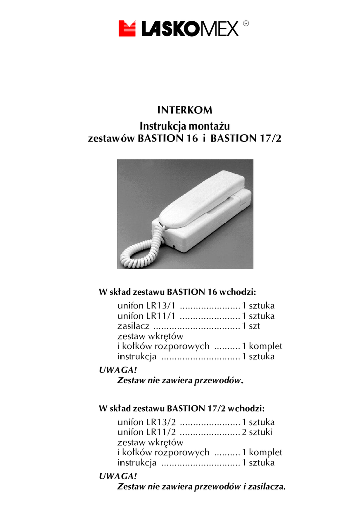 ® INTERKOM Instrukcja monta… u zestawÖ w BASTION 16 i BASTION 17/2 W skÔ ad zestawu BASTION 16 wchodzi: unifon LR13/1 ....................... 1 sztuka unifon LR11/1 ....................... 1 sztuka zasilacz ................................. 1 szt zestaw wkrÓ Öt w i koÔ kÖ w rozporowych .......... 1 komplet instrukcja .............................. 1 sztuka UWAGA! ZestawniezawieraprzewodÖ w. W skÔ ad zestawu BASTION 17/2 wchodzi: unifon LR13/2 ....................... 1 sztuka unifon LR11/2 .......................2 sztuki zestaw wkrÓ Öt w i koÔ kÖ w rozporowych .......... 1 komplet instrukcja .............................. 1 sztuka UWAGA! ZestawniezawieraprzewodÖ wizasilacza. 2 1. WybÖ r konfiguracji Interkom Bastion mo… na skonfigurowaÒ na Ör … ne sposoby. W przypadku zestawu Bastion 16 z dwoma unifonami nie ma wyboru,ÔÑ czymyje przewodem sze× cio… yÔ owym lub lepiej dziesiÓ cio… yÔ owym aby mieÒ zapas na wypadek uszkodzenia ktÖ rej× … yÔ y. Zesaw Bastion 17 z trzema lub wiÓ cej unifonami, w zale… no× ci od tego, jakjest wygodniej prowadziÒ przewody, mo… naÔÑ czyÒ w gwiazdÓ (rys.1) lub liniowo (rys.2). W ten sposÖ b mo… na zrealizowaÒÔÑ czno×Ò pomiÓ dzy trzema unifonami lub grupami unifonÖ w. NaciskajÑ c na unifonie przycisk wywoÔ ania wewnÓ trznego mo… emy wywoÔ aÒ inny unifon i prowadziÒ rozmowÓ . Ilo×Ò wywoÔ ywanych unifonÖ w limitowana jest ilo× ciÑ przyciskÖ w wywoÔ ania na unifonie, jednak do ka… dego unifonuj mo… na przyÔÑ czyÒ Ör wnolegle dodatkowe unifony typu np. LR-11/2 uwa… ajÑ c, aby sumarycza ilo×Ò unifonÖ w w systemie nie przekroczyÔ a dziesiÓ ciu. Wszystkie unifony powstaÔ ej w ten sposÖ b grupy bÓ dÑ dzwoniÔ y Ör wnocze× nie. GRUPA1 TR GRUPA 2 GRUPA 3 LR- 11/2 LR- 11/2 LR- 11/2 LR- 11/2 LR- 13/2 GRUPA1 LR- 11/2 LR- 11/2 LR- 11/2 LR- 11/2 LR- 13/2 LR- 11/2 GRUPA 2 LR- 11/2 Rys. 1 PodÔÑ czania unifonÖ w do interkomu Bastion - sposÖ b „w gwiazdÓ ” GRUPA 3 TR Rys. 2 PodÔÑ czania unifonÖ w do interkomu Bastion - sposÖ b „liniowy” 3 2. WybÖ r miejsca zamontowania urzÑ dzeÕ W domu unifony montujemy w dogodnym miejscu, najczÓ× ciej jeden w przedpokoju, nastÓ pne na piÓ trze, w gara… u lub u sÑ siada. W firmie bÓ dzie to np. biuro, sekretariat, magazyn, sklep itp. Zasilacz staÔ y montujemy np. w przedpokoju, w pobli… u gniazdka sieciowego, tak aby wygodnie doprowadziÒ zasilanie do unifonu gÔÖ wnego. Zasilacz przeno× ny wtykamy po prostu do najbli… szego gniazdka sieciowego. 3. DobÖ r przewodÖ w UnifonyÔÑ czymy miÓ dzy sobÑ przewodemem domofonowym sze× cio… yÔ owym (BASTION 16), siedmio… yÔ owym (BASTION 17/2) lub lepiej dziesiÓ cio… yÔ owym 2 (aby mieÒ … yÔ y rezerwowe) o przekroju 0,2 mm (Ø 0,5 mm) np. typu YTDY, TKSY, LIYY-P lub podobnym. Najlepiej wybraÒ przewÖ d, w ktÖ rym ka… da… yÔ a ma inny kolor izolacji, co znacznie uÔ atwi monta… . 4. DobÖ r zasilacza Do zestawu BASTION 17/2 nale… y dokupiÒ sieciowy niestabilizowany zasilacz prÑ du zmiennego o nastÓ pujÑ cych parametrach: moc − 10 VA, napiÓ cie pierwotne − 220V, napiÓ cie wtÖ rne − 12V. Powinien on byÒ wyposa… ony we wtyczkÓ sieciowÑ 220V. Rodzaj wtyczki 12V nie ma znaczenia, poniewa… podÔÑ czajÑ c zasilacz do zestawu wtyczkÓ 12V odcinamy, a przewody podÔÑ czamy pod odpowiednie zaciski× rubowe za pomocÑ wkrÓ taka. Przez nas oferowanyjest zasilacz typu SPZ 10VA/11,5VAC. 5. Mocowanie iÔÑ czenie urzÑ dzeÕ PrzewÖ dÔÑ czÑ cy unifony najlepiej poprowadziÒ w korytkach monta… owych, rurkach, natynkowo − mocujÑ c do× ciany odpowiednimi uchwytami lub podtynkowo. − OdkrÓ ciÒ wkrÓ t mocujÑ cy pokrywÓ unifonu gÔÖ wnego LR-13, zdjÑÒ pokrywÓ i przyciski oraz wyjÑÒ koÔ ki rozporowe. PodstawÓ unifonu przystawiÒ do× ciany w wybranym miejscu i zaznaczyÒ miejsca wiercenia otworÖ w do mocowania i otworu do wprowadzenia przewodÖ w. Otwory do mocowania wierciÒ wiertÔ em widiowym Ø6 mm. WprowadziÒ koÕ cÖ wki przewodÖ w (od pozostaÔ ych unifonÖ w i zasilacza) przez prostokÑ tny otwÖ r w podstawie unifonu lub przez otwÖ r w dole podstawy, podstawÓ przykrÓ ciÒ do× ciany. − UsunÑÒ oponÓ przewodu dziesiÓ cio… yÔ owego na dÔ ugo× ci ok. 10 cm i z koÕ cÖ wek … yÔ usunÑÒ izolacjÓ na dÔ ugo× ci ok. 8 mm. Z przewodu od zasilacza zdjÑÒ oponÓ na dÔ ugo× ci ok. 5 cm a… yÔ y obraÒ z izolacji na dÔ ugo× ci ok. 8 mm,… yÔ y dobrze skrÓ ciÒ i przyÔÑ czyÒ do zaciskÖ w S1 i S2 (obojÓ tnie, ktÖ ry do ktÖ rego); pozostaÔ e … yÔ y podÔÑ czyÒ zgodnie ze schematem (rys. 8 i 9) notujÑ c, jakie kolory… yÔ sÑ 4 Rys. 3 SposÖ b podÔÑ czania przewodÖ w do zaciskÖ w× rubowych przyÔÑ czone do jakich zaciskÖ w. ÉyÔ y podÔÑ czaÒ do zaciskÖ w wedÔ ug rysunku 3. W unifonie LR-13 sÑ dwa zaciski oznaczone „4”, sÑ one wewnÓ trznie poÔÑ czone, wiÓ c jest obojÓ tne, do ktÖ rego podÔÑ czymy przewody. − Analogicznie przykrÓ ciÒ do× ciany unifony typu LR-11 i podÔÑ czyÒ wedÔ ug schematu, pamiÓ tajÑ c o zgodno× ci kolorÖ w… yÔ przyÔÑ czonych do odpowiednich zaciskÖ w. − SprawdziÒ jeszcze raz prawidÔ owo×Ò poÔÑ czeÕ , zaÔ o… yÒ przyciski na mikroÔÑ czniki i zamknÑÒ unifon wkrÓ cajÑ c wkrÓ t mocujÑ cy. − Zasilacz przykrÓ ciÒ do× ciany dwoma wkrÓ tami z koÔ kami rozporowymi. − WÔ o… yÒ wtyczkÓ zasilacza do gniazdka sieciowego i wyprÖ bowaÒ dziaÔ anie zestawu. 6. Sprawdzenie i regulacja − SprawdzamyÔÑ czno×Ò , wywoÔ ujemy kolejno inne unifony (koniecznie po uprzednim podniesieniu Ôs uchawki) i przeprowadzamy rozmowÓ . − GÔ o× no×Ò rozmowy mo… emy skorygowaÒ potencjometrem P1 na dolnej pÔ ytce unifonu LR-13 (rys. 4). − Je… eli unifon siÓ wzbudza (sÔ ychaÒ gwizd), to nale… y zmniejszyÒ wzmocnienie rozmowy tym samym regulatorem. 7. Opis techniczny elementÖ w interkomÖ w − un