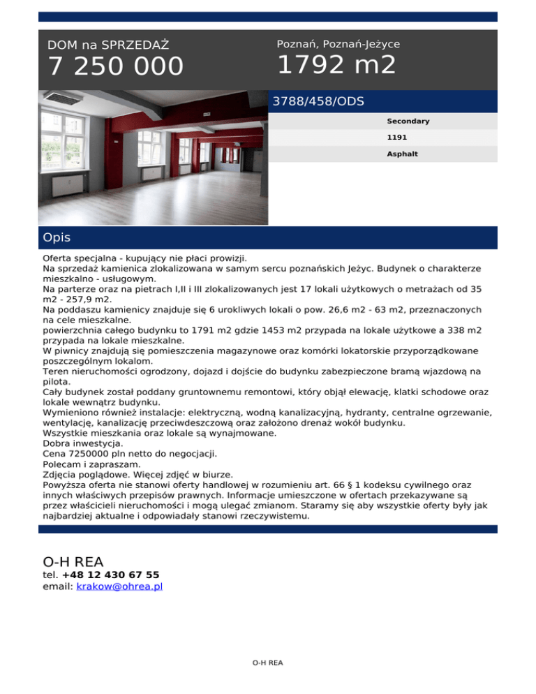 DOM na SPRZEDAŻ 7 250 000 Poznań, Poznań-Jeżyce 1792 m2 3788/458/ODS Secondary 1191 Asphalt Opis Oferta specjalna - kupujący nie płaci prowizji. Na sprzedaż kamienica zlokalizowana w samym sercu poznańskich Jeżyc. Budynek o charakterze mieszkalno - usługowym. Na parterze oraz na pietrach I,II i III zlokalizowanych jest 17 lokali użytkowych o metrażach od 35 m2 - 257,9 m2. Na poddaszu kamienicy znajduje się 6 urokliwych lokali o pow. 26,6 m2 - 63 m2, przeznaczonych na cele mieszkalne. powierzchnia całego budynku to 1791 m2 gdzie 1453 m2 przypada na lokale użytkowe a 338 m2 przypada na lokale mieszkalne. W piwnicy znajdują się pomieszczenia magazynowe oraz komórki lokatorskie przyporządkowane poszczególnym lokalom. Teren nieruchomości ogrodzony, dojazd i dojście do budynku zabezpieczone bramą wjazdową na pilota. Cały budynek został poddany gruntownemu remontowi, który objął elewację, klatki schodowe oraz lokale wewnątrz budynku. Wymieniono również instalacje: elektryczną, wodną kanalizacyjną, hydranty, centralne ogrzewanie, wentylację, kanalizację przeciwdeszczową oraz założono drenaż wokół budynku. Wszystkie mieszkania oraz lokale są wynajmowane. Dobra inwestycja. Cena 7250000 pln netto do negocjacji. Polecam i zapraszam. Zdjęcia poglądowe. Więcej zdjęć w biurze. Powyższa oferta nie stanowi oferty handlowej w rozumieniu art. 66 § 1 kodeksu cywilnego oraz innych właściwych przepisów prawnych. Informacje umieszczone w ofertach przekazywane są przez właścicieli nieruchomości i mogą ulegać zmianom. Staramy się aby wszystkie oferty były jak najbardziej aktualne i odpowiadały stanowi rzeczywistemu. O-H REA tel. +48 12 430 67 55 email: [email protected] O-H REA Powered by TCPDF (www.tcpdf.org)