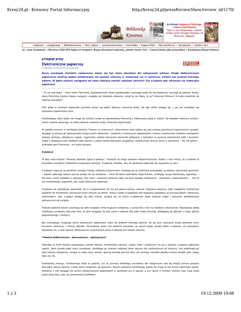 Kresy24.pl - Kresowy Portal Informacyjny http://kresy24.pl/pressReviewShow/review_id/1170/ Archiwum Magazynu Polskiego i Głosu znad Niemna Tylko u nas! Najnowsze i dawne numery pism Związku Polaków na Białorusi. Zobacz! wiadomości | przegląd prasy | Biblioteka Kresowa | filmy i zdjęcia | wyszukiwarka kresowa | Karta Polaka | Magazyn Polski | Głos znad Niemna | linki polonijne | kontakt z nami iałoruś: ruina finansowa! • Rocznice OUN-UPA będą ich świętami •Rosja oburzona kradzieżą „Arbeit macht frei" • Cenią Stalina jako przywódcę • Wyedukują Rosjan historyczni przegląd prasy Elektroniczne papierosy 14.08.2008, 12:28:38, Hilmar Schmundt Nowy wynalazek chińskich naukowców stanie się być może ratunkiem dla nałogowych palaczy. Dzięki elektronicznym papierosom możliwe będzie delektowanie się oparami nikotyny w restauracji czy w samolocie. Zniknie też problem biernego palenia. W jakim stopniu zaciąganie się samą nikotyną szkodzi naszemu zdrowiu? Czy e-palenie jest zdrowsze niż tradycyjne papierosy? - To nie jest fajka - mówi Ulrike Flemming, businesswoman około pięćdziesiątki, wsuwając sobie do ust plastikowy przyrząd do palenia. Rurka, którą Flemming trzyma między wargami, wygląda jak dziecięca zabawka. Jeżeli to nie fajka, to co? Rekwizyt filmowy? A może przedmiot do robienia dowcipów? Tam gdzie w zwykłym papierosie powinien żarzyć się ogień, błyszczy czerwona dioda, ale gdy Ulrike zaciąga się, z jej ust wydostaje się prawdziwy papierosowy dym. Przechodzący obok ludzie nie mogą nie zwrócić uwagi na ognistowłosą Flemming z elektryczną fajką w ustach. Na dodatek rubinowy amulet i czarne ubranie sprawiają, że Ulrike sprawia wrażenie osoby niezwykle tajemniczej. W ogródku piwnym w berlińskiej dzielnicy Treptow na masywnym, drewnianym stole piętrzy się cały arsenał przeróżnych tajemniczych narzędzi. Wygląda to prawie jak disneyowska wersja kuchni alchemika - probówki z kolorowymi substancjami, kartony oznakowane chińskimi symbolami, aparaty sieciowe, plastikowe cygara, cygarniczki, zdalnie sterowane parowniki połączone z bateriami za pomocą przeróżnych kabli i drucików. Każdy z siedzących przy stolikach ludzi trzyma w ustach jakieś dziwaczne urządzenie i wydmuchuje chmury dymu w powietrze. - My nie palimy podkreśla pani Flemming - my sobie pykamy. E-palacze W lipcu miał miejsce "Pierwszy Berliński Zjazd E-palaczy". Przybyło na niego sześcioro wtajemniczonych. Każdy z nich wierzy, że e-palenie to przyszłość wszystkich miłośników konsumpcji nikotyny. E-palacze chcieliby, aby ich spotkania odbywały się regularnie co roku. E-palacze mają się za pionierów nowego rodzaju cielesnej przyjemności. Uważają się za tytoniową awangardę, za palaczy najnowszej generacji. - Zapach palonego tytoniu jest po prostu nie do zniesienia - mówi 40-letnia sekretarka Maja Reinke, cmokając swoją elektryczną cygaretkę. Od czasu, kiedy zostałam e-palaczką, mój węch i wrażenia smakowe stały się dużo bardziej intensywne - przyznaje z zadowoleniem. - Jest to już wystarczający argument, aby rzucić tradycyjne papierosy. E-palacze nie potrzebują zapalniczki, bo w e-papierosach nie ma ani grama tytoniu, jedynie rozpylona nikotyna. Całe urządzenie funkcjonuje podobnie do inhalatorów używanych przez chorych na astmę. Jedną z części e-papierosa jest rozpylacz napędzany za pomocą baterii i sterowany mikrochipem. Gdy e-palacz zaciąga się zbyt mocno, żarząca się na końcu e-papierosa dioda zaczyna migać i parownik profilaktycznie samoczynnie się wyłącza. Podczas spalania tytoniu uwalniają się setki rodzajów silnie trujących substancji, a ponad 50 z nich ma działanie rakotwórcze. Największą zaletą chińskiego wynalazku jest więc fakt, że dym wciągany do płuc przez e-palacza jest tylko małą chmurką, składającą się głównie z wody, glikolu propylenowego i nikotyny. Bez cuchnącego, trującego dymu klasycznych papierosów znika też problem biernego palenia. Do tej pory najwięcej uwagi poświęcili temu tematowi naukowcy z Nowej Zelandii. Prowadzone przez nich badania wykazały, że nawet będąc bardzo blisko e-palacza, nie poczujemy absolutnie nic, a ilość oparów nikotynowych wydychanych przez e-palacza jest bardzo znikoma. "Palenie elektroniczne - ekonomiczne - ekologiczne". Wszystko to brzmi bardzo zachęcająco, jednak lekarze, ministerstwa zdrowia, urzędy celne i producenci nie są w sprawie e-palenia całkowicie zgodni. Jedni chwalą sobie nowy wynalazek, określając go mianem ostatniej deski ratunku dla uzależnionych od nikotyny, inni przeklinają go jako kolejne obciążenie, niosące ze sobą nowe ryzyko. Sporną kwestią jest też fakt, czy dymiący kawałek plastiku można określić jako rodzaj fajki czy nie. Konkretniej mówiąc, kontrowersje budzi tu pytanie, czy za pomocą chińskiego wynalazku dla nałogowców uda się obejść surowe przepisy dotyczące zakazu palenia. I tutaj opinie ekspertów są sprzeczne. Nawet uczestnicy berlińskiego zjazdu nie mają na ten temat wspólnego zdania. Niektórzy z nich zaciągali się swoimi elektronicznymi papierosami w samolocie czy w operze, a inni nawet w mroźne, zimowe noce wolą wyjść przed drzwi baru, aby nie prowokować konfliktów. 1z3 19.12.2009 19:08 Kresy24.pl - Kresowy Portal Informacyjny http://kresy24.pl/pressReviewShow/review_id/1170/ Wielu internetowych sprzedawców e-papierosów prowadzi swoją działalność w szarej strefie i kuszącymi obietnicami mydli oczy klientom, reklamując towar hasłami: "Zdrowe palenie wszędzie gdzie zapragniesz", "Delektuj się zdrowym papierosem, kiedy tylko chcesz" albo "Palenie elektroniczne - ekonomiczne - ekologiczne". Czy jednak elektroniczne papierosy rzeczywiście są oszczędne, przyjazne środowisku i zdrowe? Ich rynek jest na razie niezbyt przejrzysty, dużo tu szachrowania, mydlenia oczu i partactwa. Szwajcarski producent elektronicznyc