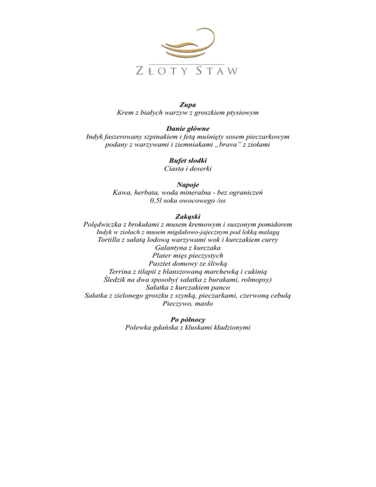 Zupa Krem z białych warzyw z groszkiem ptysiowym Danie główne Indyk faszerowany szpinakiem i fetą muśnięty sosem pieczarkowym podany z warzywami i ziemniakami „brava” z ziołami Bufet słodki Ciasta i deserki Napoje Kawa, herbata, woda mineralna - bez ograniczeń 0,5l soku owocowego /os Zakąski Polędwiczka z brokułami z musem kremowym i suszonym pomidorem Indyk w ziołach z musem migdałowo-jajecznym pod lekką malagą Tortilla z sałatą lodową warzywami wok i kurczakiem curry Galantyna z kurczaka Plater mięs pieczystych Pasztet domowy ze śliwką Terrina z tilapii z blanszowaną marchewką i cukinią Śledzik na dwa sposoby( sałatka z burakami, rolmopsy) Sałatka z kurczakiem panco Sałatka z zielonego groszku z szynką, pieczarkami, czerwoną cebulą Pieczywo, masło Po północy Polewka gdańska z kluskami kładzionymi