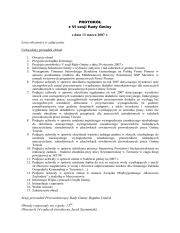 PROTOKÓŁ z VI sesji Rady Gminy z dnia 13 marca 2007 r. Lista