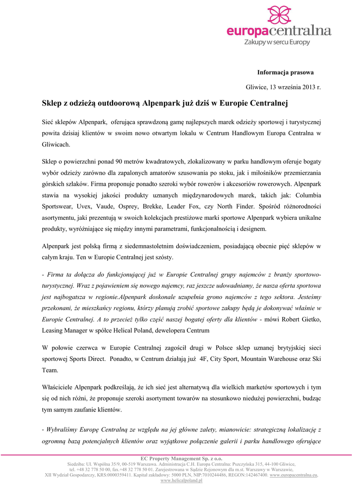 Informacja prasowa Gliwice, 13 września 2013 r. Sklep z odzieżą outdoorową Alpenpark już dziś w Europie Centralnej Sieć sklepów Alpenpark, oferująca sprawdzoną gamę najlepszych marek odzieży sportowej i turystycznej powita dzisiaj klientów w swoim nowo otwartym lokalu w Centrum Handlowym Europa Centralna w Gliwicach. Sklep o powierzchni ponad 90 metrów kwadratowych, zlokalizowany w parku handlowym oferuje bogaty wybór odzieży zarówno dla zapalonych amatorów szusowania po stoku, jak i miłośników przemierzania górskich szlaków. Firma proponuje ponadto szeroki wybór rowerów i akcesoriów rowerowych. Alpenpark stawia na wysokiej jakości produkty uznanych międzynarodowych marek, takich jak: Columbia Sportswear, Uvex, Vaude, Osprey, Brekke, Leader Fox, czy North Finder. Spośród różnorodności asortymentu, jaki prezentują w swoich kolekcjach prestiżowe marki sportowe Alpenpark wybiera unikalne produkty, wyróżniające się między innymi parametrami, funkcjonalnością i designem. Alpenpark jest polską firmą z siedemnastoletnim doświadczeniem, posiadającą obecnie pięć sklepów w całym kraju. Ten w Europie Centralnej jest szósty. - Firma ta dołącza do funkcjonującej już w Europie Centralnej grupy najemców z branży sportowoturystycznej. Wraz z pojawieniem się nowego najemcy, raz jeszcze udowadniamy, że nasza oferta sportowa jest najbogatsza w regionie.Alpenpark doskonale uzupełnia grono najemców z tego sektora. Jesteśmy przekonani, że mieszkańcy regionu, którzy planują zrobić sportowe zakupy będą je dokonywać właśnie w Europie Centralnej. A to przecież tylko część naszej bogatej oferty dla klientów - mówi Robert Gietko, Leasing Manager w spółce Helical Poland, dewelopera Centrum W połowie czerwca w Europie Centralnej zagościł drugi w Polsce sklep uznanej brytyjskiej sieci sportowej Sports Direct. Ponadto, w Centrum działają już 4F, City Sport, Mountain Warehouse oraz Ski Team. Właściciele Alpenpark podkreślają, że ich sieć jest alternatywą dla wielkich marketów sportowych i tym się od nich różni, że proponuje szeroki asortyment towarów na stosunkowo niedużej powierzchni, budząc tym samym zaufanie klientów. - Wybraliśmy Europę Centralną ze względu na jej główne zalety, mianowicie: strategiczną lokalizację z ogromną bazą potencjalnych klientów oraz wyjątkowe połączenie galerii i parku handlowego oferujące EC Property Management Sp. z o.o. Siedziba: Ul. Wspólna 35/9, 00-519 Warszawa. Administracja C.H. Europa Centralna: Pszczyńska 315, 44-100 Gliwice, tel. +48 32 778 50 00, fax.+48 32 778 50 01. Zarejestrowana w Sądzie Rejonowym dla m.st. Warszawy w Warszawie, XII Wydział Gospodarczy, KRS:0000359411. Kapitał zakładowy: 5000 PLN, NIP:7010244486, REGON:142467400. www.europacentralna.eu, www.helicalpoland.pl szeroką gamę produktów w atrakcyjnych cenach. Nie bez znaczenia był również fakt, że Centrum stało się magnesem dla sklepów i marek z branży sportowo-turystycznej - mówi Remigiusz Kuś, właściciel Alpenpark. Centrum Handlowe Europa Centralna o powierzchni 67 tys. metrów kwadratowych jest jednym z największych tego typu obiektów komercyjnych w Polsce. Unikalny koncept galerii, oferuje klientom możliwość zrobienia wszystkich niezbędnych zakupów od artykułów spożywczych, przez materiały do budowy domu, po ubrania z najnowszych kolekcji. Położenie obiektu, przy jednym z największych węzłów autostradowych w Polsce (Gliwice-Sośnica), gdzie łączą się autostrady A1 i A4 i droga krajowa nr 44 oraz na obszarze gęsto zaludnionego Górnośląskiego Okręgu Przemysłowego, sprawia, że niemal 5 mln osób może w ciągu godziny dojechać tu na zakupy. Na miejscu skorzystać można z wypożyczalni parasoli, pomieszczeń dla rodziców z dziećmi, 600 miejsc siedzących dla klientów piętra restauracyjnego, paczkomatu, bezpłatnego wi-fi dostępnego na terenie całego Centrum oraz wielu bankomatów i punktów usługowych. Klienci mogą zostawić swój samochód na dużym, liczącym 2,3 tys. miejsc parkingu, a niezmotoryzowani dojadą na zakupy bezpłatnymi liniami autobusowymi. Wśród najemców są takie firmy jak: Saturn, Castorama, Tesco Extra, Jula, Ski Team, Sports Direct, Jysk, SMYK Megastore, RTV Euro AGD, New Yorker, Reserved, H&M, Cubus, Lindex, CCC, Bershka, Solar, Monnari, Clooud, Apart, TUI, Home and You, Super Pharm, Neckermann, Deichmann, City Sport, Mohito, Promod, Cortland Apple Premium Reseller, Stradivarius, Rossmann, TAKKO Fashion, Douglas, a dla najmłodszych - Kinderplaneta. Kontakt dla dziennikarzy: www.europacentralna.eu Helical Poland Sp. z o.o. ul. Wspólna 35/9 00-519 Warszawa Więcej informacji: Marta Chodkowska Tel. 601 244 127 [email protected] Marketing Director C. H .Europa Centralna Katarzyna Skalska Tel. 501 699 261 [email protected] Leasing:: Robert Gietko Tel. 605 451 060 [email protected] Marta Gołębiowska Tel. 663 918 160 [email protected] Cook Communications Tomasz Rożek Tel. 663 171 033 [email protected] Agencja Preria Magdalena Łońska Tel. 605 560 074 [email protected] EC Property Management Sp. z o.o. Siedziba: Ul. Wspólna 35/9, 00-519 Warszawa. Administracja C.H. Europa Centralna: Pszczyńska 315, 44-100 Gliwice, tel. +48 32 778 50 00, fax.+48 32 778 50 01. Zarejestrowana w Sądzie Rejonowym dla m.st. Warszawy w Warszawie, XII Wydział Gospodarczy, KRS:0000359411. Kapitał zakładowy: 5000 PLN, NIP:7010244486, REGON:142467400. www.europacentralna.eu, www.helicalpoland.pl