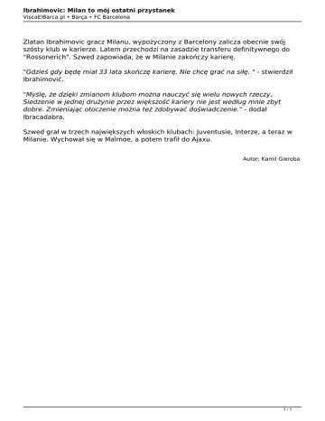 Ibrahimovic: Milan to mój ostatni przystanek ViscaElBarca.pl • Barça • FC Barcelona Zlatan Ibrahimovic gracz Milanu, wypożyczony z Barcelony zalicza obecnie swój szósty klub w karierze. Latem przechodzi na zasadzie transferu definitywnego do "Rossonerich". Szwed zapowiada, że w Milanie zakończy karierę. "Gdzieś gdy będę miał 33 lata skończę karierę. Nie chcę grać na siłę. " - stwierdził Ibrahimović. "Myślę, że dzięki zmianom klubom można nauczyć się wielu nowych rzeczy. Siedzenie w jednej drużynie przez większość kariery nie jest według mnie zbyt dobre. Zmieniając otoczenie można też zdobywać doświadczenie." - dodał Ibracadabra. Szwed grał w trzech największych włoskich klubach: Juventusie, Interze, a teraz w Milanie. Wychował się w Malmoe, a potem trafił do Ajaxu. Autor: Kamil Gieroba 1/1 Powered by TCPDF (www.tcpdf.org)