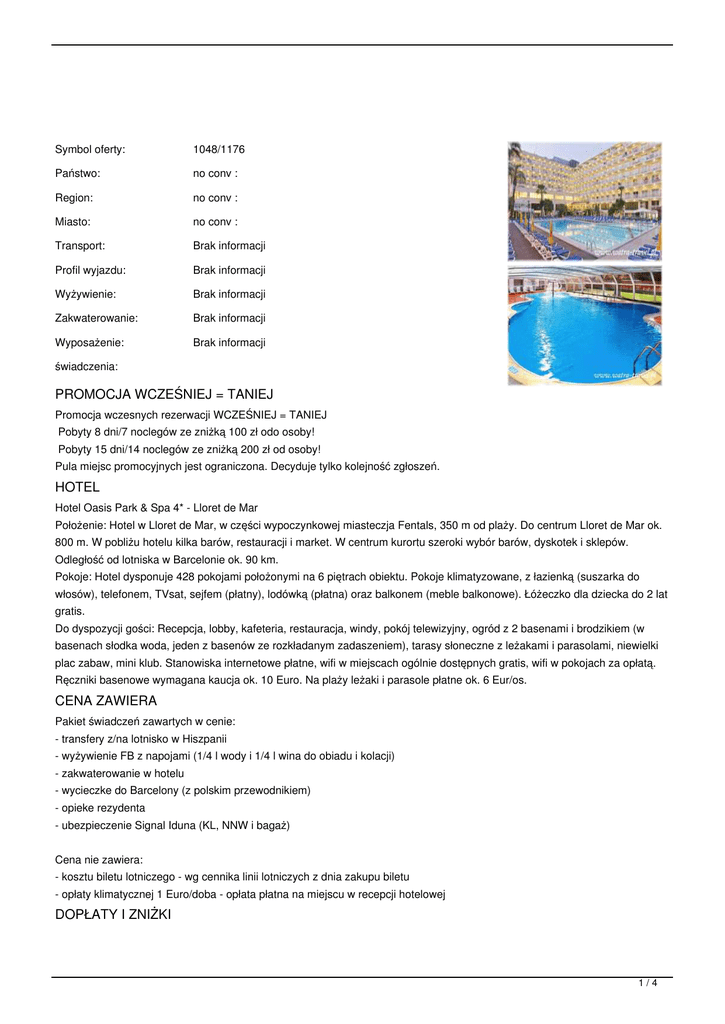 Symbol oferty: 1048/1176 Państwo: no conv : Region: no conv : Miasto: no conv : Transport: Brak informacji Profil wyjazdu: Brak informacji Wyżywienie: Brak informacji Zakwaterowanie: Brak informacji Wyposażenie: Brak informacji świadczenia: PROMOCJA WCZEŚNIEJ = TANIEJ Promocja wczesnych rezerwacji WCZEŚNIEJ = TANIEJ Pobyty 8 dni/7 noclegów ze zniżką 100 zł odo osoby! Pobyty 15 dni/14 noclegów ze zniżką 200 zł od osoby! Pula miejsc promocyjnych jest ograniczona. Decyduje tylko kolejność zgłoszeń. HOTEL Hotel Oasis Park & Spa 4* - Lloret de Mar Położenie: Hotel w Lloret de Mar, w części wypoczynkowej miasteczja Fentals, 350 m od plaży. Do centrum Lloret de Mar ok. 800 m. W pobliżu hotelu kilka barów, restauracji i market. W centrum kurortu szeroki wybór barów, dyskotek i sklepów. Odległość od lotniska w Barcelonie ok. 90 km. Pokoje: Hotel dysponuje 428 pokojami położonymi na 6 piętrach obiektu. Pokoje klimatyzowane, z łazienką (suszarka do włosów), telefonem, TVsat, sejfem (płatny), lodówką (płatna) oraz balkonem (meble balkonowe). Łóżeczko dla dziecka do 2 lat gratis. Do dyspozycji gości: Recepcja, lobby, kafeteria, restauracja, windy, pokój telewizyjny, ogród z 2 basenami i brodzikiem (w basenach słodka woda, jeden z basenów ze rozkładanym zadaszeniem), tarasy słoneczne z leżakami i parasolami, niewielki plac zabaw, mini klub. Stanowiska internetowe płatne, wifi w miejscach ogólnie dostępnych gratis, wifi w pokojach za opłatą. Ręczniki basenowe wymagana kaucja ok. 10 Euro. Na plaży leżaki i parasole płatne ok. 6 Eur/os. CENA ZAWIERA Pakiet świadczeń zawartych w cenie: - transfery z/na lotnisko w Hiszpanii - wyżywienie FB z napojami (1/4 l wody i 1/4 l wina do obiadu i kolacji) - zakwaterowanie w hotelu - wycieczke do Barcelony (z polskim przewodnikiem) - opieke rezydenta - ubezpieczenie Signal Iduna (KL, NNW i bagaż) Cena nie zawiera: - kosztu biletu lotniczego - wg cennika linii lotniczych z dnia zakupu biletu - opłaty klimatycznej 1 Euro/doba - opłata płatna na miejscu w recepcji hotelowej DOPŁATY I ZNIŻKI 1/4 Dopata - pokój 1-osobowy: +560 zł/os/tydzień, +1120 zł/os/2 tygodnie Zniżka - 3 osoba dorosła: -80 zł/os/tydzień, -160 zł/os/2 tygodnie Zniżka - dziecko 2-12 lat: -320 zł/os/tydzień, -640 zł/os/2 tygodnie Opłata za dziecko 0-2 lat: 100 zł/os/tydzień, 200 zł/os/ 2 tygodnie Ubezpieczenie od chorób przewlekłych: +50 zł/os/tydzień, +100 zł/os/2 tygodnie Ubezpieczenie od rezygnacji 80% zwrotu kosztów: 2,5% wartości imprezy Ubezpieczenie od rezygnacji 100% zwrotu kosztów: 3% wartości imprezy PRZEDŁUŻENIE POBYTU Przedłużenie pobytu - dodatkowe doby (przy rezerwacji pobytów niestandardowych tj. 9, 10, 11, 12 i 13-dniowych) Pobyty w terminach Dopłata za 1 dobę od osoby 01.04 - 31.05.2016 i 11.09 - 30.11.2016 +135 zł 01.06-20.06.2016 +145 zł BILET LOTNICZY Zainteresowanym klientom zapewniamy również przelot liniami rejsowymi i pomagamy w zakupie biletu lotniczego. Wyloty z miast: Warszawy, Krakowa, Gdańska, Katowic, Wrocławia, Poznania Dzięki temu, iż przeloty odbywają się liniami rejsowymi (cena biletu wg aktualnego cennika linii lotniczych), macie Państwo ten przywilej, że możecie wybrać taki termin, gdzie cena biletu będzie najkorzystniejsza! Przeloty realizowane przez linie lotnicze: Ryanair, Norwegian lub Wizzair. Terminy pobytu W tabeli terminowo-cenowej (poniżej) zamieszczone są tylko daty dla wylotów z Krakowa i Warszawy (wyloty we wtorki), ale możliwa jest także rezerwacja innych terminów z innymi miastami wylotów. Przeloty z Polski do Barcelony odbywają się z miast: Warszawa (Norwegian): wtorek, czwartek, sobota Warszawa (Wizzair): wtorek, czwartek, sobota Warszawa Modlin (Ryaniar): poniedziałek, wtorek, czwartek, sobota, niedziela Katowice (Wizzair): poniedziałek, środa, piątek, niedziela Gdańsk (Wizzair): środa, niedziela Poznań (Wizziar): niedziela, środa Poznań: (Ryaniar): czwartek, niedziela Kraków (Ryanair): w marcu: wtorek, sobota; od kwietnia: poniedziałek, piątek Wrocław (Ryanair): środa, niedziela Wszystkie terminy będą potwierdzane w miarę dostępności hotelu oraz możliwości przelotu na danej trasie. ETAPY REZEREWACJI LOW COST Etapy rezerwacji Low Cost Po wpłynięciu rezerwacji ze statusem -na zapytanie” sprawdzamy dostępność miejsc w hotelu oraz możliwość rezerwacji biletu lotniczego. Jeśli są wolne miejsca na wybrany przez Państwa wylot/powrót oraz dostępne są miejsca w hotelu, wysyłamy do Państwa dokumenty rezerwacyjne: a/ Umowę Zgłoszenie na Pakiet - obejmującą pakiet naziemny (hotel, transfer, wyżywienie, ubezpieczenie, opieka rezydenta, wycieczka - jeśli jest zawarta w pakiecie danej oferty b/ Umowę Zgłoszenie na zakup biletu lotniczego - jeśli decydują się Państwo na zakup biletu za pośrednictwem naszego biura 2/4 Powyższe dokumenty - wypełnione i podpisane przez osobę zawierającą umowę - prosimy przesłać do nas (mailem lub faxem) wraz załączonym potwierdzeniem wpłaty zaliczki: - za pakiet (transfery, świadczenia hotelowe, ubezieczenie): zaliczka zgodnie z obowiązującymi warunkami uczestnictwa - opłata za bilet lotniczy - pełna wartość biletu (jeśli klient wykupuje bilet za pośrednictwem naszego biura) W momencie otrzymania umowy i uiszczenia przez Państwa opłaty rezerwacyjnej dokonujemy pełnej rezerwacji hotelu i zakupu biletu lotniczego w wybranym przez Państwa terminie. Na formalności rezerwacyjne (podpisanie umowy oraz wpłatę opłaty rezerwacyjnej) dajemy dość krótki czas - spowodowane jest to tym, iż nie mamy możliwości dokonywania rezerwacji wstępnych (czasowych) ani w systemie rezerwacyjnym hotelu, ani przy rezerwacji biletu. Przy rezerwacji tej oferty istnieje możliwość tylko rezerwacji stałej. Dopłata do całości płatna jest na 30 dni przed rozpoczęciem imprezy. Dokładny termin zaznaczony będzie na umowie zgłoszeniu. niu. Atrakcje: Po