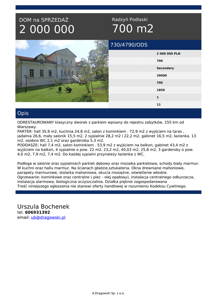 DOM na SPRZEDAŻ 2 000 000 Radzyń Podlaski 700 m2 730/4790/ODS 2 000 000 PLN 700 Secondary 29000 700 1850 1 11 Opis ODRESTAUROWANY klasyczny dworek z parkiem wpisany do rejestru zabytków, 155 km od Warszawy. PARTER: hall 35,9 m2, kuchnia 24,8 m2, salon z kominkiem . 72,9 m2 z wyjściem na taras , jadalnia 26,6, mały salonik 15,5 m2, 2 sypialnie 28,2 m2 i 22,2 m2, gabinet 16,5 m2, łazienka. 13 m2, osobno WC 2,1 m2 oraz garderoba 5,3 m2. PODDASZE: hall 7,4 m2, salon kominkiem . 53,9 m2 z wyjściem na balkon, gabinet 43,4 m2 z wyjściem na balkon, 4 sypialnie o pow. 22 m2, 23,2 m2, 40,03 m2, 25,8 m2, 3 garderoby o pow. 4,0 m2, 7,9 m2, 7,4 m2. Do każdej sypialni przynależy łazienka z WC. Podłoga w salonie oraz sypialniach parkiet dębowy oraz mozaika parkietowa, schody biały marmur. W kuchni oraz hallu marmur. Na ścianach gładzie,sztukateria. Okna drewniane mahoniowe, parapety marmurowe, stolarka mahoniowa, okucia mosiężne, oświetlenie włoskie. Ogrzewanie: kominkowe oraz centralne ( piec - olej opałowy), instalacja centralnego odkurzacza, instalacja alarmowa, biologiczna oczyszczalnia. Działka pięknie zagospodarowana Treść niniejszego ogłoszenia nie stanowi oferty handlowej w rozumieniu Kodeksu Cywilnego. Urszula Bochenek tel. 606931392 email: [email protected] A.Drągowski Sp. z o.o. Powered by TCPDF (www.tcpdf.org)
