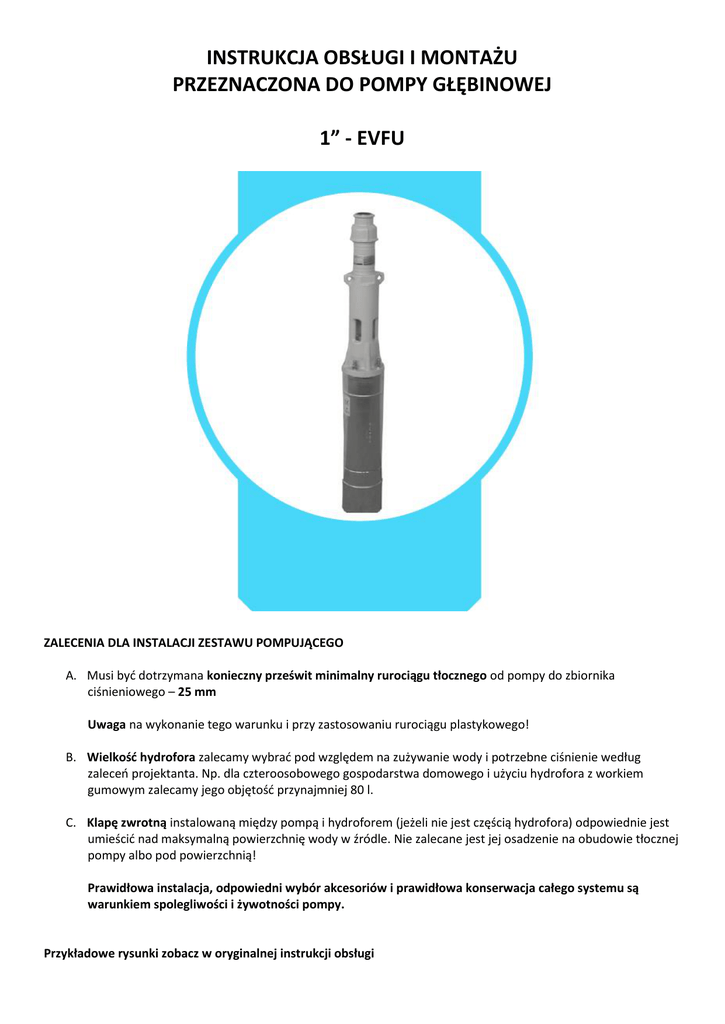 INSTRUKCJA OBSŁUGI I MONTAŻU PRZEZNACZONA DO POMPY GŁĘBINOWEJ 1” - EVFU ZALECENIA DLA INSTALACJI ZESTAWU POMPUJĄCEGO A. Musi być dotrzymana konieczny prześwit minimalny rurociągu tłocznego od pompy do zbiornika ciśnieniowego – 25 mm Uwaga na wykonanie tego warunku i przy zastosowaniu rurociągu plastykowego! B. Wielkość hydrofora zalecamy wybrać pod względem na zużywanie wody i potrzebne ciśnienie według zaleceń projektanta. Np. dla czteroosobowego gospodarstwa domowego i użyciu hydrofora z workiem gumowym zalecamy jego objętość przynajmniej 80 l. C. Klapę zwrotną instalowaną między pompą i hydroforem (jeżeli nie jest częścią hydrofora) odpowiednie jest umieścić nad maksymalną powierzchnię wody w źródle. Nie zalecane jest jej osadzenie na obudowie tłocznej pompy albo pod powierzchnią! Prawidłowa instalacja, odpowiedni wybór akcesoriów i prawidłowa konserwacja całego systemu są warunkiem spolegliwości i żywotności pompy. Przykładowe rysunki zobacz w oryginalnej instrukcji obsługi 1.0 PRZEPISY PODSTAWOWE Zestaw pompowy 1” – EVFU – 10 – 8 – GU – 080 1” – EVFU – 10 – 8 – GU – 081 1” – EVFU – 10 – 8 – GU – 083 1” – EVFU – 10 – 8 – GU – 173, 174 1” – EVFU – 10 – 8 – GU – 080 1” – EVFU – 16 – 8 – GU – 080 1. Urządzenie może działać na sucho najdłużej 2 sekundy. 2. Po czas działania pompy musi zostać dotrzymany kierunek obrotu. 3. Montaż i naprawy instalacji elektrycznej mogą być przeprowadzane tylko osobą zakwalifikowaną do pracy elektrotechnicznej. 4. Zabronione jest noszenie lub wyciąganie urządzenia za kabel. Kabel nie może zostać uszkodzony uderzeniem lub skrzypnięciem. 5. Do rury odprowadzającej musi zostać wbudowany bezpiecznik zaworu. 6. Pomiędzy urządzeniem i bezpiecznikiem musi być rurociąg z stałym przekrojem bez armatury zamykającej. 7. Silnik elektryczny musi zostać zabezpieczony ochroną nadprądową. 8. Pionowy rurociąg prowadzący od urządzenia musi mieć prawdziwe wątki. 9. Wymagane jest zapewnienie minimalnej prędkości medium chłodzącego w okolicach silnika elektrycznego - 8 cm/s. 2.0 ZASTOSOWANIE Urządzenie przeznaczone jest do pompowania wody do picia z głębokich i wąskich studni do temperatury 35oC i pH w granicach 6,5 do 12. Możliwe jest użycie pompy do pompowania wody użytkowej z zawartością delikatnego piasku, ale w takim razie obniża się żywotność funkcyjnych części urządzenia. U wykonania zestawu z oznakowaniem numeru zmiennego 173 lub 174 (silikonowa guma statora) może pompowanie wody z zawartością piasku podstawowo obniżyć żywotność statora (1130). Niniejsze urządzenie nie jest przeznaczone do używania przez osoby (łącznie dzieci) których fizyczna, umysłowa lub mentalna niezdolność lub brak doświadczeń i umiejętności zabrania w bezpiecznym używaniu urządzenia, jeżeli nie będą kontrolowane, lub jeżeli nie zostaną przeszkolone odnośnie używania urządzenia przez osobę odpowiedzialną za ich bezpieczeństwo. Dzieci miałyby być pod nadzorem, by zostało zapewnione, że nie będą się z urządzeniem bawić. Hałas Równoważne ciśnienie akustyczne A w odległości 1 m od powierzchni agregata ( za użycia filtra wagowego A) nie przekracza wartości L = 70 dBa. Nieprzypuszczalne sposoby zastosowania - pompa nie może pompować inne cieczy niż wodę - pompę nie można zastosować w środowisku z zagrożeniem wybuchu. - pompa nie może pompować wodę z zawartością kwasów, zasad, węglowodorów, wody morskiej, chemikaliów itp. - pompa nie może pracować na sucho, lub w przeciwnym kierunku obrotu. - pompa swoją nazwą, konstrukcją i zastosowaniem zawartym w niniejszym rozdziale ma ograniczony jednoznaczny cel użycia i ze względu na bezpieczeństwo nie przewiduje się ich zastosowanie do innych celów i to ani celowo, przypadkowo lub z powodu niskich umiejętności. 3.0 BEZPIECZEŃSTWO Niniejsza instrukcja obsługi zawiera podstawowe wytyczne, które muszą zostać dotrzymane w ciągu instalacji, działania i konserwacji pompy. Dlatego jest nieuniknione, by odpowiedzialni pracownicy i osoby obsługujące zawsze przed rozpoczęciem instalacji u wprowadzeniem pompy do działania sobie jego tekst dokładnie przeczytali. Również jest wymagane, by się instrukcja obsługi znajdowała w miejscu instalacji pompy po cały czas używania. Dotrzymane muszą zostać nie tylko powyżej wymienione ogólne instrukcje bezpieczeństwa wymienione pod niniejszym punktem, ale także wszystkie specyficzne instrukcje bezpieczeństwa, wymienione pod następnymi punktami. Instrukcje bezpieczeństwa zawarte w niniejszej instrukcji obsługi których niedotrzymanie mogłoby prowadzić do zagrożenie bezpieczeństwa są oznakowane symbolem Lub w przypadkach zawierających bezpieczeństwo elektryczne oznakowane są symbolem Instrukcje bezpieczeństwa, które muszą zostać dotrzymane z powodu bezpiecznego działania pompy lub urządzenia pompowego i (lub) ochrony samotnej pompy lub urządzenia pompowego są oznakowane Instrukcje bezpieczeństwa, których niedotrzymanie mogłoby zagrażać jakość środowiska są oznakowane Analiza inne3go ryzyka Podczas jakiejkolwiek manipulacji z pompą należy kontrolować jego odłączenie od sieci i równocześnie zabronić jego nieoczekiwanemu włączeniu. Ryzykiem jest niebezpieczeństwo zranienia od części obrotowych i od prądu elektrycznego. 4.0DANE TECHNICZNE 4.1 Etykieta z danymi pompy 1 nazwa firmowa i siedziba producenta 2 oznakowanie typu 3 przepływ 4 numer produkcji 5 ciśnienie transportowe 6 moc 7 maksymalna wysokość transportowa 8 prędkość obrotowa 9 maksymalna głębokość zanurzenia 10 temperatura pompowanej cieczy 11 rok produkcji 12 Ziemia pochodzenia 13 marka zgodności 4.2 Parametry Zestaw Silnik el. Obroty min-1 Prąd imienny silnika A 1" - EVFU typ -10-8-GU080 FRANKLIN 4" -16-8-GU080 FRANKLIN 4" -10-8-GU081 FRANKLIN 4