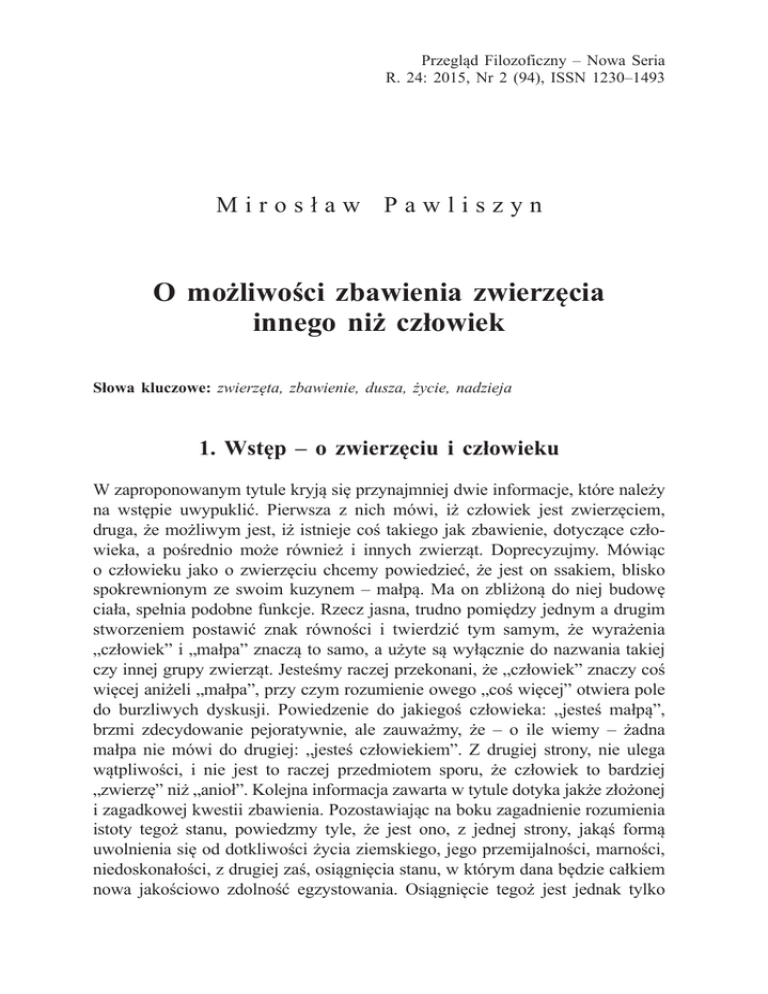 Przegląd Filozoficzny – Nowa Seria R. 24: 2015, Nr 2 (94), ISSN 1230–1493 Mirosław Pawliszyn O możliwości zbawienia zwierzęcia innego niż człowiek Słowa kluczowe: zwierzęta, zbawienie, dusza, życie, nadzieja 1. Wstęp – o zwierzęciu i człowieku W zaproponowanym tytule kryją się przynajmniej dwie informacje, które należy na wstępie uwypuklić. Pierwsza z nich mówi, iż człowiek jest zwierzęciem, druga, że możliwym jest, iż istnieje coś takiego jak zbawienie, dotyczące człowieka, a pośrednio może również i innych zwierząt. Doprecyzujmy. Mówiąc o człowieku jako o zwierzęciu chcemy powiedzieć, że jest on ssakiem, blisko spokrewnionym ze swoim kuzynem – małpą. Ma on zbliżoną do niej budowę ciała, spełnia podobne funkcje. Rzecz jasna, trudno pomiędzy jednym a drugim stworzeniem postawić znak równości i twierdzić tym samym, że wyrażenia „człowiek” i „małpa” znaczą to samo, a użyte są wyłącznie do nazwania takiej czy innej grupy zwierząt. Jesteśmy raczej przekonani, że „człowiek” znaczy coś więcej aniżeli „małpa”, przy czym rozumienie owego „coś więcej” otwiera pole do burzliwych dyskusji. Powiedzenie do jakiegoś człowieka: „jesteś małpą”, brzmi zdecydowanie pejoratywnie, ale zauważmy, że – o ile wiemy – żadna małpa nie mówi do drugiej: „jesteś człowiekiem”. Z drugiej strony, nie ulega wątpliwości, i nie jest to raczej przedmiotem sporu, że człowiek to bardziej „zwierzę” niż „anioł”. Kolejna informacja zawarta w tytule dotyka jakże złożonej i zagadkowej kwestii zbawienia. Pozostawiając na boku zagadnienie rozumienia istoty tegoż stanu, powiedzmy tyle, że jest ono, z jednej strony, jakąś formą uwolnienia się od dotkliwości życia ziemskiego, jego przemijalności, marności, niedoskonałości, z drugiej zaś, osiągnięcia stanu, w którym dana będzie całkiem nowa jakościowo zdolność egzystowania. Osiągnięcie tegoż jest jednak tylko 106 Mirosław Pawliszyn możliwością, a nie oczywistością. Znaczy to, że nie jest wykluczone, iż zostanie ono dokonane, a pewne jest to, iż nie da się temu jednoznacznie zaprzeczyć. Dwie wyróżnione informacje łączą się w jeden zasadniczy problem, zasygnalizowany w tytule. Nie chodzi nam o wyakcentowanie różnic czy poszukiwanie elementów wspólnych pomiędzy światem zwierząt i ludzi. Również nie jest obiektem zainteresowań kwestia zbawienia jako takiego, jego charakteru i istoty. Pytamy o możliwość zbawienia zwierząt, mając na uwadze, że kwestia ta rozpatrywana jest z punktu widzenia nas, ludzi. Zatem stawiamy siebie w roli tych, którzy mieliby rozstrzygać problem, który nas przecież, jak można sądzić, nie dotyczy. Jest ona bowiem albo problemem zwierząt jako takich, albo też Boga, którego decyzje, o ile jest Bogiem, są całkowicie suwerenne i niezależne od ludzkich opinii. Jedna jeszcze kwestia powinna wybrzmieć. Otóż z konieczności przyjdzie nam poruszać się na granicy pomiędzy filozofią i teologią, wraz ze świadomością, że raczej ta druga może być w tym wypadku bardziej kompetentna. Jej wpływy jednak ograniczone tu zostaną do niezbędnego minimum. 2. O duszy zwierząt Jakakolwiek próba mówienia o zbawieniu wymaga stosowania dość specyficznego języka. Nie sposób ustrzec się tutaj od używania metafory, symbolu, dwuznaczności. Więcej tu plastyki obrazu, aniżeli empirycznego języka. Skojarzenia wypierają funktory prawdziwościowe, a przenośnia zdaje się mówić więcej niż fakty. Skoro, co raczej bezsporne, dotykamy kwestii bardziej religijnej niż ściśle naukowej, wskażmy na kilka istotnych sugestii. Wydaje się, że problem ewentualnego zbawienia zwierząt wiąże się nieodłącznie z pytaniem o to, czy posiadają one coś takiego jak dusza? Zanim jednak rozważona zostanie ta kwestia, zauważmy, że termin „zwierzę” ma zakres niezwykle szeroki, w przeciwieństwie do terminu „człowiek”. Zwierzęciem można określić zarówno mrówkę, kreta, osła, kota czy psa. Można jednak zauważyć, że pomiędzy nimi a człowiekiem wytwarza się swoista więź emocjonalna, która pozwala w jednych dostrzegać istoty bliskie, kochane, w innych zaś obojętne czy niechciane, a wręcz odrażające. Ma to swoje konsekwencje, do których przyjdzie nam jeszcze nawiązać w ostatniej części. Powróćmy do kwestii duszy. Nie wdając się w znane rozważania Arystotelesa czy św. Tomasza, powiedzmy tyle, że zwierzęta posiadają ją w tym sensie, iż jest ona „szczególnego rodzaju aktem i formą rzeczy, która jest w możności, aby istnieć jako określona natura”1. Różni się tym od duszy człowieka, 1 Arystoteles, O duszy: 36. O możliwości zbawienia zwierzęcia innego niż człowiek 107 że u zwierząt ma ona charakter zmysłowy, tzn. organizuje owe doznania, a w nich zawiera się całość istoty zwierzęcia. Stąd łatwo wyprowadzić taką oto konkluzję: W przeciwieństwie do duszy ludzkiej, która jest nieśmiertelna, dusza zwierzęca ginie bezpowrotnie, gdy zwierzę umiera. A zatem w niebie nie będzie żadnych zwierząt. Niektórzy może powiedzą: szkoda! Człowiek dzięki duszy duchowej i rozumnej potrafi rozumować, poznawać nawet abstrakcyjne prawdy, tworzyć systemy filozoficzne, planować, przewidywać, a zwierzę tego nie potrafi2. Pomijając kwestię, iż autor przywołanego tutaj cytatu w sposób nieoczywisty stawia tezę, że „dusza ludzka jest nieśmiertelna”, czy „dusza zwierzęcia ginie bezpowrotnie”, trzeba je bowiem dopiero jakoś uzasadnić, a zauważmy, nie jest to proste, podkreślmy, że wyraża on dość tradycyjne poglądy w interesującym nas temacie. Nawiązują one do słów św. Tomasza z Sumy teologicznej: Otóż, jak to wyżej wykazaliśmy, dusze nierozumnych zwierząt nie mają bytu samoistnego: takowy byt ma jedynie dusza ludzka. I dlatego dusze nierozumnych zwierząt niszczeją wraz ze znisz
