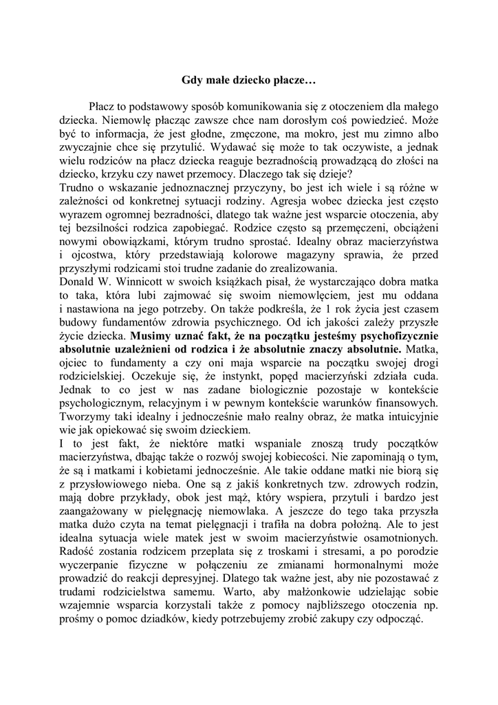 Gdy małe dziecko płacze… Płacz to podstawowy sposób komunikowania się z otoczeniem dla małego dziecka. Niemowlę płacząc zawsze chce nam dorosłym coś powiedzieć. Może być to informacja, że jest głodne, zmęczone, ma mokro, jest mu zimno albo zwyczajnie chce się przytulić. Wydawać się może to tak oczywiste, a jednak wielu rodziców na płacz dziecka reaguje bezradnością prowadzącą do złości na dziecko, krzyku czy nawet przemocy. Dlaczego tak się dzieje? Trudno o wskazanie jednoznacznej przyczyny, bo jest ich wiele i są różne w zależności od konkretnej sytuacji rodziny. Agresja wobec dziecka jest często wyrazem ogromnej bezradności, dlatego tak ważne jest wsparcie otoczenia, aby tej bezsilności rodzica zapobiegać. Rodzice często są przemęczeni, obciążeni nowymi obowiązkami, którym trudno sprostać. Idealny obraz macierzyństwa i ojcostwa, który przedstawiają kolorowe magazyny sprawia, że przed przyszłymi rodzicami stoi trudne zadanie do zrealizowania. Donald W. Winnicott w swoich książkach pisał, że wystarczająco dobra matka to taka, która lubi zajmować się swoim niemowlęciem, jest mu oddana i nastawiona na jego potrzeby. On także podkreśla, że 1 rok życia jest czasem budowy fundamentów zdrowia psychicznego. Od ich jakości zależy przyszłe życie dziecka. Musimy uznać fakt, że na początku jesteśmy psychofizycznie absolutnie uzależnieni od rodzica i że absolutnie znaczy absolutnie. Matka, ojciec to fundamenty a czy oni maja wsparcie na początku swojej drogi rodzicielskiej. Oczekuje się, że instynkt, popęd macierzyński zdziała cuda. Jednak to co jest w nas zadane biologicznie pozostaje w kontekście psychologicznym, relacyjnym i w pewnym kontekście warunków finansowych. Tworzymy taki idealny i jednocześnie mało realny obraz, że matka intuicyjnie wie jak opiekować się swoim dzieckiem. I to jest fakt, że niektóre matki wspaniale znoszą trudy początków macierzyństwa, dbając także o rozwój swojej kobiecości. Nie zapominają o tym, że są i matkami i kobietami jednocześnie. Ale takie oddane matki nie biorą się z przysłowiowego nieba. One są z jakiś konkretnych tzw. zdrowych rodzin, mają dobre przykłady, obok jest mąż, który wspiera, przytuli i bardzo jest zaangażowany w pielęgnację niemowlaka. A jeszcze do tego taka przyszła matka dużo czyta na temat pielęgnacji i trafiła na dobra położną. Ale to jest idealna sytuacja wiele matek jest w swoim macierzyństwie osamotnionych. Radość zostania rodzicem przeplata się z troskami i stresami, a po porodzie wyczerpanie fizyczne w połączeniu ze zmianami hormonalnymi może prowadzić do reakcji depresyjnej. Dlatego tak ważne jest, aby nie pozostawać z trudami rodzicielstwa samemu. Warto, aby małżonkowie udzielając sobie wzajemnie wsparcia korzystali także z pomocy najbliższego otoczenia np. prośmy o pomoc dziadków, kiedy potrzebujemy zrobić zakupy czy odpocząć. Jeżeli wsparcie najbliższych nie wystarcza warto skorzystać z pomocy specjalisty psychologa, psychoterapeuty, kogoś kto wysłucha nie oceniając. Można również szukać wsparcia w różnych instytucjach takich jak np. MOPS – pomoc finansowa, Poradnia Psychologiczno Pedagogiczna – Szkoła dla rodziców, indywidualne konsultacje dla rodziców. Pamiętajmy dbając o siebie i własne emocje dbamy jednocześnie o rozwój dziecka. Opieka nad dzieckiem w pierwszych dniach, tygodniach życia są bardzo ważne dla rozwoju psychicznego i fizycznego. Rodzice i ich umiejętności opieki decydują o cechach osobowości, które wpływają na przyszłe życie ich dziecka. Dziecko rodzi się z pewnym indywidualnym temperamentem natomiast w interakcji z najbliższym otoczeniem kształtuje się jego osobowość. Pewne cechy mogą być zatem w interakcji ze środowiskiem wyciszane, inne zaś mogą być wzmacniane. Już kilkutygodniowe niemowlę w relacji z matką komunikuje swoje stany emocjonalne, a nawet jak podają ostatnie badania dziecko odczytuje stany emocjonalne matki i próbuje je zmieniać. Na przykład depresyjna matka może wywoływać w dziecku niepokój i w związku z tym np. dziecko próbuje ją ożywić przez nieustający płacz. W literaturze spotyka się już określenia martwa matka czyli taka którą dziecko będzie próbowało ożywić. W zależności od nasilenia stanu depresyjnego, u dziecka może również wystąpić depresja, z którą najczęściej dziecko próbuje sobie poradzić przez złoszczenie się albo rozwijają się u niego pokłady empatii, czyli branie odpowiedzialności za rozwiązanie problemów innych ludzi. Podsumowując warto zaznaczyć że matka dbając o siebie i swoje potrzeby uczy tym samym dziecko dbania o siebie. Dzieci najczęściej uczą się poprzez naśladowanie, obserwują rodziców i powielają ich zachowanie. Pierwsze lata życia małego dziecka to szczególna więź matki z dzieckiem. Mały człowiek idealnie wyczuwa stany emocjonalne matki i do nich się dostraja. Mama zapłakana i smutna to często marudzące i rozdrażnione dziecko Szczęśliwa i radosna matka to szczęśliwe i roześmiane dziecko. Dbając o siebie dbamy jednocześnie o nasze dziecko. Artykuł opracowany na podstawie audycji radiowej wrzesień 2014r. Osoby prowadzące: Tadeusz Chrzan, Agnieszka Kamińska, Joanna Starzecka