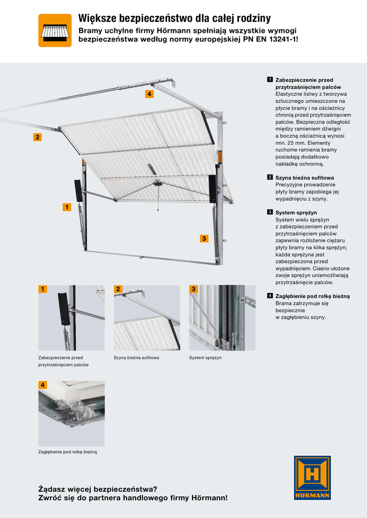 Większe bezpieczeństwo dla całej rodziny Bramy uchylne firmy Hörmann spełniają wszystkie wymogi bezpieczeństwa według normy europejskiej PN EN 13241-1! Zabezpieczenie przed przytrzaśnięciem palców Elastyczne listwy z tworzywa sztucznego umieszczone na płycie bramy i na ościeżnicy chronią przed przytrzaśnięciem palców. Bezpieczna odległość między ramieniem dźwigni a boczną ościeżnicą wynosi min. 25 mm. Elementy ruchome ramienia bramy posiadają dodatkowo nakładkę ochronną. Szyna bieżna sufitowa Precyzyjne prowadzenie płyty bramy zapobiega jej wypadnięciu z szyny. System sprężyn System wielu sprężyn z zabezpieczeniem przed przytrzaśnięciem palców zapewnia rozłożenie ciężaru płyty bramy na klika sprężyn; każda sprężyna jest zabezpieczona przed wypadnięciem. Ciasno ułożone zwoje sprężyn uniemożliwiają przytrzaśnięcie palców. Zagłębienie pod rolkę bieżną Brama zatrzymuje się bezpiecznie w zagłębieniu szyny. Zabezpieczenie przed Szyna bieżna sufitowa System sprężyn przytrzaśnięciem palców Zagłębienie pod rolkę bieżną Żądasz więcej bezpieczeństwa? Zwróć się do partnera handlowego firmy Hörmann! Kontrola bezpieczeństwa starej bramy garażowej Jak bezpieczna jest Państwa brama uchylna? ? Czy elastyczne listwy z tworzywa sztucznego umieszczone na ościeżnicy i płycie bramy chronią przed przytrzaśnięciem palców? Tak Nie ? Czy bezpieczna odległość między ramieniem dźwigni a ościeżnicą wynosi 25 mm? Tak Nie ? Czy elementy ruchome ramienia bramy posiadają nakładkę zabezpieczającą przed przypadkowym przytrzaśnięciem? Tak Nie ? Czy brama porusza się bezpiecznie w prowadnicach i posiada zabezpieczenie przed niekontrolowanym ruchem? Tak Nie ? Czy szyny bieżne są skonstruowane w sposób uniemożliwiający wypadnięcie rolek bieżnych? Tak Nie ? Czy płyta bramy jest zabezpieczona przed opadnięciem? Tak Nie ? Czy nawet w razie pęknięcia sprężyny powstała nierównowaga nie przekracza 200 N? Tak Nie ? Czy sprężyny są zabezpieczone przed wypadnięciem? Tak Nie ? Czy system sprężyn jest skonstruowany w sposób zabezpieczający przed zakleszczeniem palców? Tak Nie ? Czy po otwarciu brama bezpiecznie się zatrzymuje? Tak Nie ? Czy w przypadku bram uchylnych z napędem zachowane są maksymalne siły zamykania zgodnie z PN EN 13241-1? Tak Nie