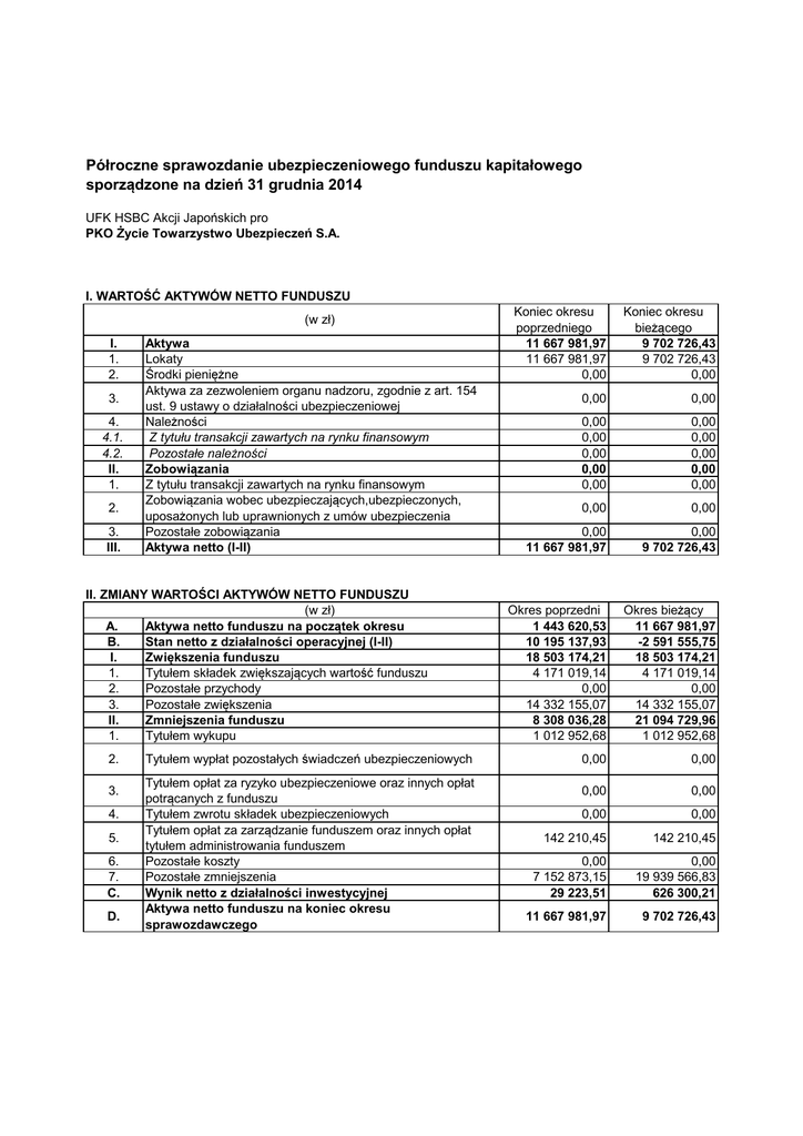 Półroczne sprawozdanie ubezpieczeniowego funduszu kapitałowego sporządzone na dzień 31 grudnia 2014 UFK HSBC Akcji Japońskich pro PKO Życie Towarzystwo Ubezpieczeń S.A. UFK HSBC Akcji Japońskich pro I. WARTOŚĆ AKTYWÓW NETTO FUNDUSZU (w zł) I. 1. 2. 3. 4. 4.1. 4.2. II. 1. 2. 3. III. Aktywa Lokaty Środki pieniężne Aktywa za zezwoleniem organu nadzoru, zgodnie z art. 154 ust. 9 ustawy o działalności ubezpieczeniowej Należności Z tytułu transakcji zawartych na rynku finansowym Pozostałe należności Zobowiązania Z tytułu transakcji zawartych na rynku finansowym Zobowiązania wobec ubezpieczających,ubezpieczonych, uposażonych lub uprawnionych z umów ubezpieczenia Pozostałe zobowiązania Aktywa netto (I-II) II. ZMIANY WARTOŚCI AKTYWÓW NETTO FUNDUSZU (w zł) A. Aktywa netto funduszu na początek okresu B. Stan netto z działalności operacyjnej (I-II) I. Zwiększenia funduszu 1. Tytułem składek zwiększających wartość funduszu Pozostałe przychody 2. 3. Pozostałe zwiększenia II. Zmniejszenia funduszu 1. Tytułem wykupu 2. 3. 4. 5. 6. 7. C. D. Tytułem wypłat pozostałych świadczeń ubezpieczeniowych Tytułem opłat za ryzyko ubezpieczeniowe oraz innych opłat potrącanych z funduszu Tytułem zwrotu składek ubezpieczeniowych Tytułem opłat za zarządzanie funduszem oraz innych opłat tytułem administrowania funduszem Pozostałe koszty Pozostałe zmniejszenia Wynik netto z działalności inwestycyjnej Aktywa netto funduszu na koniec okresu sprawozdawczego Koniec okresu poprzedniego 11 667 981,97 11 667 981,97 0,00 Koniec okresu bieżącego 9 702 726,43 9 702 726,43 0,00 0,00 0,00 0,00 0,00 0,00 0,00 0,00 0,00 0,00 0,00 0,00 0,00 0,00 0,00 0,00 11 667 981,97 0,00 9 702 726,43 Okres poprzedni 1 443 620,53 10 195 137,93 18 503 174,21 4 171 019,14 0,00 14 332 155,07 8 308 036,28 1 012 952,68 Okres bieżący 11 667 981,97 -2 591 555,75 18 503 174,21 4 171 019,14 0,00 14 332 155,07 21 094 729,96 1 012 952,68 0,00 0,00 0,00 0,00 0,00 0,00 142 210,45 142 210,45 0,00 7 152 873,15 29 223,51 0,00 19 939 566,83 626 300,21 11 667 981,97 9 702 726,43 III. LICZBA I WARTOŚĆ JEDNOSTEK ROZRACHUNKOWYCH Pozycja 1. Liczba jednostek rozrachunkowych: liczba jednostek rozrachunkowych na początek okresu 1.1 sprawozdawczego liczba jednostek rozrachunkowych na koniec okresu 1.2 sprawozdawczego 2. Wartość jednostki rozrachunkowej: wartość jednostki rozrachunkowej na początek okresu 2.1 sprawozdawczego minimalna wartość jednostki rozrachunkowej w okresie 2.2 sprawozdawczym maksymalna wartość jednostki rozrachunkowej w okresie 2.3 sprawozdawczym wartość jednostki rozliczeniowej na koniec okresu 2.4 sprawozdawczego Okres poprzedni Okres bieżący 63 122,8916 432 628,1783 432 628,1783 331 490,4827 22,87 26,97 22,62 24,05 29,33 29,64 26,97 29,27 IV. ZESTAWIENIE AKTYWÓW NETTO FUNDUSZU - półroczne Udział w aktywach netto funduszu (w %) 2 3 9 702 726,43 100,00% Wartość bilansowa (w zł) 1 I. Lokaty (suma 1-12) 1. Papiery wartościowe emitowane, poręczone lub gwarantowane przez Skarb Państwa lub organizacje międzynarodowe, których członkiem jest Rzeczpospolita Polska 2. 3. 4. 5. 6. 7. 8. 9. 10. 11. 12. Obligacje emitowane lub poręczone przez jednostki samorządu terytorialnego lub związki jednostek samorządu terytorialnego Inne dłużne papiery wartościowe o stałej stopie dochodu Akcje Udziały Jednostki uczestnictwa i certyfikaty inwestycyjne w funduszach inwestycyjnych Instrumenty pochodne, o ile służą zmniejszeniu ryzyka związanego z innymi aktywami stanowiącymi pokrycie rezerw techniczno-ubezpieczeniowych Inne papiery wartościowe o zmiennej kwocie dochodu Pożyczki Nieruchomości Depozyty bankowe Pozostałe lokaty II. Aktywa za zezwoleniem organu nadzoru, zgodnie z art. 154 ust. 9 ustawy o działalności ubezpieczeniowej III. IV. V. VI. 1 2 3 Środki pieniężne Należności Zobowiązania Aktywa netto (w tym) krajowe zagraniczne - kraje UE zagraniczne - kraje poza UE 0,00 0,00% 0,00 0,00% 0,00 0,00 0,00 0,00% 0,00% 0,00% 9 702 726,43 100,00% 0,00 0,00% 0,00 0,00 0,00 0,00 0,00 0,00% 0,00% 0,00% 0,00% 0,00% 0,00 0,00% 0,00 0,00 0,00 9 702 726,43 0,00 9 702 726,43 0,00 0,00% 0,00% 0,00% 100,00% 0,00% 100,00% 0,00%