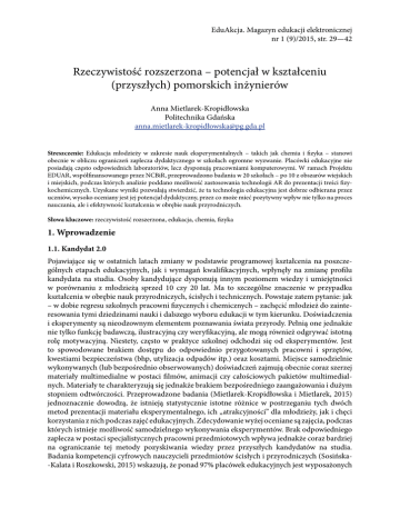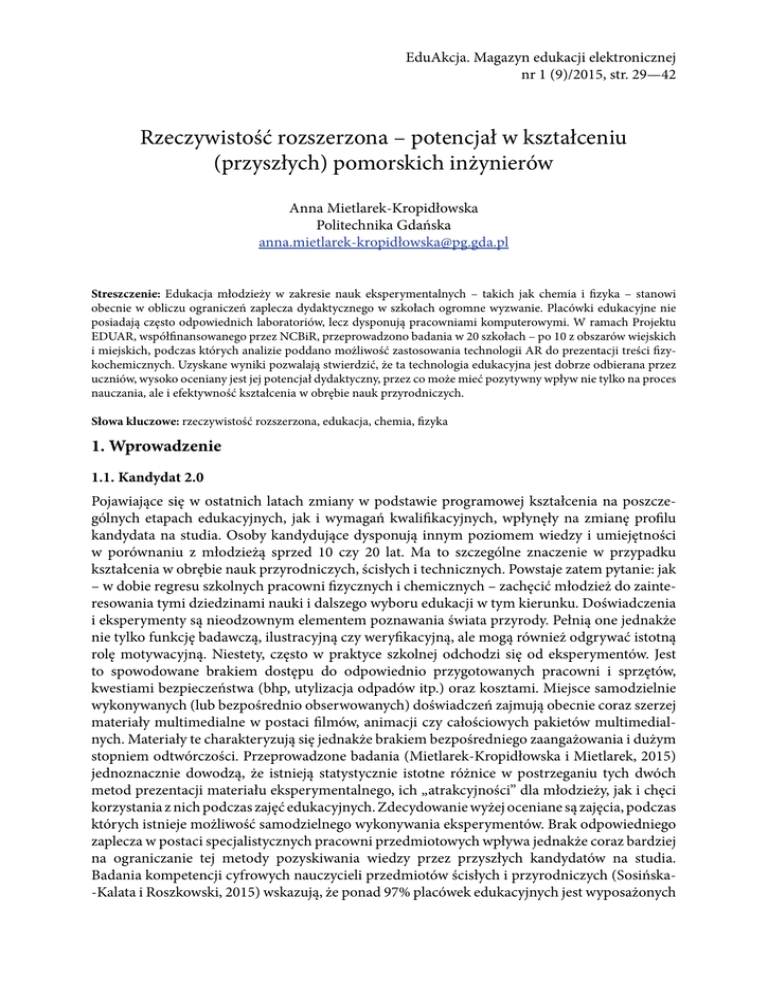 EduAkcja. Magazyn edukacji elektronicznej nr 1 (9)/2015, str. 29—42 Rzeczywistość rozszerzona – potencjał w kształceniu (przyszłych) pomorskich inżynierów Anna Mietlarek-Kropidłowska Politechnika Gdańska anna.mietlarek-kropidł[email protected] Streszczenie: Edukacja młodzieży w zakresie nauk eksperymentalnych – takich jak chemia i fizyka – stanowi obecnie w obliczu ograniczeń zaplecza dydaktycznego w szkołach ogromne wyzwanie. Placówki edukacyjne nie posiadają często odpowiednich laboratoriów, lecz dysponują pracowniami komputerowymi. W ramach Projektu EDUAR, współfinansowanego przez NCBiR, przeprowadzono badania w 20 szkołach – po 10 z obszarów wiejskich i miejskich, podczas których analizie poddano możliwość zastosowania technologii AR do prezentacji treści fizykochemicznych. Uzyskane wyniki pozwalają stwierdzić, że ta technologia edukacyjna jest dobrze odbierana przez uczniów, wysoko oceniany jest jej potencjał dydaktyczny, przez co może mieć pozytywny wpływ nie tylko na proces nauczania, ale i efektywność kształcenia w obrębie nauk przyrodniczych. Słowa kluczowe: rzeczywistość rozszerzona, edukacja, chemia, fizyka 1. Wprowadzenie 1.1. Kandydat 2.0 Pojawiające się w ostatnich latach zmiany w podstawie programowej kształcenia na poszczególnych etapach edukacyjnych, jak i wymagań kwalifikacyjnych, wpłynęły na zmianę profilu kandydata na studia. Osoby kandydujące dysponują innym poziomem wiedzy i umiejętności w porównaniu z młodzieżą sprzed 10 czy 20 lat. Ma to szczególne znaczenie w przypadku kształcenia w obrębie nauk przyrodniczych, ścisłych i technicznych. Powstaje zatem pytanie: jak – w dobie regresu szkolnych pracowni fizycznych i chemicznych – zachęcić młodzież do zainteresowania tymi dziedzinami nauki i dalszego wyboru edukacji w tym kierunku. Doświadczenia i eksperymenty są nieodzownym elementem poznawania świata przyrody. Pełnią one jednakże nie tylko funkcję badawczą, ilustracyjną czy weryfikacyjną, ale mogą również odgrywać istotną rolę motywacyjną. Niestety, często w praktyce szkolnej odchodzi się od eksperymentów. Jest to spowodowane brakiem dostępu do odpowiednio przygotowanych pracowni i sprzętów, kwestiami bezpieczeństwa (bhp, utylizacja odpadów itp.) oraz kosztami. Miejsce samodzielnie wykonywanych (lub bezpośrednio obserwowanych) doświadczeń zajmują obecnie coraz szerzej materiały multimedialne w postaci filmów, animacji czy całościowych pakietów multimedialnych. Materiały te charakteryzują się jednakże brakiem bezpośredniego zaangażowania i dużym stopniem odtwórczości. Przeprowadzone badania (Mietlarek-Kropidłowska i Mietlarek, 2015) jednoznacznie dowodzą, że istnieją statystycznie istotne różnice w postrzeganiu tych dwóch metod prezentacji materiału eksperymentalnego, ich „atrakcyjności” dla młodzieży, jak i chęci korzystania z nich podczas zajęć edukacyjnych. Zdecydowanie wyżej oceniane są zajęcia, podczas których istnieje możliwość samodzielnego wykonywania eksperymentów. Brak odpowiedniego zaplecza w postaci specjalistycznych pracowni przedmiotowych wpływa jednakże coraz bardziej na ograniczanie tej metody pozyskiwania wiedzy przez przyszłych kandydatów na studia. Badania kompetencji cyfrowych nauczycieli przedmiotów ścisłych i przyrodniczych (Sosińska-Kalata i Roszkowski, 2015) wskazują, że ponad 97% placówek edukacyjnych jest wyposażonych Anna Mietlarek-Kropidłowska, Rzeczywistość rozszerzona – potencjał w kształceniu... w komputery stacjonarne lub przenośne oraz rzutniki multimedialne. W szkołach zdecydowanie częściej spotkać można dobrze wyposażoną pracownię komputerową aniżeli chemiczną czy fizyczną. Powstaje zatem pytanie, jak ICT może pomóc w naukom eksperymentalnym. W świetle prowadzonych badań wydaje się, że zwykłe multimedia nie mają odpowiedniego potencjału dydaktycznego. W ostatnim czasie do zastosowań edukacyjnych coraz częściej tworzy się materiały wykonane z zastosowaniem technologii rzeczywistości rozszerzonej. 1.2. Rzeczywistość rozszerzona w edukacji Rzeczywistość rozszerzona (określana także mianem wzbogaconej) łączy świat realny i wirtualny, wykorzystując technologie informacyjne oraz urządzenia do postrzegania i interakcji z rzeczywistością. Pozwala tym samym nakładać informacje generowane cyfrowo na bezpośredni obraz świata nas otaczającego. Powiązanie rzeczywistości rozszerzonej (ang. Augmented Reality, AR) z wirtualną opisał w postaci kontinuum Rzeczywistość–Wirtulaność (Rys. 1) Milgram (Milgram i Kishino, 1994, Milgram et al., 1994). Różnica pomiędzy rzeczywistością rozszerzoną a wirtualną polega na tym, że nie zastępuje ona rzeczywistego świata, a jedynie dodaje pewne elementy wirtualne, nałożone na obraz rzeczywisty. Rysunek 1. Kontinuum Rzeczywistość–Wirtualność wg Milgrama Aby korzystać z technologii AR, potrzebny jest odpowiedni sprzęt (np. urządzenie montowane na głowie, ang. HMD, Head Mounted Device, komputer, konsola. smartfon lub tablet), marker i dedykowane oprogramowanie, które pozwala nakładać na obraz świata rzeczywistego dodatkowe informacje. Na obraz z kamery danego urządzenia nałożona zostaje w czasie rzeczywistym grafika 3D, najczęściej dynamiczna, interaktywna oraz wzbogacona multimediami. Marker to znacznik cyfrowy lub obiekt fizyczny, który jest wykorzystywany w procesie interakcji pomiędzy rzeczywistością postrzeganą za pomocą stosowanego urządzenia a dodatkową warstwą wirtualną generowaną i nakładaną przez aplikację. Rysunek 2. Przykładowy marker wykorzystywany w aplikacjach AR Technologia AR z roku na rok zyskuje coraz większą popularność i obecnie jest wykorzystywana nie tylko do prezentacji komercyjnych produktów, ale i stosowana coraz szerzej na polu edukacji (Mietlarek-Kropidłowska, 2013a, Mietlarek-Kropidłowska, 2013b). Jak wskazują wyn