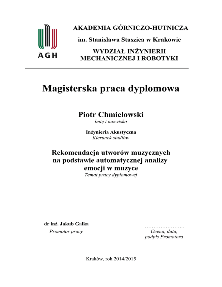 Praca magisterska poświęcona jest zagadnieniu automatycznego rozpoznawania nastroju utworów muzycznych. Została w niej omówiona motywacja stojąca