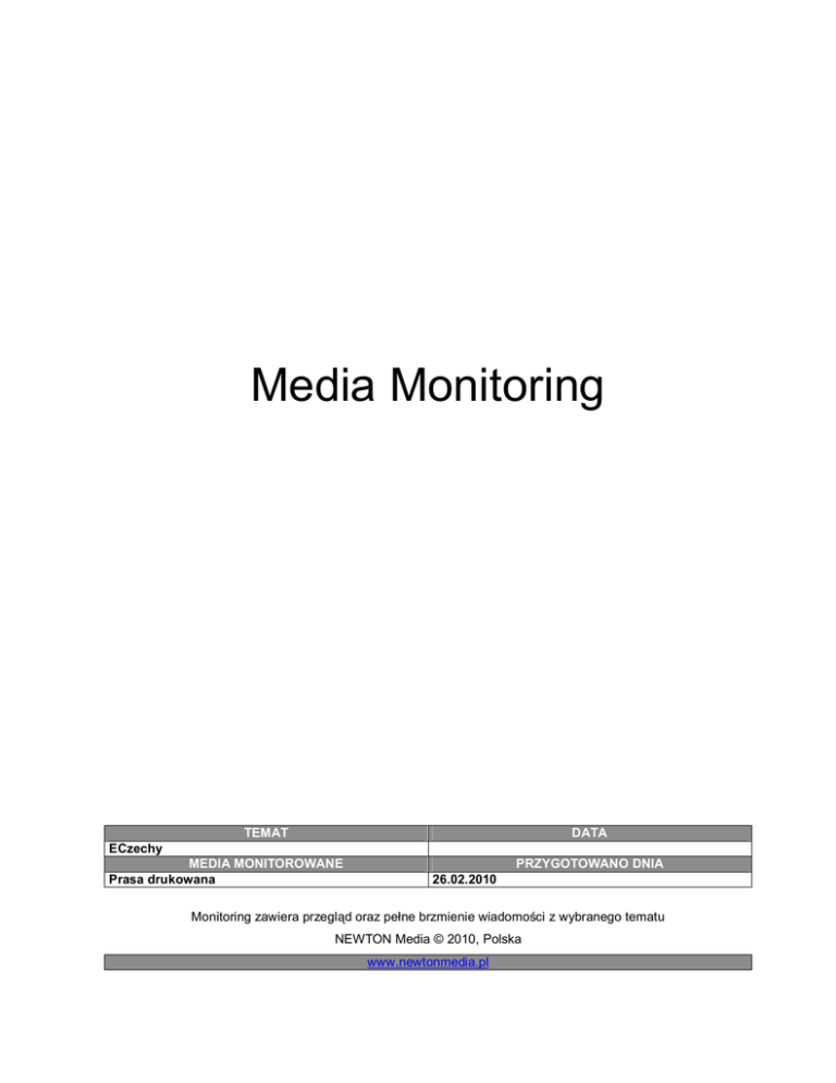 Media Monitoring TEMAT DATA ECzechy MEDIA MONITOROWANE Prasa drukowana PRZYGOTOWANO DNIA 26.02.2010 Monitoring zawiera przegląd oraz pełne brzmienie wiadomości z wybranego tematu NEWTON Media © 2010, Polska www.newtonmedia.pl Przegląd wiadomości 15.2.2010 - 26.2.2010 ECzechy 26.2.2010 Odpowiedzialność zarządu spółki akcyjnej w razie jej upadłości................................................................. 5 26.2.2010 Gazeta Finansowa str. 5 Prawo i Biznes ECzechy Rynek nieruchomości komercyjnych okiem prawnika .................................................................................. 6 26.2.2010 Gazeta Finansowa str. 8 Prawo i Biznes ECzechy Ewelina Stobiecka MSP: Energa nie wejdzie na giełdę................................................................................................................. 7 26.2.2010 Parkiet str. 8 firmy ECzechy B CH Jaworznianie chcą iść do pracy. Ale gdzie ta praca jest? ............................................................................. 8 26.2.2010 Polska Dziennik Zachodni str. 4 Jaworzno ECzechy Anna Zielonka Nasz cel to liberalizacja rynku energetycznego ........................................................................................... 10 26.2.2010 Rzeczpospolita str. 6 Ekonomia i rynek ECzechy 25.2.2010 Uprowadzanie Europy ................................................................................................................................... 11 25.2.2010 Dziennik Polski str. 10 Opinie ECzechy ALEKSANDER SURDEJ* Powiat głubczycki ......................................................................................................................................... 13 25.2.2010 Nowa Trybuna Opolska str. 6 Kędzierzyn-Koźle ECzechy SŁAWOMIR DRAGUŁA 24.2.2010 ZGINĄŁ POLSKI GÓRNIK.............................................................................................................................. 14 24.2.2010 Dziennik Elbląski str. 10 Z kraju i ze świata ECzechy Tauron chce rozwijać odnawialne źródła energii......................................................................................... 15 24.2.2010 Dziennik Gazeta Prawna str. 2 Biznes i energia ECzechy Dariusz Ciepiela Konkurencyjny rynek pracy .......................................................................................................................... 16 24.2.2010 Dziennik Polski str. 3 Przegląd nieruchomości ECzechy JANUSZ MICHALCZAK ZGINĄŁ POLSKI GÓRNIK.............................................................................................................................. 18 24.2.2010 Gazeta Olsztyńska str. 9 Z kraju i ze świata ECzechy Przegląd wiadomości 2 © 2010 NEWTON Media Sp. z o.o. www.newtonmedia.pl Nie ma paliwa do zwyżki ............................................................................................................................... 18 24.2.2010 Rzeczpospolita str. 15 Ekonomia i rynek ECzechy CEZARY ADAMCZYK 23.2.2010 ENERGETYKA ............................................................................................................................................... 19 23.2.2010 Elektrosystemy str. 26 Aktualności ECzechy ZAGRANICA .................................................................................................................................................. 19 23.2.2010 Elektrosystemy str. 29 Aktualności ECzechy Wyniki mogą zaskoczyć ................................................................................................................................ 20 23.2.2010 Parkiet str. 4 firmy ECzechy BAM Na giełdach wiało nudą ................................................................................................................................. 20 23.2.2010 Rzeczpospolita str. 15 Ekonomia i rynek ECzechy CEZARY ADAMCZYK 22.2.2010 Największy wzrost zysków w tym roku pokaże PGNiG ............................................................................... 21 22.2.2010 Dziennik Gazeta Prawna str. 9 Forsal ECzechy Małgorzata Kwiatkowska Wiosną do konsulatu honorowego Czech ................................................................................................... 22 22.2.2010 Gazeta Pomorska str. 5 Bydgoszcz, Nakło, Bydgoszcz-okolice ECzechy AGATA KOZICKA Czarni rycerze CEZ ........................................................................................................................................ 23 22.2.2010 Gazeta Wyborcza str. 33 Magazyn gospodarczy ECzechy LUBOŠ PALATA Czesi przyjeżdżają do Polski i kupują ibuprom ........................................................................................... 25 22.2.2010 Gazeta Wyborcza str. 5 Katowice ECzechy EWA FURTAK EMITENT ........................................................................................................................................................ 26 22.2.2010 Parkiet str. 2 5 minut ECzechy Wielki bój o wędliny ...................................................................................................................................... 26 22.2.2010 Tygodnik ANGORA str. 71 Peryskop ECzechy EWA KLOSOVÁ 20.2.2010 NewConnect wychodzi z kryzysu obronną ręką, ale na hurraoptymizm jeszcze za wcześnie .................. 27 20.2.2010 Parkiet str. 8 Firmy ECzechy Katarzyna Kucharczyk Andrzej Szurek Czeski inwestor w kopalni ............................................................................................................................ 30 Przegląd wiadomości 3 © 2010 NEWTON Media Sp. z o.o. www.newtonmedia.pl 20.2.2010 Polska Dziennik Zachodni str. 7 Fakty 24 ECzechy NET 16.2.2010 GRUPA HANDLOWA ELEKTROUNION W CZESKIEJ FIRMIE MODUS........................................................ 30 16.2.2010 Elektroinstalator str. 56 ECzechy ZAPROSILI NAS I POINFORMOWALI ........................................................................................................... 32 16.2.2010 Elektroi