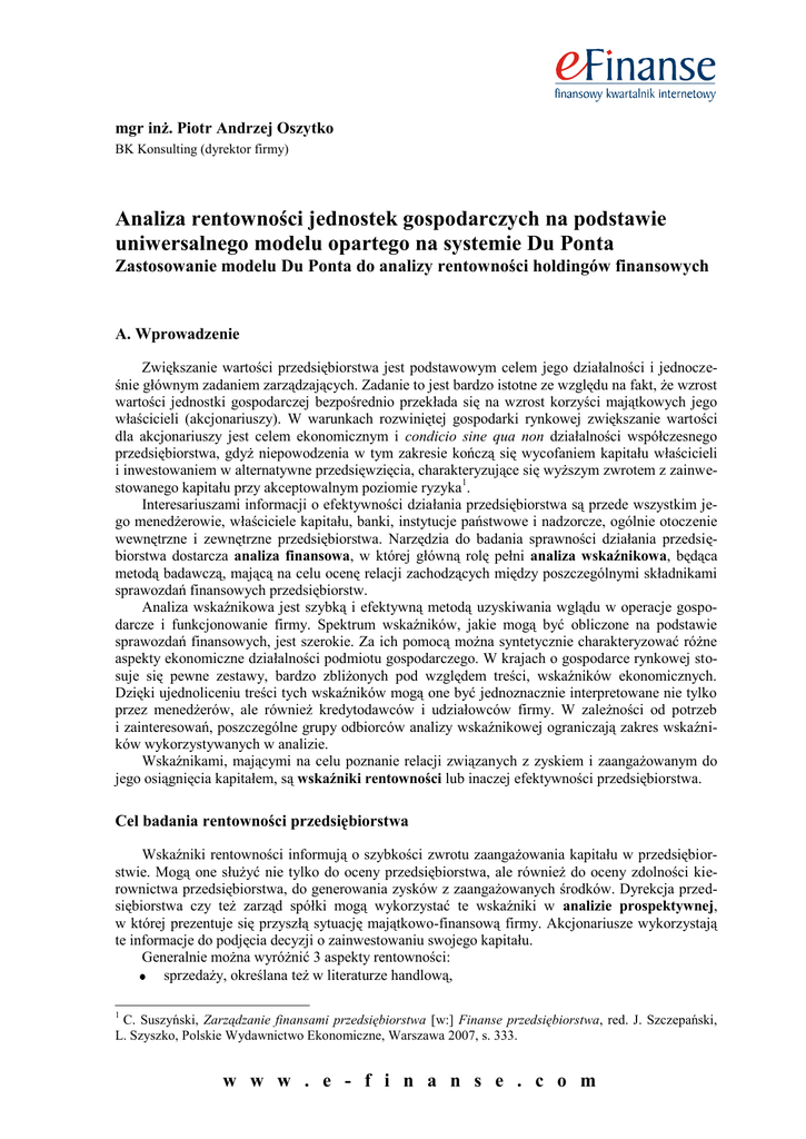 mgr inż. Piotr Andrzej Oszytko BK Konsulting (dyrektor firmy) Analiza rentowności jednostek gospodarczych na podstawie uniwersalnego modelu opartego na systemie Du Ponta Zastosowanie modelu Du Ponta do analizy rentowności holdingów finansowych A. Wprowadzenie Zwiększanie wartości przedsiębiorstwa jest podstawowym celem jego działalności i jednocześnie głównym zadaniem zarządzających. Zadanie to jest bardzo istotne ze względu na fakt, że wzrost wartości jednostki gospodarczej bezpośrednio przekłada się na wzrost korzyści majątkowych jego właścicieli (akcjonariuszy). W warunkach rozwiniętej gospodarki rynkowej zwiększanie wartości dla akcjonariuszy jest celem ekonomicznym i condicio sine qua non działalności współczesnego przedsiębiorstwa, gdyż niepowodzenia w tym zakresie kończą się wycofaniem kapitału właścicieli i inwestowaniem w alternatywne przedsięwzięcia, charakteryzujące się wyższym zwrotem z zainwestowanego kapitału przy akceptowalnym poziomie ryzyka1. Interesariuszami informacji o efektywności działania przedsiębiorstwa są przede wszystkim jego menedżerowie, właściciele kapitału, banki, instytucje państwowe i nadzorcze, ogólnie otoczenie wewnętrzne i zewnętrzne przedsiębiorstwa. Narzędzia do badania sprawności działania przedsiębiorstwa dostarcza analiza finansowa, w której główną rolę pełni analiza wskaźnikowa, będąca metodą badawczą, mającą na celu ocenę relacji zachodzących między poszczególnymi składnikami sprawozdań finansowych przedsiębiorstw. Analiza wskaźnikowa jest szybką i efektywną metodą uzyskiwania wglądu w operacje gospodarcze i funkcjonowanie firmy. Spektrum wskaźników, jakie mogą być obliczone na podstawie sprawozdań finansowych, jest szerokie. Za ich pomocą można syntetycznie charakteryzować różne aspekty ekonomiczne działalności podmiotu gospodarczego. W krajach o gospodarce rynkowej stosuje się pewne zestawy, bardzo zbliżonych pod względem treści, wskaźników ekonomicznych. Dzięki ujednoliceniu treści tych wskaźników mogą one być jednoznacznie interpretowane nie tylko przez menedżerów, ale również kredytodawców i udziałowców firmy. W zależności od potrzeb i zainteresowań, poszczególne grupy odbiorców analizy wskaźnikowej ograniczają zakres wskaźników wykorzystywanych w analizie. Wskaźnikami, mającymi na celu poznanie relacji związanych z zyskiem i zaangażowanym do jego osiągnięcia kapitałem, są wskaźniki rentowności lub inaczej efektywności przedsiębiorstwa. Cel badania rentowności przedsiębiorstwa Wskaźniki rentowności informują o szybkości zwrotu zaangażowania kapitału w przedsiębiorstwie. Mogą one służyć nie tylko do oceny przedsiębiorstwa, ale również do oceny zdolności kierownictwa przedsiębiorstwa, do generowania zysków z zaangażowanych środków. Dyrekcja przedsiębiorstwa czy też zarząd spółki mogą wykorzystać te wskaźniki w analizie prospektywnej, w której prezentuje się przyszłą sytuację majątkowo-finansową firmy. Akcjonariusze wykorzystają te informacje do podjęcia decyzji o zainwestowaniu swojego kapitału. Generalnie można wyróżnić 3 aspekty rentowności: sprzedaży, określana też w literaturze handlową, 1 C. Suszyński, Zarządzanie finansami przedsiębiorstwa [w:] Finanse przedsiębiorstwa, red. J. Szczepański, L. Szyszko, Polskie Wydawnictwo Ekonomiczne, Warszawa 2007, s. 333. w w w . e - f i n a n s e . c o m majątku (aktywów), zwana rentownością ekonomiczną, zaangażowanych kapitałów własnych, określana też rentownością finansową2. Wskaźniki rentowności sprzedaży mogą być liczone jako rentowność brutto i netto, w zależności od kategorii zysku przyjmowanej do obliczeń. Wskaźniki rentowności brutto mogą być obliczane jako relacja: nadwyżki finansowej brutto do sprzedaży netto, zysku przed spłatą odsetek i opodatkowaniem do sprzedaży netto, zysku przed opodatkowaniem do sprzedaży netto (marża zysku). Rentowność ekonomiczna (majątku) informuje o wielkości zysku netto, przypadającego na jednostkę wartości zaangażowanego w przedsiębiorstwie majątku. Wskaźnik ten, określany również zwrotem z majątku, wyznacza ogólną zdolność aktywów przedsiębiorstwa do generowania zysku, czyli pokazuje, jak efektywnie firma zarządza swoimi aktywami. Im wartość tego wskaźnika jest wyższa, tym korzystniejsza jest sytuacja finansowa firmy. Wskaźnik zyskowności aktywów jest ogólnym miernikiem podnoszenia efektywności gospodarowania w przedsiębiorstwie. Rentowność ekonomiczna zależy od rentowności sprzedaży netto, czyli wielkości zysku zrealizowanego przy określonej sprzedaży oraz szybkości rotacji zaangażowanych aktywów. Trzeci aspekt badania rentowności przedsiębiorstwa dotyczy rentowności zaangażowanego kapitału własnego, czyli tzw. rentowności finansowej. Pozwala ona określić stopę zysku, jaką przynosi inwestycja w dane przedsiębiorstwo. Inaczej ujmując rentowność finansowa zależy od wielkości wygospodarowanego zysku oraz od źródeł finansowania majątku, tzw. struktury finansowej. Wysokość wskaźnika rentowności kapitału własnego zależy od m.in.: różnicy między wskaźnikiem rentowności kapitału całkowitego a stopą płaconych odsetek za pozyskanie kapitału obcego, wskaźnika struktury kapitału, tj. udziału kapitału własnego w kapitale całkowitym. Rentowność kapitału całkowitego (majątku ogółem) zależy od rentowności sprzedaży, tj. relacji zysku netto do sprzedaży oraz rotacji majątku (aktywów). Stan rentowności kapitału własnego rośnie wraz ze zwiększeniem się rentowności sprzedaży i rotacji kapitału całkowitego. Rentowność przedsiębiorstwa jest konsekwencją przyjętej strategii rozwoju, obejmującej politykę: cen oraz kontrolę kosztów wyznaczających udział zysku w sprzedaży, czyli marży zysku, inwestycji, od której zależy produktywność i 