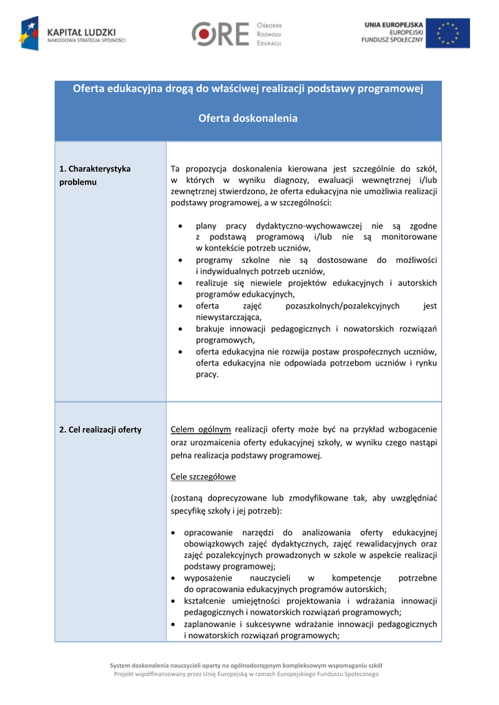 Oferta edukacyjna drogą do właściwej realizacji podstawy programowej Oferta doskonalenia 1. Charakterystyka problemu Ta propozycja doskonalenia kierowana jest szczególnie do szkół, w których w wyniku diagnozy, ewaluacji wewnętrznej i/lub zewnętrznej stwierdzono, że oferta edukacyjna nie umożliwia realizacji podstawy programowej, a w szczególności: 2. Cel realizacji oferty plany pracy dydaktyczno-wychowawczej nie są zgodne z podstawą programową i/lub nie są monitorowane w kontekście potrzeb uczniów, programy szkolne nie są dostosowane do możliwości i indywidualnych potrzeb uczniów, realizuje się niewiele projektów edukacyjnych i autorskich programów edukacyjnych, oferta zajęd pozaszkolnych/pozalekcyjnych jest niewystarczająca, brakuje innowacji pedagogicznych i nowatorskich rozwiązao programowych, oferta edukacyjna nie rozwija postaw prospołecznych uczniów, oferta edukacyjna nie odpowiada potrzebom uczniów i rynku pracy. Celem ogólnym realizacji oferty może byd na przykład wzbogacenie oraz urozmaicenia oferty edukacyjnej szkoły, w wyniku czego nastąpi pełna realizacja podstawy programowej. Cele szczegółowe (zostaną doprecyzowane lub zmodyfikowane tak, aby uwzględniad specyfikę szkoły i jej potrzeb): opracowanie narzędzi do analizowania oferty edukacyjnej obowiązkowych zajęd dydaktycznych, zajęd rewalidacyjnych oraz zajęd pozalekcyjnych prowadzonych w szkole w aspekcie realizacji podstawy programowej; wyposażenie nauczycieli w kompetencje potrzebne do opracowania edukacyjnych programów autorskich; kształcenie umiejętności projektowania i wdrażania innowacji pedagogicznych i nowatorskich rozwiązao programowych; zaplanowanie i sukcesywne wdrażanie innowacji pedagogicznych i nowatorskich rozwiązao programowych; System doskonalenia nauczycieli oparty na ogólnodostępnym kompleksowym wspomaganiu szkół Projekt współfinansowany przez Unię Europejską w ramach Europejskiego Funduszu Społecznego wzbogacenie wiedzy na temat skutecznych metod pracy i rozwijanie umiejętności ich stosowania; nabycie przez nauczycieli wiedzy i umiejętności z zakresu monitorowania postępów w realizacji podstawy programowej. 3. Grupy docelowe Nauczyciele oraz dyrektor szkoły wraz z zespołem kierowniczym. Przykładowe efekty realizacji oferty: 4. Efekty realizacji oferty 1. Oferta edukacyjna szkoły jest analizowana w aspekcie realizacji podstawy programowej zgodnie z przyjętym w szkole harmonogramem i za pomocą wypracowanych narzędzi. 2. Pojawiają się innowacje pedagogiczne i nowatorskie rozwiązania programowe (lub zwiększa się ich ilośd). 3. Monitorowana jest realizacja podstawy programowej zgodnie z zasadami wypracowanymi i przyjętymi w szkole. 5. Sposób realizacji oferty Realizacja oferty rozpoczyna się od diagnozy potrzeb angażującej wszystkich członków rady pedagogicznej i prowadzącej do sformułowania szczegółowego zakresu działao, wskazania osób odpowiedzialnych za ich wykonanie oraz opracowania rocznego planu wspomagania szkoły (RPW), którego minimalny zakres stanowi załącznik do każdej z ofert. Dopasowane do indywidualnych potrzeb szkoły działania mogą obejmowad w szczególności: 1. Spotkania informacyjno-szkoleniowych na temat dokumentów prawnych określających podstawę programową; na temat konieczności oraz sposobów monitorowania realizacji podstawy programowej. 2. Kursy, warsztaty i szkolenia dla pracowników pedagogicznych z zakresu oceny/doboru/kształtowania oferty edukacyjnej pod kątem realizacji podstawy programowej. 3. Konsultacje grupowe, szkolenia metodyczne poszerzające warsztat pracy nauczycieli o innowacyjne metody nauczania. 4. Konsultacje indywidualne – doradztwo metodyczne. 5. Konsultacje grupowe bazujące na wymianie doświadczeo i wzajemnym uczeniu się. System doskonalenia nauczycieli oparty na ogólnodostępnym kompleksowym wspomaganiu szkół Projekt współfinansowany przez Unię Europejską w ramach Europejskiego Funduszu Społecznego 6. Warsztaty, których efektem będzie wypracowanie wewnętrznych narzędzi i procedur do analizowania/planowania oferty edukacyjnej oraz monitorowania realizacji podstawy programowej. Dyrektor: 6. Zasady korzystania z oferty Nadzoruje wszystkie działania. Udostępnia dokumentację niezbędną do realizacji oferty (np. dzienniki, raporty, itp.). Udostępnia pomieszczenia i sprzęt do realizacji szkoleo, kursów, warsztatów, konsultacji metodycznych dla nauczycieli. Motywuje pracowników do systematycznego i aktywnego udziału w szkoleniach, kursach, warsztatach, konsultacjach metodycznych. Pracownicy pedagogiczni szkoły: 7. Czas i miejsce realizacji oferty Stosują w praktyce nabyte umiejętności. Aktywnie uczestniczą w szkoleniach, warsztatach, kursach i spotkaniach informacyjnych oraz w innych formach uczenia się dorosłych. Biorą czynny udział w konsultacjach grupowych i dzielą się swoim doświadczeniem. Czas: w zależności od potrzeb, optymalnie 10 miesięcy. Miejsce realizacji: siedziba szkoły. Oferta będzie realizowana etapowo, zgodnie z przyjętym harmonogramem. W uzasadnionych przypadkach – w miejscu poza szkołą (np. wizyta studyjna lub benchmarking w innej szkole; dobrze wyposażona pracownia multimedialna; biblioteka pedagogiczna itp.). 8. Osoby realizujące szkolenia / warsztaty Imię, nazwisko, biografia zawodowa (w zależności od działao zaplanowanych w RPW może to byd na przykład specjalista w zakresie prawa oświatowego lub budowy autorskich programów nauczania; metodyk). 9. Osoba udzielająca dalszych informacji Szkolny organizator rozwoju edukacji/animator: ……………………………………………………………………………………………………. Imię, nazwisko, e-mail, numer telefonu. System doskonalenia nauczycieli oparty na ogólnodostępnym kompleksowym wspomaganiu szkół Projekt współfinansowany przez Unię Europejską w ramach Europejskiego Funduszu Społecznego
