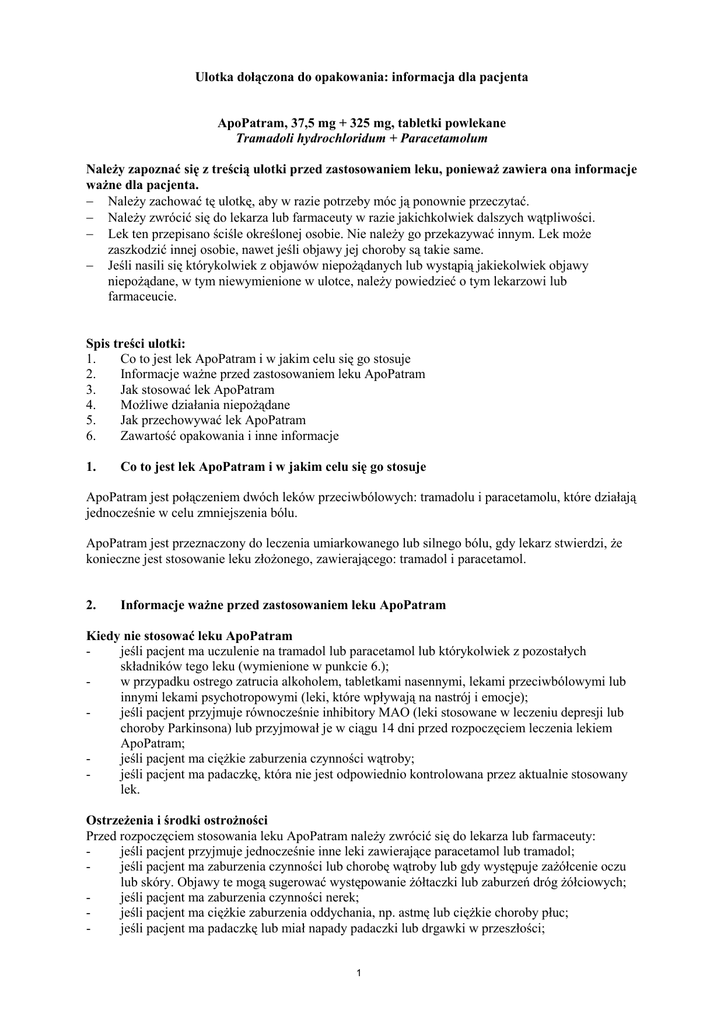 Ulotka dołączona do opakowania: informacja dla pacjenta ApoPatram, 37,5 mg + 325 mg, tabletki powlekane Tramadoli hydrochloridum + Paracetamolum Należy zapoznać się z treścią ulotki przed zastosowaniem leku, ponieważ zawiera ona informacje ważne dla pacjenta. − Należy zachować tę ulotkę, aby w razie potrzeby móc ją ponownie przeczytać. − Należy zwrócić się do lekarza lub farmaceuty w razie jakichkolwiek dalszych wątpliwości. − Lek ten przepisano ściśle określonej osobie. Nie należy go przekazywać innym. Lek może zaszkodzić innej osobie, nawet jeśli objawy jej choroby są takie same. − Jeśli nasili się którykolwiek z objawów niepożądanych lub wystąpią jakiekolwiek objawy niepożądane, w tym niewymienione w ulotce, należy powiedzieć o tym lekarzowi lub farmaceucie. Spis treści ulotki: 1. Co to jest lek ApoPatram i w jakim celu się go stosuje 2. Informacje ważne przed zastosowaniem leku ApoPatram 3. Jak stosować lek ApoPatram 4. Możliwe działania niepożądane 5. Jak przechowywać lek ApoPatram 6. Zawartość opakowania i inne informacje 1. Co to jest lek ApoPatram i w jakim celu się go stosuje ApoPatram jest połączeniem dwóch leków przeciwbólowych: tramadolu i paracetamolu, które działają jednocześnie w celu zmniejszenia bólu. ApoPatram jest przeznaczony do leczenia umiarkowanego lub silnego bólu, gdy lekarz stwierdzi, że konieczne jest stosowanie leku złożonego, zawierającego: tramadol i paracetamol. 2. Informacje ważne przed zastosowaniem leku ApoPatram Kiedy nie stosować leku ApoPatram jeśli pacjent ma uczulenie na tramadol lub paracetamol lub którykolwiek z pozostałych składników tego leku (wymienione w punkcie 6.); w przypadku ostrego zatrucia alkoholem, tabletkami nasennymi, lekami przeciwbólowymi lub innymi lekami psychotropowymi (leki, które wpływają na nastrój i emocje); jeśli pacjent przyjmuje równocześnie inhibitory MAO (leki stosowane w leczeniu depresji lub choroby Parkinsona) lub przyjmował je w ciągu 14 dni przed rozpoczęciem leczenia lekiem ApoPatram; jeśli pacjent ma ciężkie zaburzenia czynności wątroby; jeśli pacjent ma padaczkę, która nie jest odpowiednio kontrolowana przez aktualnie stosowany lek. Ostrzeżenia i środki ostrożności Przed rozpoczęciem stosowania leku ApoPatram należy zwrócić się do lekarza lub farmaceuty: jeśli pacjent przyjmuje jednocześnie inne leki zawierające paracetamol lub tramadol; jeśli pacjent ma zaburzenia czynności lub chorobę wątroby lub gdy występuje zażółcenie oczu lub skóry. Objawy te mogą sugerować występowanie żółtaczki lub zaburzeń dróg żółciowych; jeśli pacjent ma zaburzenia czynności nerek; jeśli pacjent ma ciężkie zaburzenia oddychania, np. astmę lub ciężkie choroby płuc; jeśli pacjent ma padaczkę lub miał napady padaczki lub drgawki w przeszłości; 1 - jeśli pacjent miał niedawno uraz głowy, wstrząśnienie mózgu lub silne bóle głowy, którym towarzyszyły wymioty; jeśli pacjent jest uzależniony od jakichkolwiek leków, w tym leków przeciwbólowych, takich jak morfina; jeśli pacjent stosuje inne leki przeciwbólowe, zawierające buprenorfinę, nalbufinę lub pentazocynę; jeśli u pacjenta planowane jest znieczulenie. Należy powiedzieć lekarzowi lub dentyście o stosowaniu leku ApoPatram. Należy poinformować lekarza, jeśli którakolwiek z powyższych sytuacji dotyczyła pacjenta w przeszłości lub wystąpi podczas stosowania leku ApoPatram. Lekarz zdecyduje, czy pacjent powinien kontynuować przyjmowanie tego leku. Inne leki i ApoPatram Należy powiedzieć lekarzowi lub farmaceucie o wszystkich przyjmowanych aktualnie lub ostatnio lekach, również tych, które wydawane są bez recepty. Ważne: Ten lek zawiera paracetamol i tramadol. Należy powiedzieć lekarzowi, jeśli pacjent przyjmuje inne leki zawierające paracetamol lub tramadol, aby nie przekroczyć maksymalnych dawek dobowych. Nie wolno stosować leku ApoPatram równocześnie z inhibitorami monoaminooksydazy (IMAO) (patrz punkt 2. „Kiedy nie stosować leku ApoPatram”). Należy powiedzieć lekarzowi, jeśli pacjent stosuje następujące leki, ponieważ nie zaleca się stosowania leku ApoPatram z: karbamazepiną (lek powszechnie stosowany w leczeniu padaczki lub określonych typów bólu, takich jak silne napady bólu twarzy, zwane neuralgią nerwu trójdzielnego); buprenorfiną, nalbufiną lub pentazocyną (opioidowe leki przeciwbólowe). Działanie przeciwbólowe może być osłabione. Należy powiedzieć lekarzowi, jeśli pacjent stosuje następujące leki, ponieważ ryzyko wystąpienia działań niepożądanych jest większe, jeśli pacjent przyjmuje także: leki, które mogą powodować drgawki, takie jak niektóre leki przeciwdepresyjne lub leki przeciwpsychotyczne. Ryzyko wystąpienia napadu może wzrosnąć, jeśli pacjent stosuje ApoPatram jednocześnie z tymi lekami. Lekarz powinien poinformować pacjenta, czy lek ApoPatram jest dla niego odpowiedni. niektóre leki przeciwdepresyjne. ApoPatram może oddziaływać z tymi lekami, co u pacjenta może powodować następujące objawy: mimowolne, rytmiczne kurcze mięśni, w tym mięśni, które kontrolują ruch oka, pobudzenie, nadmierne pocenie, drżenie, wzmożenie odruchów, zwiększone napięcie mięśni, ciepłota ciała powyżej 38°C. leki uspokajające, nasenne, inne leki przeciwbólowe, takie jak morfina i kodeina (również jako lek przeciwkaszlowy), baklofen (lek zwiotczający mięśnie), leki przeciwnadciśnieniowe, leki przeciwdepresyjne lub leki stosowane w leczeniu alergii. Może wystąpić senność lub uczucie omdlenia. W razie wystąpienia tych objawów należy skontaktować się z lekarzem; warfarynę lub fenprokumon (leki rozrzedzające krew). Skuteczność tych leków może ulec zmianie i mogą wystąpić krwotoki. Wszelkie przypadki długotrwałego lub niespodziewanego krwawienia należy zgłosić natychmiast lekarzowi. Należy powiedzieć le