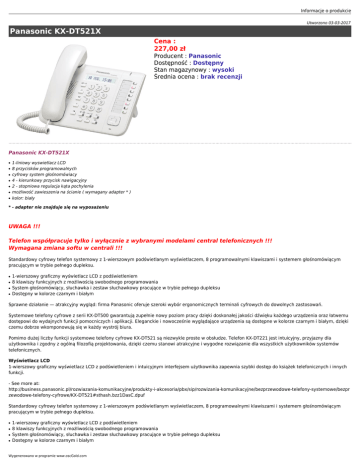 Informacje o produkcie Utworzono 03-03-2017 Panasonic KX-DT521X Cena : 227,00 zł Producent : Panasonic Dostępność : Dostępny Stan magazynowy : wysoki Średnia ocena : brak recenzji Panasonic KX-DT521X ● ● ● ● ● ● ● 1-liniowy wyswietlacz LCD 8 przycisków programowalnych cyfrowy system głośnomówiacy 4 - kierunkowy przycisk nawigacyjny 2 - stopniowa regulacja kąta pochylenia możliwość zawieszenia na ścianie ( wymagany adapter * ) kolor: biały * - adapter nie znajduje się na wyposażeniu UWAGA !!! Telefon współpracuje tylko i wyłącznie z wybranymi modelami central telefonicznych !!! Wymagana zmiana softu w centrali !!! Standardowy cyfrowy telefon systemowy z 1-wierszowym podświetlanym wyświetlaczem, 8 programowalnymi klawiszami i systemem głośnomówiącym pracującym w trybie pełnego dupleksu. ● ● ● ● 1-wierszowy graficzny wyświetlacz LCD z podświetleniem 8 klawiszy funkcyjnych z możliwością swobodnego programowania System głośnomówiący, słuchawka i zestaw słuchawkowy pracujące w trybie pełnego dupleksu Dostępny w kolorze czarnym i białym Sprawne działanie — atrakcyjny wygląd: firma Panasonic oferuje szeroki wybór ergonomicznych terminali cyfrowych do dowolnych zastosowań. Systemowe telefony cyfrowe z serii KX-DT500 gwarantują zupełnie nowy poziom pracy dzięki doskonałej jakości dźwięku każdego urządzenia oraz łatwemu dostępowi do wydajnych funkcji pomocniczych i aplikacji. Eleganckie i nowocześnie wyglądające urządzenia są dostępne w kolorze czarnym i białym, dzięki czemu dobrze wkomponowują się w każdy wystrój biura. Pomimo dużej liczby funkcji systemowe telefony cyfrowe KX-DT521 są niezwykle proste w obsłudze. Telefon KX-DT221 jest intuicyjny, przyjazny dla użytkownika i zgodny z ogólną filozofią projektowania, dzięki czemu stanowi atrakcyjne i wygodne rozwiązanie dla wszystkich użytkowników systemów telefonicznych. Wyświetlacz LCD 1-wierszowy graficzny wyświetlacz LCD z podświetleniem i intuicyjnym interfejsem użytkownika zapewnia szybki dostęp do książek telefonicznych i innych funkcji. - See more at: http://business.panasonic.pl/rozwiazania-komunikacyjne/produkty-i-akcesoria/pbx/sip/rozwizania-komunikacyjne/bezprzewodowe-telefony-systemowe/bezpr zewodowe-telefony-cyfrowe/KX-DT521#sthash.bzz1DasC.dpuf Standardowy cyfrowy telefon systemowy z 1-wierszowym podświetlanym wyświetlaczem, 8 programowalnymi klawiszami i systemem głośnomówiącym pracującym w trybie pełnego dupleksu. ● ● ● ● 1-wierszowy graficzny wyświetlacz LCD z podświetleniem 8 klawiszy funkcyjnych z możliwością swobodnego programowania System głośnomówiący, słuchawka i zestaw słuchawkowy pracujące w trybie pełnego dupleksu Dostępny w kolorze czarnym i białym Wygenerowano w programie www.oscGold.com Sprawne działanie — atrakcyjny wygląd: firma Panasonic oferuje szeroki wybór ergonomicznych terminali cyfrowych do dowolnych zastosowań. Systemowe telefony cyfrowe z serii KX-DT500 gwarantują zupełnie nowy poziom pracy dzięki doskonałej jakości dźwięku każdego urządzenia oraz łatwemu dostępowi do wydajnych funkcji pomocniczych i aplikacji. Eleganckie i nowocześnie wyglądające urządzenia są dostępne w kolorze czarnym i białym, dzięki czemu dobrze wkomponowują się w każdy wystrój biura. Pomimo dużej liczby funkcji systemowe telefony cyfrowe KX-DT521 są niezwykle proste w obsłudze. Telefon KX-DT221 jest intuicyjny, przyjazny dla użytkownika i zgodny z ogólną filozofią projektowania, dzięki czemu stanowi atrakcyjne i wygodne rozwiązanie dla wszystkich użytkowników systemów telefonicznych. Wyświetlacz LCD 1-wierszowy graficzny wyświetlacz LCD z podświetleniem i intuicyjnym interfejsem użytkownika zapewnia szybki dostęp do książek telefonicznych i innych funkcji. - See more at: http://business.panasonic.pl/rozwiazania-komunikacyjne/produkty-i-akcesoria/pbx/sip/rozwizania-komunikacyjne/bezprzewodowe-telefony-systemowe/bezpr zewodowe-telefony-cyfrowe/KX-DT521#sthash.bzz1DasC.dpuf