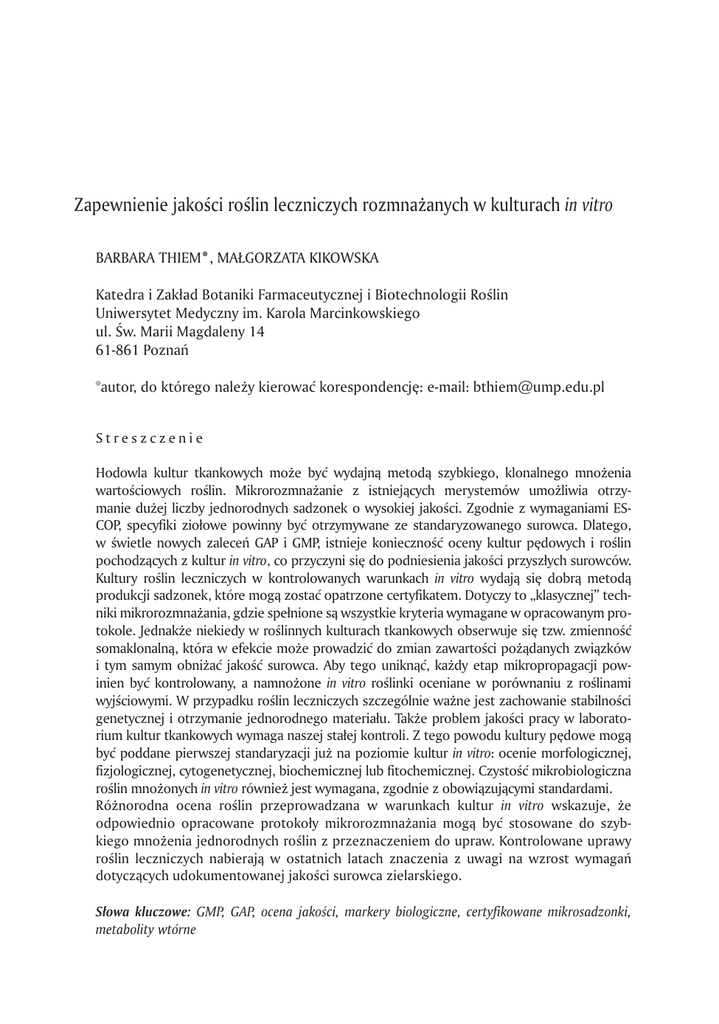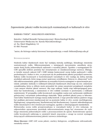 B. Thiem, M. Kikowska 168 Zapewnienie jakości roślin leczniczych rozmnażanych w kulturach in vitro BARBARA THIEM٭, MAŁGORZATA KIKOWSKA Katedra i Zakład Botaniki Farmaceutycznej i Biotechnologii Roślin Uniwersytet Medyczny im. Karola Marcinkowskiego ul. Św. Marii Magdaleny 14 61-861 Poznań *autor, do którego należy kierować korespondencję: e-mail: [email protected] Streszczenie Hodowla kultur tkankowych może być wydajną metodą szybkiego, klonalnego mnożenia wartościowych roślin. Mikrorozmnażanie z istniejących merystemów umożliwia otrzymanie dużej liczby jednorodnych sadzonek o wysokiej jakości. Zgodnie z wymaganiami ESCOP, specyfiki ziołowe powinny być otrzymywane ze standaryzowanego surowca. Dlatego, w świetle nowych zaleceń GAP i GMP, istnieje konieczność oceny kultur pędowych i roślin pochodzących z kultur in vitro, co przyczyni się do podniesienia jakości przyszłych surowców. Kultury roślin leczniczych w kontrolowanych warunkach in vitro wydają się dobrą metodą produkcji sadzonek, które mogą zostać opatrzone certyfikatem. Dotyczy to „klasycznej” techniki mikrorozmnażania, gdzie spełnione są wszystkie kryteria wymagane w opracowanym protokole. Jednakże niekiedy w roślinnych kulturach tkankowych obserwuje się tzw. zmienność somaklonalną, która w efekcie może prowadzić do zmian zawartości pożądanych związków i tym samym obniżać jakość surowca. Aby tego uniknąć, każdy etap mikropropagacji powinien być kontrolowany, a namnożone in vitro roślinki oceniane w porównaniu z roślinami wyjściowymi. W przypadku roślin leczniczych szczególnie ważne jest zachowanie stabilności genetycznej i otrzymanie jednorodnego materiału. Także problem jakości pracy w laboratorium kultur tkankowych wymaga naszej stałej kontroli. Z tego powodu kultury pędowe mogą być poddane pierwszej standaryzacji już na poziomie kultur in vitro: ocenie morfologicznej, fizjologicznej, cytogenetycznej, biochemicznej lub fitochemicznej. Czystość mikrobiologiczna roślin mnożonych in vitro również jest wymagana, zgodnie z obowiązującymi standardami. Różnorodna ocena roślin przeprowadzana w warunkach kultur in vitro wskazuje, że odpowiednio opracowane protokoły mikrorozmnażania mogą być stosowane do szybkiego mnożenia jednorodnych roślin z przeznaczeniem do upraw. Kontrolowane uprawy roślin leczniczych nabierają w ostatnich latach znaczenia z uwagi na wzrost wymagań dotyczących udokumentowanej jakości surowca zielarskiego. Słowa kluczowe: GMP, GAP, ocena jakości, markery biologiczne, certyfikowane mikrosadzonki, metabolity wtórne Zapewnienie jakości roślin leczniczych rozmnażanych w kulturach in vitro 169 Jakość jest pojęciem trudnym do zdefiniowania. Na przestrzeni wieków podejmowano liczne próby stworzenia uniwersalnej definicji [1]. Platon określił jakość jako pewien stopień doskonałości. Tworząc łaciński termin filozoficzny greckiego pojęcia, Cyceron wprowadził słowo qualitas, które przeszło do niektórych języków romańskich i germańskich. Natomiast bardziej współczesne podejście do pojęcia jakości prezentuje Crosby, stwierdzając, że jakość to zgodność z wymaganiami, wobec czego standard jakości nie pozostawia miejsca na jego wartościowanie. Uchodzący również za autorytet w dziedzinie jakości Deming definiuje to pojęcie jako przewidywany stopień jednorodności i niezawodności przy możliwie niskich kosztach i dopasowaniu do wymagań rynku. Z kolei według Feigenbauma jakość to zbiorcza charakterystyka produktu i serwisu z uwzględnieniem marketingu, projektu, wykonania i utrzymywania, która powoduje, że dany produkt i serwis spełniają oczekiwania użytkownika. Według normy PN-EN ISO 9000:2001 dotyczącej systemu zarządzania jakością jakość to stopień, w jakim zbiór inherentnych właściwości spełnia kryteria. Jakość produktu jest związana z takimi jego właściwościami handlowymi jak stopień zgodności ze wzorcem lub wyspecyfikowanymi wymaganiami, widoczność zespołu cech istotnych dla produktu i usatysfakcjonowanie nabywcy [1]. Rośliny lecznicze odgrywają istotną rolę zarówno w tradycyjnej, jak i nowoczesnej fitoterapii. Współczesne lecznictwo oferuje duży asortyment leków pochodzenia roślinnego o szerokim spektrum działania farmakologicznego. Surowce roślinne wykorzystuje się do izolacji jednorodnych związków, bądź jako składniki specyfików ziołowych. Wiele gatunków rzadkich, niedostępnych lub zagrożonych wyginięciem roślin leczniczych może stać się łatwo dostępnym surowcem dla przemysłu farmaceutycznego dzięki metodzie rozmnażania klonalnego w kulturach in vitro [2] (ryc. 1). Metoda mikrorozmnażania roślin leczniczych zalecana jest dla gatunków: • które nie zawiązują nasion lub tworzą nieliczne nasiona najczęściej charakteryzujące się niską żywotnością i słabą siłą kiełkowania; • produkujących drogie nasiona; • rzadkich, endemicznych lub chronionych; • pochodzących z innej strefy klimatycznej, gdzie są stosowane w medycynie tradycyjnej, a mogą być aklimatyzowane w krajowych warunkach. W ostatnich latach obserwuje się intensyfikację upraw polowych roślin leczniczych, ale nadal dużą część gatunków pozyskuje się ze stanu naturalnego, czego rezultatem jest stopniowe kurczenie się zasobów naturalnych. Pierwsze próby zakładania plantacji roślin leczniczych podejmowano w końcu XIX w. Przed II wojną światową cały obszar upraw polowych wynosił 500 ha. Hodowano przede wszystkim miętę, rumianek, walerianę i naparstnicę. Obecnie wynosi on 20 000 ha, a hoduje się 70 gatunków roślin leczniczych i aromatycznych [3]. Vol. 54 No 4 2008 B. Thiem, M. Kikowska 170 Rycina 1. Etapy procesu mikrorozmnażania roślin na przykładzie Eryngium planum L. Konwencjonalne rozmnażanie roślin przebiega bardzo powoli, a w przypadku wielu gatunków jest nieefektywne. Natomiast w w