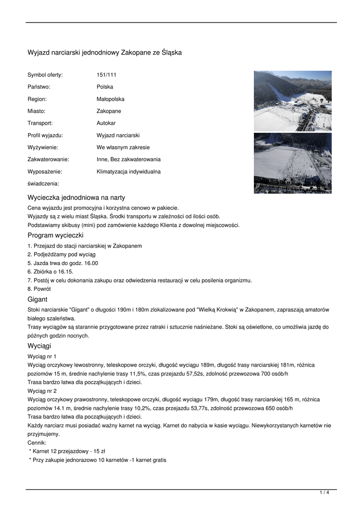 Wyjazd narciarski jednodniowy Zakopane ze Śląska