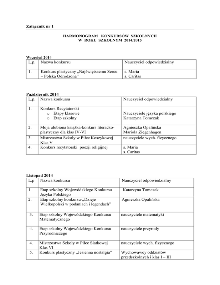 Załącznik nr 1 HARMONOGRAM KONKURSÓW SZKOLNYCH W ROKU SZKOLNYM 2014/2015 Wrzesień 2014 L.p. Nazwa konkursu Nauczyciel odpowiedzialny 1. Konkurs plastyczny „Najświętszemu Sercu – Polska Odrodzona” s. Maria s. Caritas Październik 2014 L.p. Nazwa konkursu 1. 2. 3. 4. Konkurs Recytatorski o Etapy klasowe o Etap szkolny Moja ulubiona książka-konkurs literackoplastyczny dla klas IV-VI Mistrzostwa Szkoły w Piłce Koszykowej Klas V Konkurs recytatorski poezji religijnej Listopad 2014 L.p Nazwa konkursu 1. 2. Etap szkolny Wojewódzkiego Konkursu Języka Polskiego Etap szkolny konkursu-„Dzieje Wielkopolski w podaniach i legendach” Nauczyciel odpowiedzialny Nauczyciele języka polskiego Katarzyna Tomczak Agnieszka Opalińska Mariola Ziegenhagen nauczyciele wych. fizycznego s. Maria s. Caritas Nauczyciel odpowiedzialny Katarzyna Tomczak Agnieszka Opalińska 3. Etap szkolny Wojewódzkiego Konkursu Matematycznego nauczyciele matematyki 4. Etap szkolny Wojewódzkiego Konkursu Przyrodniczego nauczyciele przyrody 4. Mistrzostwa Szkoły w Piłce Siatkowej Klas VI Konkurs plastyczny „Jesienna nostalgia” nauczyciele wych. fizycznego 5. Wychowawcy oddziałów przedszkolnych i klas I – III Koordynatorzy: N. Gawrych P.Filipiak Grudzień 2014 L.p. Nazwa konkursu 1. Konkurs Ortograficzny o tytuł Mistrza Ortografii Etapy klasowe Etap szkolny Nauczyciel odpowiedzialny Nauczyciele języka polskiego Anna Kaczmarek 2. Etap szkolny Konkursu Wiedzy o Wielkopolsce Katarzyna Roszkiewicz 3. Konkurs Plastyczny „Anioły, Aniołki, Aniołeczki”. Mirosława Surdyk 4. Plastyczny Konkurs Świąteczny 5. Konkurs kolęd s. Maria s. Caritas 6. Konkurs plastyczny „Mali kolędnicy” K. Bajon M. Polus Sabina Chojnowska Styczeń 2015 L.p. Nazwa konkursu Nauczyciel odpowiedzialny 1. Konkurs Kolęd Magdalena Ruks 2. Konkurs Czytelniczy dla klas IV, V, VI. Dorota Konieczna 3. Konkurs Wiedzy o Krajach Anglojęzycznych Konkurs plastyczny „Zimowy pejzaż” nauczyciele języka angielskiego 4. 5. „Najpiękniejsza maska karnawałowa” konkurs plastyczny Wychowawcy oddziałów przedszkolnych i klas I – III Koordynatorzy A. Stroińska E. Zając Wychowawcy klas II – III Koordynatorzy: D. Szymańska G. Rogalka 6. „Nasza koleżanka Kasia” konkurs czytelnictwa na podstawie książki M. Jaworczak „Oto jest Kasia”. Luty 2015 L.p Nazwa konkursu 1. Etap szkolny Powiatowego Konkursu Wokalnego i Instrumentalnego MICROFONIA 2. Etap szkolny konkursu „Bajkowy świat” ( klasy II- IV) 3. Piosenka jest dobra na wszystko”- konkurs piosenki dla klas IV, V, VI Marzec 2015 L.p. Nazwa konkursu M. Ziegenhagen A. Opalińska Nauczyciel odpowiedzialny Magdalena Ruks Mariola Ziegenhagen Magdalena Ruks Nauczyciel odpowiedzialny 1. Konkurs Literacki o Tytuł Mistrza Pióra dla klas IV, V, VI. Dorota Konieczna, Katarzyna Tomczak, Anna Kaczmarek 2. Powiatowy Konkurs Matematyczny Krystyna Hetmańska 3. Test integrowany „Zuch” M. Matoszko - Zagrodzka P. Filipiak 4. Konkurs wiedzy o przyrodzie M. Henschel D. Szymańska Kwiecień 2015 L.p. Nazwa konkursu Nauczyciel odpowiedzialny 2. Szkolny Konkurs o tytuł Mistrza Gramatyki Znam lektury szkolne- konkurs czytelniczy dla klas IV, V, VI. Anna Kaczmarek, Dorota Konieczna, Katarzyna Tomczak Agnieszka Opalińska, Mariola Ziegenhagen 3. Mistrz Klawiatury kl. V i VI Małgorzata Popa Mistrz Painta kl. IV Małgorzata Popa Liliana Chmura Borkowska 1. 4. 5. Konkurs plastyczny „Wielkanocny stół” 6. Konkurs plastyczny „Konie, jednorożce, smoki i inne postaci fantastyczne” Wychowawcy klas I – III Koordynatorzy B. Schmidt R. Wieczorek Wychowawcy oddziałów przedszkolnych i klas I – III Koordynatorzy: R. Łech A. Piszczek M. Nowaczyk M. Włodarczyk 7. Konkurs piosenki anglojęzycznej 8. „Lubię matematykę” – konkurs matematyczny dla klas II J. Kuklewska R. Michalska 9. Konkurs przyrodniczy dla klas II M. Matoszko-Zagrodzka Maj 2015 L.p. Nazwa konkursu Nauczyciel odpowiedzialny 1. Konkurs Historyczny dla klas IV, V, VI Katarzyna Roszkiewicz 2. Konkurs Czytelniczy dla klas IV, V, VI. Dorota Konieczna 3. Najlepszy Matematyk kl. IV, V, VI nauczyciele matematyki 4. Najlepszy Przyrodnik kl. IV, V ,VI nauczyciele przyrody 5. Konkurs Wiedzy o Obornikach Katarzyna Roszkiewicz 6. Konkurs Leksykalno Gramatyczny z Języka Angielskiego Konkurs Leksykalno Gramatyczny z Języka Niemieckiego nauczyciele języka angielskiego Konkurs plastyczny dla klas I „Bohaterowie wierszy E. Szelbrug - Zarembiny M. Ziegenhagen 7. 8. Sabina Chojnowska Czerwiec 2015 Lp. 1. Nazwa konkursu Dzień Języków Obcych Nauczyciel odpowiedzialny nauczyciele języków obcych 2. „Mistrz klasy II” - konkurs gramatyczno- M. Nowaczyk M. Włodarczyk leksykalny 3. Konkurs „Mistrz języka angielskiego klas III” (konkurs leksykalno -gramatyczny ) M. Nowaczyk M. Włodarczyk 4. Turniej piłki nożnej dla klas II koordynatorzy M.Lewicka M.Pałosz 5. Zawody sportowe „Olimpiada III klas” koordynatorzy M.Lewicka M.Pałosz 6. Olimpiada Małych Mistrzów – podsumowanie projektu „Mały Mistrz koordynatorzy M.Lewicka M.Pałosz Szkoła jest organizatorem Miejsko- Gminnego Konkursu Recytatorskiego „Spotkania z poezją”, który odbędzie się na początku roku 2015 (kwiecień).