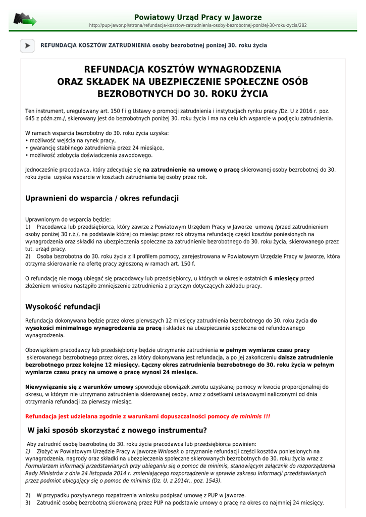 Powiatowy Urząd Pracy w Jaworze http://pup-jawor.pl/strona/refundacja-kosztow-zatrudnienia-osoby-bezrobotnej-poniżej-30-roku-życia/282 REFUNDACJA KOSZTÓW ZATRUDNIENIA osoby bezrobotnej poniżej 30. roku życia REFUNDACJA KOSZTÓW WYNAGRODZENIA ORAZ SKŁADEK NA UBEZPIECZENIE SPOŁECZNE OSÓB BEZROBOTNYCH DO 30. ROKU ŻYCIA Ten instrument, uregulowany art. 150 f i g Ustawy o promocji zatrudnienia i instytucjach rynku pracy /Dz. U z 2016 r. poz. 645 z późn.zm./, skierowany jest do bezrobotnych poniżej 30. roku życia i ma na celu ich wsparcie w podjęciu zatrudnienia. W ramach wsparcia bezrobotny do 30. roku życia uzyska: • możliwość wejścia na rynek pracy, • gwarancję stabilnego zatrudnienia przez 24 miesiące, • możliwość zdobycia doświadczenia zawodowego. Jednocześnie pracodawca, który zdecyduje się na zatrudnienie na umowę o pracę skierowanej osoby bezrobotnej do 30. roku życia uzyska wsparcie w kosztach zatrudniania tej osoby przez rok. Uprawnieni do wsparcia / okres refundacji Uprawnionym do wsparcia będzie: 1) Pracodawca lub przedsiębiorca, który zawrze z Powiatowym Urzędem Pracy w Jaworze umowę /przed zatrudnieniem osoby poniżej 30 r.ż./, na podstawie której co miesiąc przez rok otrzyma refundację części kosztów poniesionych na wynagrodzenia oraz składki na ubezpieczenia społeczne za zatrudnienie bezrobotnego do 30. roku życia, skierowanego przez tut. urząd pracy. 2) Osoba bezrobotna do 30. roku życia z II profilem pomocy, zarejestrowana w Powiatowym Urzędzie Pracy w Jaworze, która otrzyma skierowanie na ofertę pracy zgłoszoną w ramach art. 150 f. O refundację nie mogą ubiegać się pracodawcy lub przedsiębiorcy, u których w okresie ostatnich 6 miesięcy przed złożeniem wniosku nastąpiło zmniejszenie zatrudnienia z przyczyn dotyczących zakładu pracy. Wysokość refundacji Refundacja dokonywana będzie przez okres pierwszych 12 miesięcy zatrudnienia bezrobotnego do 30. roku życia do wysokości minimalnego wynagrodzenia za pracę i składek na ubezpieczenie społeczne od refundowanego wynagrodzenia. Obowiązkiem pracodawcy lub przedsiębiorcy będzie utrzymanie zatrudnienia w pełnym wymiarze czasu pracy skierowanego bezrobotnego przez okres, za który dokonywana jest refundacja, a po jej zakończeniu dalsze zatrudnienie bezrobotnego przez kolejne 12 miesięcy. Łączny okres zatrudnienia bezrobotnego do 30. roku życia w pełnym wymiarze czasu pracy na umowę o pracę wynosi 24 miesiące. Niewywiązanie się z warunków umowy spowoduje obowiązek zwrotu uzyskanej pomocy w kwocie proporcjonalnej do okresu, w którym nie utrzymano zatrudnienia skierowanej osoby, wraz z odsetkami ustawowymi naliczonymi od dnia otrzymania refundacji za pierwszy miesiąc. Refundacja jest udzielana zgodnie z warunkami dopuszczalności pomocy de minimis !!! W jaki sposób skorzystać z nowego instrumentu? Aby zatrudnić osobę bezrobotną do 30. roku życia pracodawca lub przedsiębiorca powinien: 1) Złożyć w Powiatowym Urzędzie Pracy w Jaworze Wniosek o przyznanie refundacji części kosztów poniesionych na wynagrodzenia, nagrody oraz składki na ubezpieczenia społeczne skierowanych bezrobotnych do 30. roku życia wraz z Formularzem informacji przedstawianych przy ubieganiu się o pomoc de minimis, stanowiącym załącznik do rozporządzenia Rady Ministrów z dnia 24 listopada 2014 r. zmieniającego rozporządzenie w sprawie zakresu informacji przedstawianych przez podmiot ubiegający się o pomoc de minimis (Dz. U. z 2014r., poz. 1543). 2) 3) W przypadku pozytywnego rozpatrzenia wniosku podpisać umowę z PUP w Jaworze. Zatrudnić osobę bezrobotną skierowaną przez PUP na podstawie umowy o pracę na okres co najmniej 24 miesięcy. Szczegółowych informacji udziela: Doradca klienta Justyna Palińska– Tel. 76 729 11 13 – pok. 13 /I piętro/ Centrum Aktywizacji Zawodowej Powiatowego Urzędu Pracy w Jaworze, ul. Strzegomska 7, 59 – 400 Jawor. Zasady przyznawania refundacji i wniosek dostępne w zakładce "Dokumenty do pobrania" kliknij tutaj...