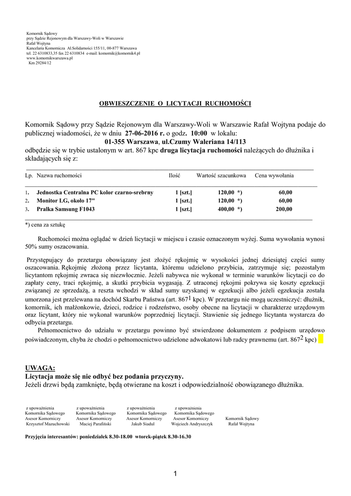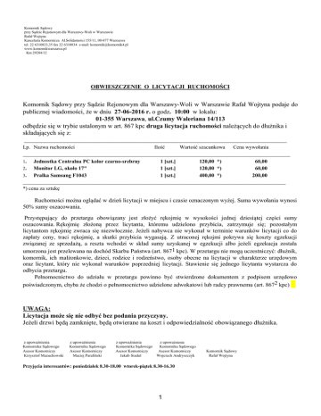 Komornik Sądowy przy Sądzie Rejonowym dla Warszawy-Woli w Warszawie Rafał Wojtyna Kancelaria Komornicza Al.Solidarności 155/11, 00-877 Warszawa tel. 22 6310833,35 fax 22 6310834 e-mail: [email protected] www.komornikwarszawa.pl Km 29284/12 OBWIESZCZENIE O LICYTACJI RUCHOMOŚCI Komornik Sądowy przy Sądzie Rejonowym dla Warszawy-Woli w Warszawie Rafał Wojtyna podaje do publicznej wiadomości, że w dniu 27-06-2016 r. o godz. 10:00 w lokalu: 01-355 Warszawa, ul.Czumy Waleriana 14/113 odbędzie się w trybie ustalonym w art. 867 kpc druga licytacja ruchomości należących do dłużnika i składających się z: _______________________________________________________________________________________________________________________ Lp. Nazwa ruchomości Ilość Wartość szacunkowa Cena wywołania _________________________________________________________________________________________________________________________ 1. 2. 3. Jednostka Centralna PC kolor czarno-srebrny Monitor LG, około 17" Pralka Samsung F1043 1 [szt.] 1 [szt.] 1 [szt.] 120,00 *) 120,00 *) 400,00 *) 60,00 60,00 200,00 _______________________________________________________________________________________________________________________ *) cena za sztukę Ruchomości można oglądać w dzień licytacji w miejscu i czasie oznaczonym wyżej. Suma wywołania wynosi 50% sumy oszacowania. Przystępujący do przetargu obowiązany jest złożyć rękojmię w wysokości jednej dziesiątej części sumy oszacowania. Rękojmię złożoną przez licytanta, któremu udzielono przybicia, zatrzymuje się; pozostałym licytantom rękojmię zwraca się niezwłocznie. Jeżeli nabywca nie wykonał w terminie warunków licytacji co do zapłaty ceny, traci rękojmię, a skutki przybicia wygasają. Z utraconej rękojmi pokrywa się koszty egzekucji związanej ze sprzedażą, a reszta wchodzi w skład sumy uzyskanej w egzekucji albo jeżeli egzekucja została umorzona jest przelewana na dochód Skarbu Państwa (art. 8671 kpc). W przetargu nie mogą uczestniczyć: dłużnik, komornik, ich małżonkowie, dzieci, rodzice i rodzeństwo, osoby obecne na licytacji w charakterze urzędowym oraz licytant, który nie wykonał warunków poprzedniej licytacji. Stawienie się jednego licytanta wystarcza do odbycia przetargu. Pełnomocnictwo do udziału w przetargu powinno być stwierdzone dokumentem z podpisem urzędowo poświadczonym, chyba że chodzi o pełnomocnictwo udzielone adwokatowi lub radcy prawnemu (art. 8672 kpc) UWAGA: Licytacja może się nie odbyć bez podania przyczyny. Jeżeli drzwi będą zamknięte, będą otwierane na koszt i odpowiedzialność obowiązanego dłużnika. z upoważnienia Komornika Sądowego Asesor Komorniczy Krzysztof Mazuchowski z upoważnienia Komornika Sądowego Asesor Komorniczy Maciej Parafiński z upoważnienia Komornika Sądowego Asesor Komorniczy Jakub Siadul z upoważnienia Komornika Sądowego Asesor Komorniczy Wojciech Andryszczyk Przyjęcia interesantów: poniedziałek 8.30-18.00 wtorek-piątek 8.30-16.30 1 Komornik Sądowy Rafał Wojtyna