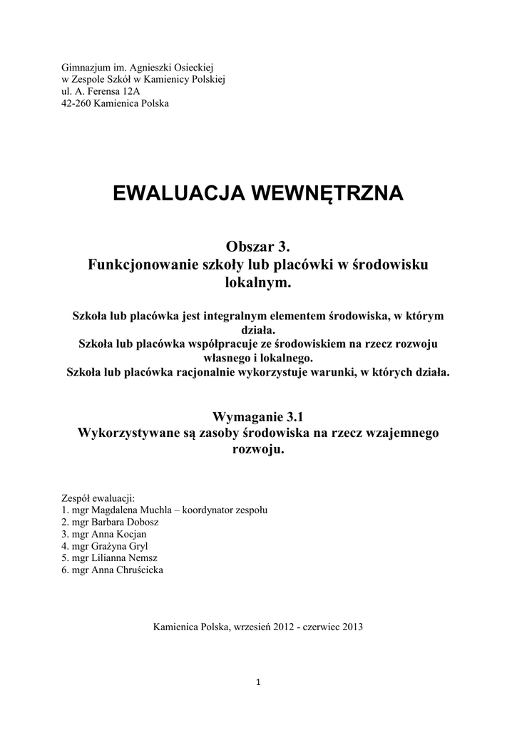 Gimnazjum im. Agnieszki Osieckiej w Zespole Szkół w Kamienicy Polskiej ul. A. Ferensa 12A 42-260 Kamienica Polska EWALUACJA WEWNĘTRZNA Obszar 3. Funkcjonowanie szkoły lub placówki w środowisku lokalnym. Szkoła lub placówka jest integralnym elementem środowiska, w którym działa. Szkoła lub placówka współpracuje ze środowiskiem na rzecz rozwoju własnego i lokalnego. Szkoła lub placówka racjonalnie wykorzystuje warunki, w których działa. Wymaganie 3.1 Wykorzystywane są zasoby środowiska na rzecz wzajemnego rozwoju. Zespół ewaluacji: 1. mgr Magdalena Muchla – koordynator zespołu 2. mgr Barbara Dobosz 3. mgr Anna Kocjan 4. mgr Grażyna Gryl 5. mgr Lilianna Nemsz 6. mgr Anna Chruścicka Kamienica Polska, wrzesień 2012 - czerwiec 2013 1 Spis rzeczy: I. II. III. IV. Plan pracy zespołu ewaluacyjnego Przedmiot badania – pytania kluczowe Źródła danych i narzędzia badawcze Raport z ewaluacji wewnętrznej 2 Kamienica Polska, 30 września 2012r. Plan pracy zespołu ewaluacyjnego Zespół ewaluacji: 1. mgr Magdalena Muchla – koordynator zespołu 2. mgr Barbara Dobosz 3. mgr Anna Kocjan 4. mgr Grażyna Gryl 5. mgr Lilianna Nemsz 6. mgr Anna Chruścicka Ewaluację wewnętrzną przeprowadza się na podstawie § 20 rozporządzenia Ministra Edukacji Narodowej z dnia 7 października 2009 r. w sprawie nadzoru pedagogicznego (Dz. U. Nr 168, poz. 1324). Ewaluacji poddawane jest Wymaganie 3.1. Wykorzystywane są zasoby środowiska na rzecz wzajemnego rozwoju w Obszarze 3. Funkcjonowanie szkoły lub placówki w środowisku lokalnym. ( Szkoła lub placówka podejmuje inicjatywy na rzecz środowiska. Szkoła lub placówka współpracuje z instytucjami i organizacjami działającymi w środowisku) Cel ewaluacji: Czy szkoła podejmuje inicjatywy na rzecz środowiska i czy współpracuje z różnymi podmiotami działającymi w środowisku? Harmonogram planowanych działań 1. Sformułowanie pytań kluczowych (przedmiotu badania) X 2012r. 2. Określenie źródeł danych i dobór próby badawczej X 2012r. 3. Opracowanie narzędzi badawczych XI-XII 2012r. 4. Przeprowadzenie badań II 2012r. 5. Opracowanie wyników badań IV 2012r. 6. Sformułowanie wniosków i opracowanie raportu VI 2012r. 7. Przedstawienie Radzie Pedagogicznej wyników przeprowadzonej ewaluacji 3 VI 2012r. Przedmiot badania – pytania kluczowe Cel ewaluacji: Czy szkoła podejmuje inicjatywy na rzecz środowiska i czy współpracuje z różnymi podmiotami działającymi w środowisku? Pytania kluczowe 1. Czy i w jaki sposób szkoła współpracuje z różnymi instytucjami i organizacjami działającymi w środowisku? 2. Czy organizowane są imprezy na rzecz środowiska i podejmowane wspólne inicjatywy służące edukacji, wychowaniu i promocji regionu? 3. Czy współpraca sprzyja zaspokajaniu potrzeb zarówno szkoły jak i środowiska i przynosi obopólne korzyści szkole i lokalnej społeczności? 4. Jak współpraca szkoły z podmiotami działającymi w środowisku wpływa na rozwój uczniów? 5. Czy szkoła korzysta z zasobów środowiska w procesie nauczania? 6. W jaki sposób szkoła identyfikuje potrzeby i możliwości środowiska lokalnego? Wymagania, które muszą być spełnione w obszarze 3. Funkcjonowanie szkoły lub placówki w środowisku lokalnym. ( Szkoła lub placówka podejmuje inicjatywy na rzecz środowiska. Szkoła lub placówka współpracuje z instytucjami i organizacjami działającymi w środowisku) Wymaganie 3.1. Wykorzystywane są zasoby środowiska na rzecz wzajemnego rozwoju. Charakterystyka wymagania - Poziom D: Szkoła lub placówka podejmuje inicjatywy na rzecz środowiska. Szkoła lub placówka współpracuje z instytucjami i organizacjami działającymi w środowisku. Charakterystyka wymagania - Poziom B: W działaniach szkoły lub placówki są uwzględnione możliwości i potrzeby środowiska. Współpraca szkoły lub placówki z instytucjami i organizacjami działającymi w środowisku wpływa korzystnie na rozwój edukacyjny uczniów. Poziom A ustala się, jeżeli szkoła lub placówka spełnia dane wymaganie na poziomie wyższym niż poziom B. Poziom C ustala się, jeżeli szkoła lub placówka spełnia dane wymaganie na poziomie wyższym niż poziom D, ale niższym niż poziom B. Poziom E ustala się, jeżeli szkoła lub placówka nie spełnia danego wymagania na poziomie. 4 Źródła danych i narzędzia badawcze Źródła danych protokoły posiedzeń Rad Pedagogicznych, dzienniki lekcyjne, akademie szkolne, uroczystości środowiskowe, kroniki szkolne, ankiety przeprowadzone wśród uczniów, rodziców i nauczycieli, wywiady z nauczycielami i dyrektorem szkoły, artykuły z lokalnej prasy, zdjęcia, obserwacja szkoły. Narzędzia badawcze: ankieta dla uczniów ankieta dla rodziców ankieta dla nauczycieli wywiad z nauczycielami ankieta dla dyrektora wywiad z dyrektorem szkoły 5 Gimnazjum im. Agnieszki Osieckiej w Zespole Szkół w Kamienicy Polskiej ul. A. Ferensa 12A 42-260 Kamienica Polska RAPORT Z EWALUACJI WEWNĘTRZNEJ Obszar 3. Funkcjonowanie szkoły lub placówki w środowisku lokalnym. Szkoła lub placówka jest integralnym elementem środowiska, w którym działa. Szkoła lub placówka współpracuje ze środowiskiem na rzecz rozwoju własnego i lokalnego. Szkoła lub placówka racjonalnie wykorzystuje warunki, w których działa. Wymaganie 3.1 Wykorzystywane są zasoby środowiska na rzecz wzajemnego rozwoju. Zespół ewaluacji: 1. mgr Magdalena Muchla – koordynator zespołu 2. mgr Barbara Dobosz 3. mgr Anna Kocjan 4. mgr Grażyna Gryl 5. mgr Lilianna Nemsz 6. mgr Anna Chruścicka Kamienica Polska, czerwiec 2013 6 Ewaluację wewnętrzną przeprowadzono się na podstawie § 20 rozporządzenia Ministra Edukacji Narodowej z dnia 7 października 2009 r. w sprawie nadzoru pedagogicznego (Dz. U. Nr 168, poz. 1324). Ewaluacji poddawane jest Wymaganie 3.1. Wykorzystywane są zasoby środowiska na rzecz wzajemnego rozwoju w Obszarze 3. Funkcjonowanie szkoły lub placówki 