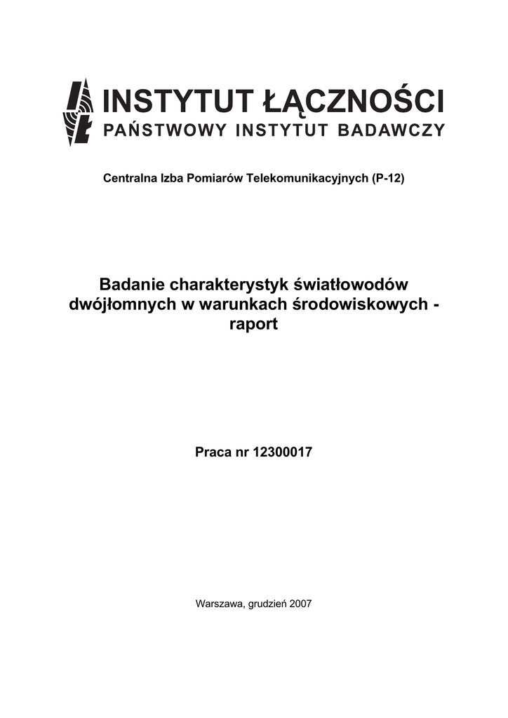 Centralna Izba Pomiarów Telekomunikacyjnych (P-12) Badanie charakterystyk światłowodów dwójłomnych w warunkach środowiskowych raport Praca nr 12300017 Warszawa, grudzień 2007 Badanie charakterystyk światłowodów dwójłomnych w warunkach środowiskowych – raport. Praca nr 12300017 Słowa kluczowe: dyspersja polaryzacyjna, dwójłomność, wzorzec, wzorcowanie Kierownik pracy: mgr inż. Marta Buryk Wykonawcy pracy: mgr inż. Marta Buryk mgr inż. Tomasz Osuch dr inż. Tomasz Kossek inż. Andrzej Zawiślański inż. Paweł Kliś technik Andrzej Stułka Kierownik Zakładu: inż. Anna Warzec © Copyright by Instytut Łączności, Warszawa 2007 1. Wstęp ...................................................................................................................... 4 2. Dyspersja polaryzacyjna....................................................................................... 5 2.1 Informacje ogólne................................................................................................. 5 2.1.1 Zjawisko dyspersji polaryzacyjnej ............................................................. 5 2.1.2 Wartość dyspersji polaryzacyjnej.............................................................. 6 2.1.3 Współczynnik dyspersji polaryzacyjnej..................................................... 6 2.1.4 Wektor dyspersji polaryzacyjnej................................................................ 6 2.2 Metody pomiarowe............................................................................................... 9 2.2.1 Metoda stałego analizatora....................................................................... 9 2.2.2 Metoda interferometryczna ..................................................................... 10 2.2.3 Metoda macierzy Jonesa ........................................................................ 11 3. Światłowody dwójłomne ..................................................................................... 12 4. Pokrycie pierwotne światłowodów .................................................................... 15 5. Czynniki wpływające na włókno w pokryciu pierwotnym............................... 17 5.1 Zmienne temperatury i wilgotność powietrza..................................................... 17 5.1.1 Wpływ zmiennych temperatur................................................................. 17 5.1.2 Wpływ wilgotności................................................................................... 17 5.2 Relaksacja i krystalizacja pokrycia..................................................................... 18 5.2.1 Relaksacja pokrycia ................................................................................ 18 5.2.2 Krystalizacja pokrycia ............................................................................. 18 6. Naprężenia działające na włókno szklane......................................................... 19 6.1 Naprężenia wywoływane przez pokrycie pierwotne jednowarstwowe .............. 19 6.2 Naprężenia wywoływane przez pokrycie pierwotne dwuwarstwowe ................ 19 6.3 Wyboczenie włókna światłowodowego.............................................................. 20 6.4 Inne przyczyny powstawania naprężeń ............................................................. 20 7. Badania środowiskowe....................................................................................... 21 7.1 Rodzaje badań środowiskowych ....................................................................... 21 7.2 Współczynnik przyspieszenia ............................................................................ 21 7.3 Modele stosowane w przyspieszonych badaniach środowiskowych ................ 21 8. Wykonane pomiary.............................................................................................. 23 8.1 Pomiary wykonane w zmiennych temperaturach .............................................. 23 8.2 Badania starzeniowe.......................................................................................... 27 8.3 Niepewność pomiarów....................................................................................... 28 8.3.1 Niepewność pomiarów wykonywanych metodą stałego analizatora...... 28 8.3.2 Niepewność pomiarów wykonywanych metodą macierzy Jonesa......... 30 9. Wnioski ................................................................................................................. 31 Bibliografia................................................................................................................... 32 1. Wstęp Dyspersja polaryzacyjna (PMD - polarization mode dispersion) powoduje poszerzenie impulsu w dziedzinie czasu. Jest ona kluczowym ograniczeniem w wysoko przepustowych systemach optycznych (systemy o przepływnościach 10 Gbit/s i 40 Gbit/s). Efektem jej działania jest obniżenie stosunku sygnału do szumów i pojawienie się interferencji międzysymbolowej. Jeśli sygnał zostanie zakłócony w wysokim stopniu, może nastąpić przerwanie działania systemu. Dlatego na całym świecie prowadzone są intensywne badania mające ograniczyć skutki działania dyspersji polaryzacyjnej w wysoko przepustowych systemach telekomunikacyjnych. Niniejszy raport przedstawia wyniki badań charakterystyk światłowodów wysoko dwójłomnych różnych typów otrzymane podczas badań klimatycznych i starzeniowych. 4 2. Dyspersja polaryzacyjna 2.1 Informacje ogólne 2.1.1 Zjawisko dyspersji polaryzacyjnej Dyspersja polaryzacyjna jest spowodowana asymetriami, które powstają w rdzeniu światłowodu. Asymetrie te są skutkiem działania czynników wewnętrznych (powstają w czasie produkcji włókna) i zewnętrznych (odkształcenia mechaniczne). Efektem występowania tych asymetrii jest dwójłomność. Jest to zależność współczynnika załamania od stanu polaryzacji. Dwójłomność jest spowodowana przez anizotropowy rozkład współczynnika za