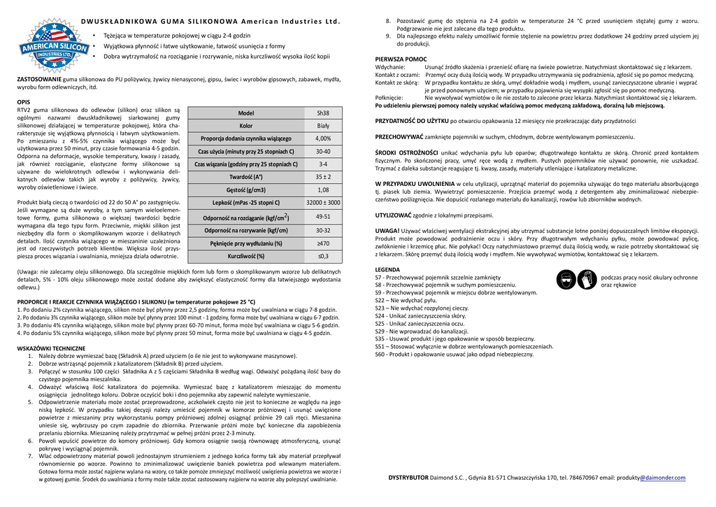 D W U S K Ł A D N I K O WA G U M A S I L I K O N O WA A m e r i c a n I n d u s t r i e s L t d . • Tężejąca w temperaturze pokojowej w ciągu 2-4 godzin • Wyjątkowa płynność i łatwe użytkowanie, łatwość usunięcia z formy • Dobra wytrzymałość na rozciąganie i rozrywanie, niska kurczliwość wysoka ilość kopii ZASTOSOWANIE guma silikonowa do PU poliżywicy, żywicy nienasyconej, gipsu, świec i wyrobów gipsowych, zabawek, mydła, wyrobu form odlewniczych, itd. OPIS RTV2 guma silikonowa do odlewów (silikon) oraz silikon są ogólnymi nazwami dwuskładnikowej siarkowanej gumy silikonowej działającej w temperaturze pokojowej, która charakteryzuje się wyjątkową płynnością i łatwym użytkowaniem. Po zmieszaniu z 4%-5% czynnika wiążącego może być użytkowana przez 50 minut, przy czasie formowania 4-5 godzin. Odporna na deformacje, wysokie temperatury, kwasy i zasady, jak również rozciąganie, elastyczne formy silikonowe są używane do wielokrotnych odlewów i wykonywania delikatnych odlewów takich jak wyroby z poliżywicy, żywicy, wyroby oświetleniowe i świece. Produkt białą cieczą o twardości od 22 do 50 A° po zastygnięciu. Jeśli wymagane są duże wyroby, a tym samym wieloelementowe formy, guma silikonowa o większej twardości będzie wymagana dla tego typu form. Przeciwnie, miękki silikon jest niezbędny dla form o skomplikowanym wzorze i delikatnych detalach. Ilość czynnika wiążącego w mieszaninie uzależniona jest od rzeczywistych potrzeb klientów. Większa ilość przyspiesza proces wiązania i uwalniania, mniejsza działa odwrotnie. 8. Pozostawić gumę do stężenia na 2-4 godzin w temperaturze 24 °C przed usunięciem stężałej gumy z wzoru. Podgrzewanie nie jest zalecane dla tego produktu. 9. Dla najlepszego efektu należy umożliwić formie stężenie na powietrzu przez dodatkowe 24 godziny przed użyciem jej do produkcji. PIERWSZA POMOC Wdychanie: Usunąć źródło skażenia i przenieść ofiarę na świeże powietrze. Natychmiast skontaktować się z lekarzem. Kontakt z oczami: Przemyć oczy dużą ilością wody. W przypadku utrzymywania się podrażnienia, zgłosić się po pomoc medyczną. Kontakt ze skórą: W przypadku kontaktu ze skórą, umyć dokładnie wodą i mydłem, usunąć zanieczyszczone ubranie i wyprać je przed ponownym użyciem; w przypadku pojawienia się wysypki zgłosić się po pomoc medyczną. Połknięcie: Nie wywoływać wymiotów o ile nie zostało to zalecone przez lekarza. Natychmiast skontaktować się z lekarzem. Po udzieleniu pierwszej pomocy należy uzyskać właściwą pomoc medyczną zakładową, doraźną lub miejscową. Model Sh38 Kolor Biały Proporcja dodania czynnika wiążącego 4,00% PRZECHOWYWAĆ zamknięte pojemniki w suchym, chłodnym, dobrze wentylowanym pomieszczeniu. ŚRODKI OSTROŻNOŚCI unikać wdychania pyłu lub oparów; długotrwałego kontaktu ze skórą. Chronić przed kontaktem fizycznym. Po skończonej pracy, umyć ręce wodą z mydłem. Pustych pojemników nie używać ponownie, nie uszkadzać. Trzymać z daleka substancje reagujące tj. kwasy, zasady, materiały utleniające i katalizatory metaliczne. PRZYDATNOŚĆ DO UŻYTKU po otwarciu opakowania 12 miesięcy nie przekraczając daty przydatności Czas użycia (minuty przy 25 stopniach C) 30-40 Czas wiązania (godziny przy 25 stopniach C) 3-4 Twardość (A°) 35 ± 2 Gęstość (g/cm3) 1,08 Lepkość (mPas -25 stopni C) 32000 ± 3000 Odporność na rozciąganie (kgf/cm2) 49-51 UTYLIZOWAĆ zgodnie z lokalnymi przepisami. Odporność na rozrywanie (kgf/cm) 30-32 Pęknięcie przy wydłużaniu (%) ≥470 Kurczliwość (%) ≤0,3 UWAGA! Używać właściwej wentylacji ekstrakcyjnej aby utrzymać substancje lotne poniżej dopuszczalnych limitów ekspozycji. Produkt może powodować podrażnienie oczu i skóry. Przy długotrwałym wdychaniu pyłku, może powodować pylicę, zwłóknienie i krzemicę płuc. Nie połykać! Oczy natychmiastowo przemyć dużą ilością wody, w razie potrzeby skontaktować się z lekarzem. Skórę przemyć dużą ilością wody i mydłem. Nie wywoływać wymiotów, kontaktować się z lekarzem. (Uwaga: nie zalecamy oleju silikonowego. Dla szczególnie miękkich form lub form o skomplikowanym wzorze lub delikatnych detalach, 5% - 10% oleju silikonowego może zostać dodane aby zwiększyć elastyczność formy dla łatwiejszego wydostania odlewu.) PROPORCJE I REAKCJE CZYNNIKA WIĄŻĄCEGO I SILIKONU (w temperaturze pokojowe 25 °C) 1. Po dodaniu 2% czynnika wiążącego, silikon może być płynny przez 2,5 godziny, forma może być uwalniana w ciągu 7-8 godzin. 2. Po dodaniu 3% czynnika wiążącego, silikon może być płynny przez 100 minut - 1 godziny, forma może być uwalniana w ciągu 6-7 godzin. 3. Po dodaniu 4% czynnika wiążącego, silikon może być płynny przez 60-70 minut, forma może być uwalniana w ciągu 5-6 godzin. 4. Po dodaniu 5% czynnika wiążącego, silikon może być płynny przez 50 minut, forma może być uwalniana w ciągu 4-5 godzin. WSKAZÓWKI TECHNICZNE 1. Należy dobrze wymieszać bazę (Składnik A) przed użyciem (o ile nie jest to wykonywane maszynowe). 2. Dobrze wstrząsnąć pojemnik z katalizatorem (Składnik B) przed użyciem. 3. Połączyć w stosunku 100 części Składnika A z 5 częściami Składnika B według wagi. Odważyć pożądaną ilość basy do czystego pojemnika mieszalnika. 4. Odważyć właściwą ilość katalizatora do pojemnika. Wymieszać bazę z katalizatorem mieszając do momentu osiągnięcia jednolitego koloru. Dobrze oczyścić boki i dno pojemnika aby zapewnić należyte wymieszanie. 5. Odpowietrzenie materiału może zostać przeprowadzone, aczkolwiek często nie jest to konieczne ze względu na jego niską lepkość. W przypadku takiej decyzji należy umieścić pojemnik w komorze próżniowej i usunąć uwięzione powietrze z mieszaniny przy wykorzystaniu pompy próżniowej zdolnej osiągnąć próżnie 29 cali rtęc