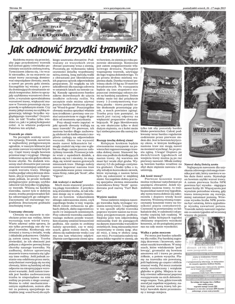 Strona 16 www.gazetagazeta.com poniedziałek-wtorek, 16 - 17 maja 2011 Porady ogrodnicze NIE TYLKO O TRAWNIKU Jana Ogrodnika www.janogrodnik.com Jak odnowić brzydki trawnik? Każdemu marzy się przecież, aby jego przydomowy trawnik był zawsze gęsty i równiutko porośnięty soczyście zieloną trawą. Tymczasem zdarza się, i to wcale nierzadko, że na murawie zamiast trawy zaczynają dominować niepożądane chwasty, mech, a nawet po prostu goła ziemia. Szczególnie tej wiosny z powodu dominujących nieustannie niskich temperatur, które to sprzyjały szybkiemu wzrostowi chwastów, a wyraźnie spowalniałemu wzrostowi trawy, większość muraw w Toronto prezentuje się naprawdę w opłakanym stanie. Czy mamy jakąś szansę na szybką regenerację takiego brzydko wyglądającego trawnika? Oczywiście, że tak! Trzeba tylko wiedzieć co, jak i w jakiej kolejności robić. A to właśnie podpowie Państwu ten artykuł... Trawnik po zimie Na początek oceńmy uczciwie sytuację. Trawnik, nawet ten w najbardziej pielęgnowanym ogrodzie, w naszym klimacie jest po zimie zawsze wyraźnie brzydszy. Część trawy mogła bowiem przemarznąć i wyginąć. Dlatego widoczne są na nim gołym okiem liczne ubytki. Na dodatek wiosenny start chwastów jest zawsze znacznie wcześniejszy aniżeli początek wzrostu trawy. Dlatego trzeba podjąć zdecydowane działanie, aby je wyniszczyć. Zapewniam jednak, że proste techniki pielęgnacyjne pomogą szybko odnowić ten brzydko wyglądający trawnik. Wiosną na każdym trawniku, nawet tym w dobrym stanie, trzeba przeprowadzić kilka odnawiających go zabiegów. Zaczynamy od starannego wygrabienia drucianymi grabiami zeschniętej trawy. Usuwamy chwasty Chwasty na murawie to niechciane przez nas rośliny, które wyrastają nam wśród trawy. Warto zdawać sobie sprawę, że nie tylko powodują one zły wygląd trawnika. Konkurują one również z trawą o światło, wodę i składniki pokarmowe. Osłabiają zatem samą trawę. Trzeba stwierdzić, że ich obecność jest jednym z objawów pewnej formy choroby naszego trawnika. Na zadbanej, dobrze uprawianej murawie trawa rozrasta się i głuszy inne rośliny. Jeśli jednak zostanie ona osłabiona przez mróz, natychmiast rozwijają się na niej chwasty, które są bardziej od niej odporne na niesprzyjające wzrostowi warunki. Jeśli zatem trawnik jest bardzo zachwaszczony trzeba te niepożądane na nim rośliny po prostu z niego usunąć. Można to robić mechanicznie ostrym szpikulcem, nożem albo też za pomocą specjalnego narzędzia (ang. weed hunt) do szyb- kiego usuwania chwastów. Podważany ze wszystkich stron chwast usuwamy wraz z ziemią. Pozostałą po wykonaniu takiej czynności dziurkę wypełniamy nową ziemią. Inną metodą walki z chwastami jest likwidowanie ich poprzez oprysk odpowiednim preparatem. Ze względu na ich szkodliwość dla naszego zdrowia w ostatnich latach na terenie całej Kanady ograniczono bardzo zakres dozwolonych do użycia środków ochrony roślin. Na szczęście stale można używać jeszcze bardzo skuteczny preparat "Weed-b-gone". Poszczególne chwasty można opryskać właśnie tym środkiem i powinny one zostać unicestwione w ciągu 48 godzin od momentu opryskania. Przy okazji warto zapytać: w jaki sposób chwasty trafiają na nasz trawnik? Po pierwsze, ich nasiona bardzo długo zachowują zdolność do kiełkowania i cierpliwie czekają na odpowiednie warunki. Okres ten wynosić może nawet kilkanaście lat mogły znaleźć się więc one w glebie na długo zanim jeszcze założyliśmy trawnik. Przenosi je także wiatr z sąsiednich działek, a zdarza się też i niestety, że znajdują się wśród nasion gotowych mieszanek traw. Dlatego należy zawsze kupować nasiona traw wyprodukowane przez renomowane firmy, takie jak "Scott", albo "Vigoro". Jak walczyć z mchem? Mech może stanowić prawdziwą plagę trawników. Z przykrością stwierdzić trzeba, że tak właśnie dzieje się w całym Ontario. Jest on bowiem wskaźnikiem silnego zakwaszenia ziemi, czyli zupełnego braku w niej wapnia. Mech rośnie zwłaszcza na glebach zbitych, słabo napowietrzonych i w miejscach ocienionych. Przy odnowie trawnika zaatakowanego mchem przede wszystkim musimy zmienić kwasowość podłoża. Ale zanim to zrobimy należy sprawdzić, czy w miejscach, gdzie rośnie mech, nie zbiera się nadmiernie woda i czy ma ona tam właściwy odpływ. Zbytnie zawilgocenie ziemi spra- wi bowiem, że ziemia po roku ponownie skwaśnieje. Konieczne jest zatem zorganizowanie właściwego drenażu. Następnie wapnujemy trawnik, używając do tego wapna dolomitowego. To po prostu drobno mielona wapienna skała. Dawka wynosić powinna około 10 kg na 10 metrów kwadratowych. Po rozsypaniu będzie się ono stopniowo rozpuszczać zmieniając odczyn ziemi na bardziej zasadowy. Dobre efekty może też dać przykrycie trawy 1-2-centymetrową warstwą piasku - trawa poradzi sobie doskonale przerastając piasek, a mech powinien zginąć. Trzeba przy tym pamiętać, że mech jest raczej odporny na większość preparatów chwastobójczych. W jego likwidowaniu są one skuteczne tylko w dość dużym stężeniu, co z kolei może tylko tak aby pozostały bardzo być niebezpieczne dla samej tra- blisko powierzchni. Całość podlewamy teraz bardzo regularnie wy. codziennie przez pierwsze siedem dni. Jest to bowiem krytyczRozsyp trochę dobrej ziemi Kolejnym krokiem będzie ny okres, w którym kiełkujące równomierne rozsypanie na po- nasiona traw nie mogą nawet wierzchni regenerowanego traw- na moment wyschnąć, bo po pronika dobrej ziemi. Stanowić bę- stu zginą. Uwaga! Dopiero po dzie ona podłoże do kiełkujących dwóch/trzech tygodniach od nasion trawy. Jej warstwa nie wzejścia trawy można ją po raz musi być wcale zbyt gruba. Wy- pierwszy nawozić. Młode rośliny starczy 0,5 do jednego centyme- są bowiem bardzo wrażliwe na tra grubości. Chodzi tylko o to, zbyt duże stężenie nawozu i ob