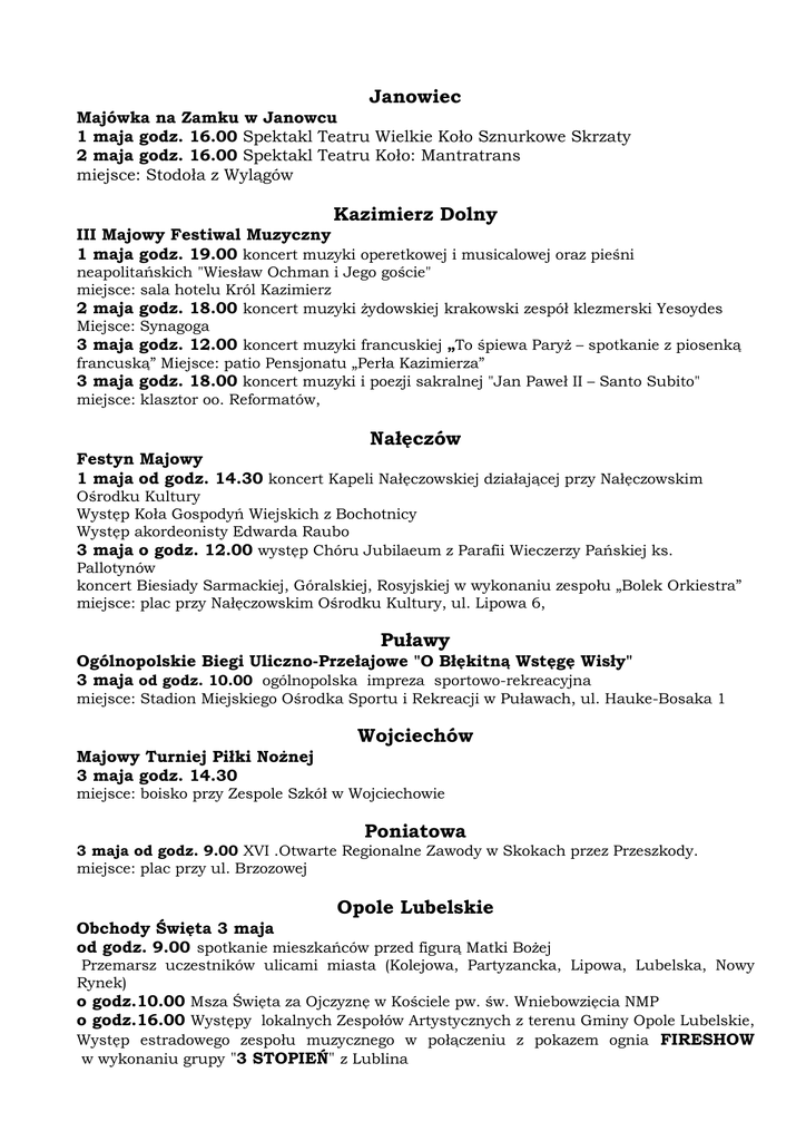 Janowiec Majówka na Zamku w Janowcu 1 maja godz. 16.00 Spektakl Teatru Wielkie Koło Sznurkowe Skrzaty 2 maja godz. 16.00 Spektakl Teatru Koło: Mantratrans miejsce: Stodoła z Wylągów Kazimierz Dolny III Majowy Festiwal Muzyczny 1 maja godz. 19.00 koncert muzyki operetkowej i musicalowej oraz pieśni neapolitańskich "Wiesław Ochman i Jego goście" miejsce: sala hotelu Król Kazimierz 2 maja godz. 18.00 koncert muzyki Ŝydowskiej krakowski zespół klezmerski Yesoydes Miejsce: Synagoga 3 maja godz. 12.00 koncert muzyki francuskiej „To śpiewa ParyŜ – spotkanie z piosenką francuską” Miejsce: patio Pensjonatu „Perła Kazimierza” 3 maja godz. 18.00 koncert muzyki i poezji sakralnej "Jan Paweł II – Santo Subito" miejsce: klasztor oo. Reformatów, Nałęczów Festyn Majowy 1 maja od godz. 14.30 koncert Kapeli Nałęczowskiej działającej przy Nałęczowskim Ośrodku Kultury Występ Koła Gospodyń Wiejskich z Bochotnicy Występ akordeonisty Edwarda Raubo 3 maja o godz. 12.00 występ Chóru Jubilaeum z Parafii Wieczerzy Pańskiej ks. Pallotynów koncert Biesiady Sarmackiej, Góralskiej, Rosyjskiej w wykonaniu zespołu „Bolek Orkiestra” miejsce: plac przy Nałęczowskim Ośrodku Kultury, ul. Lipowa 6, Puławy Ogólnopolskie Biegi Uliczno-Przełajowe "O Błękitną Wstęgę Wisły" 3 maja od godz. 10.00 ogólnopolska impreza sportowo-rekreacyjna miejsce: Stadion Miejskiego Ośrodka Sportu i Rekreacji w Puławach, ul. Hauke-Bosaka 1 Wojciechów Majowy Turniej Piłki NoŜnej 3 maja godz. 14.30 miejsce: boisko przy Zespole Szkół w Wojciechowie Poniatowa 3 maja od godz. 9.00 XVI .Otwarte Regionalne Zawody w Skokach przez Przeszkody. miejsce: plac przy ul. Brzozowej Opole Lubelskie Obchody Święta 3 maja od godz. 9.00 spotkanie mieszkańców przed figurą Matki BoŜej Przemarsz uczestników ulicami miasta (Kolejowa, Partyzancka, Lipowa, Lubelska, Nowy Rynek) o godz.10.00 Msza Święta za Ojczyznę w Kościele pw. św. Wniebowzięcia NMP o godz.16.00 Występy lokalnych Zespołów Artystycznych z terenu Gminy Opole Lubelskie, Występ estradowego zespołu muzycznego w połączeniu z pokazem ognia FIRESHOW w wykonaniu grupy "3 STOPIEŃ" z Lublina